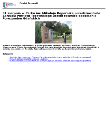 Powiat Tczewski 31 sierpnia w Parku im. Mikołaja Kopernika przedstawiciele Zarządu Powiatu Tczewskiego uczcili rocznicę podpisania Porozumień Gdańskich W Dniu Wolności i Solidarności w samo południe Starosta Tczewski Tadeusz Dzwonkowski, Wicestarosta Witold Sosnowski i Członek Zarządu Powiatu Tczewskiego Stanisław Smoliński w imieniu mieszkańców Powiatu Tczewskiego złożyli kwiaty pod pomnikiem Solidarności. Załączniki Starosta, Wicestarosta i Członek Zarządu przed złożeniem kwiatów.JPG [zdjęcie - pobierz] Pomnik Solidarności.JPG [zdjęcie - pobierz] Przedstawiciele Zarządu Powiatu Tczewskiego po złożeniu kwiatów.JPG [zdjęcie - pobierz] Powered by TCPDF (www.tcpdf.org)