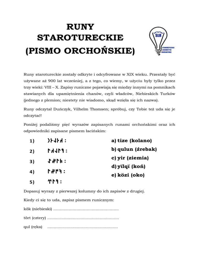 RUNY STAROTURECKIE (PISMO ORCHOŃSKIE) Runy starotureckie zostały odkryte i odcyfrowane w XIX wieku. Przestały być używane aż 900 lat wcześniej, a z tego, co wiemy, w użyciu były tylko przez trzy wieki: VIII – X. Zapisy runiczne pojawiają się między innymi na pomnikach stawianych dla upamiętnienia chanów, czyli władców, Niebieskich Turków (jednego z plemion; niestety nie wiadomo, skąd wzięła się ich nazwa). Runy odczytał Duńczyk, Vilhelm Thomsen; spróbuj, czy Tobie też uda się je odczytać! Poniżej podaliśmy pięć wyrazów zapisanych runami orchońskimi oraz ich odpowiedniki zapisane pismem łacińskim: 1) NULUQ a) tize (kolano) 2) iQLij b) qulun (źrebak) 3) azit 4) izuK 5) rij c) yir (ziemia) d) yïlqï (koń) e) közi (oko) Dopasuj wyrazy z pierwszej kolumny do ich zapisów z drugiej. Kiedy ci się to uda, zapisz pismem runicznym: kök (niebieski) ................................................... tört (cztery) ........................................................ qul (ręka) ....................................................... ODPOWIEDZI 1-b, 2-d, 3-a, 4-e, 5-c niebieski KuK cztery trut ręka LUQ