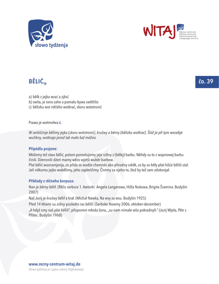 słowo tydźenja BĚLIĆip a) bělk z jejka wzać a zjěsć b) swita, je rano zahe a pomału bywa swětlišo c) bělizku wot něčeho wotkrać, skoru wotstronić Prawa je wotmołwa c. W serbšćinje bělimy jejka (skoru wotstronić), krušwy a běrny (bělizku wotkrać). Štóž je při tym wosebje wušikny, wotkraje jenož tak mało kaž móžno. Připódla prajene: Móžemy tež stwu bělić, potom pomolujemy jeje sćěny z (běłej) barbu. Něhdy su to z wapnowej barbu činili. Dźensniši dźeń mamy wězo wjetši wuběr barbow. Płat bělić woznamjenja, zo přida so wodźe chemiski abo přirodny srědk, zo by so běły płat hišće běliši stał. Jeli někomu jejko wobělimy, jeho zapleńčimy. Činimy za njeho to, štož by tež sam zdokonjał. Přikłady z rěčneho korpusa: Nan je běrny bělił. (Rěču serbsce 1. Awtorki: Angela Langerowa, Hilža Nukowa, Brigita Šramina. Budyšin 2007) Naš Jurij je krušwy bělił a krał. (Michał Nawka, Na wsy za wsu. Budyšin 1925) Před 14 lětami su sćěny posledni raz bělili. (Serbske Nowiny 2006, oktober-december) „A hdyž smy naš płat bělili“, přispomni młoda žona, „su nam nimale wšo pokradnyli.“ (Jurij Wjela, Pětr z Přišec. Budyšin 1968) www.recny-centrum-witaj.de Słowo tydźenja je z pjera Lubiny Hajdukoweje. čo. 39