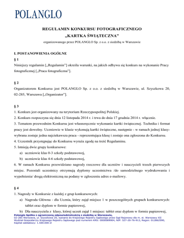 REGULAMIN KONKURSU FOTOGRAFICZNEGO „KARTKA ŚWIĄTECZNA” organizowanego przez POLANGLO Sp. z o.o. z siedzibą w Warszawie I. POSTANOWIENIA OGÓLNE §1 Niniejszy regulamin [„Regulamin”] określa warunki, na jakich odbywa się konkurs na wykonanie Pracy fotograficznej [„Praca fotograficzna”]. §2 Organizatorem Konkursu jest POLANGLO Sp. z o.o. z siedzibą w Warszawie, ul. Szyszkowa 20, 02-285, Warszawa [„Organizator”]. §3 1. Konkurs jest organizowany na terytorium Rzeczypospolitej Polskiej. 2. Konkurs rozpoczyna się dnia 12 listopada 2014 r. i trwa do dnia 17 grudnia 2014 r. włącznie. 3. Tematem przewodnim Konkursu jest własnoręcznie wykonanie kartki świątecznej. Technika i format pracy jest dowolny. Uczniowie w klasie wykonują kartki świąteczne, następnie - w ramach jednej klasywybrana zostaje jedna najciekawsza praca - reprezentująca klasę i zostaje ona zgłoszona do Konkursu. 4. Uczestnik przystępując do Konkursu wyraża zgodę na treść Regulaminu. 5. Istnieją dwie grupy konkursowe: a) uczniowie klas 0-3 szkoły podstawowej, b) uczniowie klas 4-6 szkoły podstawowej, 6. W ramach Konkursu przewidziano nagrody rzeczowe dla uczniów i nauczycieli trzech pierwszych miejsc. Pozostali uczestnicy otrzymują dyplomy uczestnictwa /do samodzielnego wydrukowania i wypełnienia/ drogą elektroniczną na podany w zgłoszeniu adres e-mailowy. §4 1. Nagrody w Konkursie z każdej z grup konkursowych: a) Nagroda Główna - dla Ucznia, który zajął miejsce 1 w poszczególnych grupach konkursowych: tablet oraz dyplom w formie papierowej, b) Dla nauczyciela z klasy, której uczeń zajął 1 miejsce: tablet oraz dyplom w formie papierowej, Polanglo Spółka z ograniczoną odpowiedzialnością z siedzibą w Warszawie, 02-285 Warszawa, ul. Szyszkowa 20, wpisana do Krajowego Rejestru Sądowego przez Sąd Rejonowy dla m. st. Warszawy XII Wydział Gospodarczy Krajowego Rejestru Sądowego pod numerem KRS: 0000089904, NIP: 527-20-76-913, Regon: 012862590, Kapitał zakładowy: 1.500.000 zł c) Dla wszystkich uczniów z klasy zwycięskiego Ucznia /który zajął 1 miejsce /: kamizelki odblaskowe, nagrody książkowe oraz puzzle. d) Dla laureatów 2 i 3 miejsca oraz uczniów ich klas: nagrody książkowe oraz puzzle. e) Dla wszystkich Uczestników Konkursu: dyplomy w formie elektronicznej, do samodzielnego wydrukowania i wypełnienia. 2. Nagrody składają się z nagrody rzeczowej opisanej powyżej oraz z nagrody pieniężnej w wysokości 11,11% wartości nagrody rzeczowej. Uczestnik Konkursu wyraża zgodę i upoważnia Organizatora Konkursu do potrącenia z wartości Nagrody, nagrody pieniężnej i przeznaczenie jej na uiszczenie należnego od uczestnika Konkursu zryczałtowanego podatku dochodowego z tytułu wygranej w Konkursie. II. UCZESTNICY KONKURSU I JEGO PRZEBIEG §5 1. Uczestnikami Konkursu [„Uczestnik”] mogą być uczniowie szkół podstawowych w klasach od 0-6. Z każdej klasy może być wyłoniona tylko jedna osoba reprezentująca klasę. Zgłoszenia na Konkurs w imieniu Grupy konkursowej dokonuje Nauczyciel uczący w tej klasie. Nauczyciel może zgłaszać do Konkursu wyłącznie uczniów, których uczy w Szkole Podstawowej, której dane zostały podane w formularzu zgłoszeniowym do niniejszego Konkursu. 2. Nauczyciel może zgłosić tylko 1 Ucznia reprezentującego klasę. Jedna klasa może być reprezentowana tylko przez 1 Ucznia. 3. Uczestnikami Konkursu ani uczestnikami głosowania internetowego nie mogą być pracownicy Organizatora, członkowie Jury, jak również osoby współpracujące z Organizatorem oraz członkowie najbliższej rodziny wyżej wskazanych pracowników, członków Jury i współpracowników. Uczestnikami konkursu nie mogą być nauczyciele nie pracujący w szkołach ani ich dzieci. 4. Polanglo zastrzega sobie możliwość weryfikacji, czy nauczyciel zgłaszający uczniów jest pracownikiem szkoły, którą wpisał w formularzu zgłoszeniowym. W przypadku niezgodności danych Polanglo zastrzega sobie prawo do dyskwalifikacji nauczyciela i zgłoszonych uczniów z konkursu. Polanglo Spółka z ograniczoną odpowiedzialnością z siedzibą w Warszawie, 02-285 Warszawa, ul. Szyszkowa 20, wpisana do Krajowego Rejestru Sądowego przez Sąd Rejonowy dla m. st. Warszawy XII Wydział Gospodarczy Krajowego Rejestru Sądowego pod numerem KRS: 0000089904, NIP: 527-20-76-913, Regon: 012862590, Kapitał zakładowy: 1.500.000 zł §6 Każdy nauczyciel może przesłać tylko 1 zdjęcie przedstawiające 1 kartkę świąteczną wykonaną własnoręcznie, techniką dowolną przez ucznia, które reprezentuje całą klasę. Zdjęcie musi spełniać następujące warunki formalne: a) zdjęcie cyfrowe w formacie: jpg, tiff, pdf, psd; b) rozmiar: nie mniejszy niż 480 x 318 pixeli. §7 1. Zgłaszającym zdjęcie Ucznia reprezentującego klasę jest nauczyciel [„Nauczyciel”], który jednocześnie w momencie przesłania Zgłoszenia konkursowego [„Zgłoszenie konkursowe”] oświadcza, iż jest upoważniony do reprezentowania Ucznia. 2. Formularz zgłoszeniowy dostępny będzie na stronie www.polanglo.pl oraz www.konkursy.polanglo.pl od 12 listopada. 3. Zgłoszenie konkursowe powinno zawierać - oprócz Pracy fotograficznej – wypełniony formularz zgłoszeniowy, a w nim: a) dane osobowe Ucznia reprezentującego klasę (imię, nazwisko, klasa, wiek) oraz dane osobowe nauczyciela wraz ze zgodą na ich przetwarzanie; b) dokładny adres szkoły podstawowej skąd pochodzi Uczeń reprezentujący klasę. c) ilość uczniów w klasie, która jest reprezentowana przez zgłaszanego do Konkursu Ucznia. 4. Zgłoszenie konkursowe musi być podpisane przez Nauczyciela. 5. Zgłoszenie konkursowe (tj. Zdjęcie wraz z wypełnionym formularzem zgłoszeniowym do konkursu) powinno być przesłane mailem (na adres: [email protected]) do dnia 17 grudnia 2014 r. do godziny 00.00 lub pocztą tradycyjną na adres ul. Szyszkowa 20, 02-285 Warszawa. Załącznik do emaila nie powinien