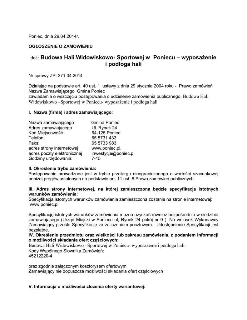 Poniec, dnia 29.04.2014r. OGŁOSZENIE O ZAMÓWIENIU dot.: Budowa Hali Widowiskowo- Sportowej w Poniecu – wyposażenie i podłoga hali Nr sprawy ZPI 271.04.2014 Działając na podstawie art. 40 ust. 1 ustawy z dnia 29 stycznia 2004 roku - Prawo zamówień Nazwa Zamawiającego Gmina Poniec zawiadamia o wszczęciu postępowania o udzielenie zamówienia publicznego. Budowa Hali Widowiskowo –Sportowej w Poniecu- wyposażenie i podłoga hali I. Nazwa (firma) i adres zamawiającego: Nazwa zamawiającego Adres zamawiającego Kod Miejscowość Telefon: Faks: adres strony internetowej adres poczty elektronicznej Godziny urzędowania: Gmina Poniec Ul. Rynek 24 64-125 Poniec 65 5731 433 65 5733 983 www.poniec.pl. [email protected] 7-15 II. Określenie trybu zamówienia: Postępowanie prowadzone jest w trybie przetargu nieograniczonego o wartości szacunkowej poniżej progów ustalonych na podstawie art. 11 ust. 8 Prawa zamówień publicznych. III. Adres strony internetowej, na której zamieszczona będzie specyfikacja istotnych warunków zamówienia: Specyfikacja istotnych warunków zamówienia zamieszczona zostanie na stronie internetowej: www.poniec.pl Specyfikację istotnych warunków zamówienia można uzyskać również bezpośrednio w siedzibie zamawiającego (Urząd Miejski w Poniecu ul, Rynek 24 pokój nr 9 ). Na wniosek Wykonawcy Zamawiający prześle Specyfikację za zaliczeniem pocztowym. Udostępnienie Specyfikacji jest bezpłatne. IV. Określenie przedmiotu oraz wielkości lub zakresu zamówienia, z podaniem informacji o możliwości składania ofert częściowych: Budowa Hali Widowiskowo –Sportowej w Poniecu- wyposażenie i podłoga hali. Kody Wspólnego Słownika Zamówień: 45212220-4 oraz zgodnie załączonym kosztorysem ofertowym Zamawiający nie dopuszcza możliwości składania ofert częściowych V. Informacja o możliwości złożenia oferty wariantowej: zamawiający nie dopuszcza składania ofert wariantowych VI. Termin wykonania zamówienia: 30 kwietnie 2015r.- 30 października 2015r. VII. Warunki udziału w postępowaniu oraz opis sposobu dokonywania oceny spełniania tych warunków: 1. O udzielenie niniejszego zamówienia mogą ubiegać się wykonawcy, którzy spełniają warunki, dotyczące: 1. posiadania uprawnień do wykonywania określonej działalności lub czynności, 2) posiadania wiedzy i doświadczenia, wymagane jest wykazanie przez Wykonawcę realizacji co najmniej 5 robót budowlanych okresie ostatnich pięciu lat przed upływem terminu składania ofert, a jeżeli okres prowadzenia działalności jest krótszy - w tym okresie. 3) dysponowania odpowiednim potencjałem technicznym oraz osobami zdolnymi do wykonania zamówienia, uszczegółowienie – kierownik budowy winien posiadać doświadczenie i uprawnienia 4) sytuacji ekonomicznej i finansowej, wymagane jest wykazanie przez Wykonawcę -opis wymagań w zakresie sytuacji ekonomicznej. Dysponowanie środkami do wykonania zadania. 2. Wykonawcy, którzy nie wykażą spełnienia warunków udziału w postępowaniu podlegać będą wykluczeniu z udziału w postępowaniu. Ofertę wykonawcy wykluczonego uznaje się za odrzuconą. 3. Z udziału w niniejszym postępowaniu wyklucza się wykonawców, którzy podlegają wykluczeniu na podstawie art. 24 ust. 1 i 2 Prawa zamówień publicznych. 4. Ocena spełnienia warunków udziału w postępowaniu dokonywana będzie w oparciu o dokumenty złożone przez wykonawcę w niniejszym postępowaniu metodą warunku granicznego - spełnia/niespełna. VIII. Informacja na temat wadium: zamawiający wymaga wniesienia wadium w kwocie 10.000,- zł IX. Kryteria oceny ofert i ich znaczenie: Lp. 1 Nazwa kryterium cena Waga 100 X. Miejsce i termin składania ofert: Oferty należy składać do dnia: 15 maja 2014r.do godz. 10 :00 w siedzibie zamawiającego Urząd Miejski ul. Rynek 24 64-125 Poniec Pokój nr 3 (sekretariat) XI. Miejsce i termin otwarcia ofert: Oferty zostaną otwarte dnia: 14 maja 2014r. o godz. 10 : 15 w siedzibie zamawiającego Urząd Miejski ul, Rynek 24 64-125 Poniec Pokój nr 7 XII. Termin związania ofertą Wykonawca pozostaje związany ofertą przez okres 30 dni. Bieg terminu związania ofertą rozpoczyna się wraz z upływem terminu składania ofert. XIII. Informacje o zamiarze zawarcia umowy Zmiany postanowień zawartej umowy w stosunku do treści oferty, na podstawie której dokonano wyboru wykonawcy , chyba że konieczność wprowadzenia takich zmian wynika z okoliczności, których nie można było przewidzieć w chwili zawarcia umowy, lub zmiany te są korzystne dla zamawiającego XIV. Informacje o zamiarze ustanowienia dynamicznego systemu zakupów wraz z adresem strony internetowej, na której będą zamieszczane dodatkowe informacje dotyczące dynamicznego systemu zakupów nie dotyczy XV. Informacje o przewidywanym wyborze najkorzystniejszej oferty z zastosowaniem aukcji elektronicznej wraz z adresem strony internetowej, na której będzie prowadzona aukcja elektroniczna nie dotyczy XVI. Przewidywane zamówienia uzupełniające: zamawiający nie dopuszcza możliwości udzielenia zamówień uzupełniających. XVI. Termin zamieszczenia ogłoszenia o zamówieniu w BZP: Ogłoszenie o zamówieniu zostało zamieszczone w Biuletynie Zamówień Publicznych nr 144346 Data zamieszczenia 29.04.2014r. ____________________________________ Kierownik Zamawiającego