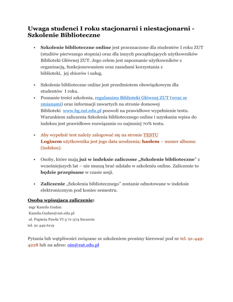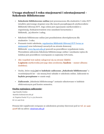 Uwaga studenci I roku stacjonarni i niestacjonarni Szkolenie Biblioteczne Szkolenie biblioteczne online jest przeznaczone dla studentów I roku ZUT (studiów pierwszego stopnia) oraz dla innych początkujących użytkowników Biblioteki Głównej ZUT. Jego celem jest zapoznanie użytkowników z organizacją, funkcjonowaniem oraz zasadami korzystania z biblioteki, jej zbiorów i usług. Szkolenie biblioteczne online jest przedmiotem obowiązkowym dla studentów I roku. Poznanie treści szkolenia, regulaminu Biblioteki Głównej ZUT (wraz ze zmianami) oraz informacji zawartych na stronie domowej Biblioteki www.bg.zut.edu.pl pozwoli na prawidłowe wypełnienie testu. Warunkiem zaliczenia Szkolenia bibliotecznego online i uzyskania wpisu do indeksu jest prawidłowe rozwiązanie co najmniej 70% testu. Aby wypełnić test należy zalogować się na stronie TESTU Loginem użytkownika jest jego data urodzenia; hasłem – numer albumu (indeksu). Osoby, które mają już w indeksie zaliczone „Szkolenie biblioteczne” z wcześniejszych lat – nie muszą brać udziału w szkoleniu online. Zaliczenie to będzie przepisane w czasie sesji. Zaliczenie „Szkolenia bibliotecznego” zostanie odnotowane w indeksie elektronicznym pod koniec semestru. Osoba wpisujaca zaliczenie: mgr Kamila Gudan [email protected] ul. Papieża Pawła VI 3 71-374 Szczecin tel. 91 449 6119 Pytania lub wątpliwości związane ze szkoleniem prosimy kierować pod nr tel. 91-4494228 lub na adres: [email protected]
