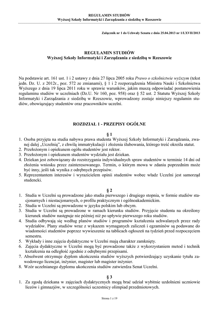 REGULAMIN STUDIÓW Wyższej Szkoły Informatyki i Zarządzania z siedzibą w Rzeszowie Załącznik nr 1 do Uchwały Senatu z dnia 25.04.2013 nr 1/LXVII/2013 REGULAMIN STUDIÓW Wyższej Szkoły Informatyki i Zarządzania z siedzibą w Rzeszowie Na podstawie art. 161 ust. 1 i 2 ustawy z dnia 27 lipca 2005 roku Prawo o szkolnictwie wyższym (tekst jedn. Dz. U. z 2012r., poz. 572 ze zmianami), § 1 i 2 rozporządzenia Ministra Nauki i Szkolnictwa Wyższego z dnia 19 lipca 2011 roku w sprawie warunków, jakim muszą odpowiadać postanowienia regulaminu studiów w uczelniach (Dz.U. Nr 160, poz. 958) oraz § 52 ust. 2 Statutu Wyższej Szkoły Informatyki i Zarządzania z siedzibą w Rzeszowie, wprowadzony zostaje niniejszy regulamin studiów, obowiązujący studentów oraz pracowników uczelni. ROZDZIAŁ 1 - PRZEPISY OGÓLNE 1. 2. 3. 4. 5. 1. 2. 3. 4. 5. 6. 7. 8. §1 Osoba przyjęta na studia nabywa prawa studenta Wyższej Szkoły Informatyki i Zarządzania, zwanej dalej „Uczelnią”, z chwilą immatrykulacji i złożenia ślubowania, którego treść określa statut. Przełożonym i opiekunem ogółu studentów jest rektor. Przełożonym i opiekunem studentów wydziału jest dziekan. Dziekan jest zobowiązany do rozstrzygania indywidualnych spraw studentów w terminie 14 dni od złożenia wniosku przez zainteresowanego. Termin, o którym mowa w zdaniu poprzednim może być inny, jeśli tak wynika z odrębnych przepisów. Reprezentantem interesów i wyrazicielem opinii studentów wobec władz Uczelni jest samorząd studencki. §2 Studia w Uczelni są prowadzone jako studia pierwszego i drugiego stopnia, w formie studiów stacjonarnych i niestacjonarnych, o profilu praktycznym i ogólnoakademickim. Studia w Uczelni są prowadzone w języku polskim lub obcym. Studia w Uczelni są prowadzone w ramach kierunku studiów. Przyjęcie studenta na określony kierunek studiów następuje nie później niż po upływie pierwszego roku studiów. Studia odbywają się według planów studiów i programów kształcenia uchwalanych przez rady wydziałów. Plany studiów wraz z wykazem wymaganych zaliczeń i egzaminów są podawane do wiadomości studentów poprzez wywieszenie na tablicach ogłoszeń na tydzień przed rozpoczęciem semestru. Wykłady i inne zajęcia dydaktyczne w Uczelni mają charakter zamknięty. Zajęcia dydaktyczne w Uczelni mogą być prowadzone także z wykorzystaniem metod i technik kształcenia na odległość zgodnie z odrębnymi przepisami. Absolwent otrzymuje dyplom ukończenia studiów wyższych potwierdzający uzyskanie tytułu zawodowego licencjat, inżynier, magister lub magister inżynier. Wzór uczelnianego dyplomu ukończenia studiów zatwierdza Senat Uczelni. §3 1. Za zgodą dziekana w zajęciach dydaktycznych mogą brać udział wybitnie uzdolnieni uczniowie liceów i gimnazjów, w szczególności uczestnicy olimpiad przedmiotowych. Strona 1 z 19 REGULAMIN STUDIÓW Wyższej Szkoły Informatyki i Zarządzania z siedzibą w Rzeszowie 2. Wyrażając zgodę na uczestnictwo uzdolnionego ucznia w zajęciach dydaktycznych dziekan określa przedmioty, w jakich uczeń może uczestniczyć oraz wyznacza mu opiekuna spośród nauczycieli akademickich. 3. Osoba, o której mowa w ust. 1, przystępuje do egzaminów i zaliczeń w terminach i na zasadach określonych dla grupy, w której zajęciach uczestniczy. Ocena następuje według skali ocen określonej w § 23. §4 Zasady odpłatności oraz wysokość opłat za studia określa rektor w regulaminie odpłatności za studia i inne formy kształcenia. §5 1. Do immatrykulacji i złożenia ślubowania przystępują kandydaci, którzy zostali przyjęci na studia oraz: a) wnieśli wpisowe, b) podpisali umowę o świadczenie usług edukacyjnych. 2. Po złożeniu ślubowania student otrzymuje elektroniczną legitymację studencką. §6 1. W przypadku studiów prowadzonych w języku polskim wybrane zajęcia dydaktyczne oraz sprawdziany wiedzy lub umiejętności dla danego kierunku, poziomu, formy i profilu kształcenia mogą być prowadzone w języku obcym. Rektor, w drodze decyzji, ustala listę zajęć oraz sprawdzianów wiedzy, które w danym semestrze są prowadzone w języku obcym. 2. Za zgodą dziekana student studiujący w języku polskim może realizować wybrane zajęcia dydaktyczne w języku obcym, o ile dane zajęcia są równolegle realizowane na studiach prowadzonych w języku obcym. W tym celu student powinien najpóźniej w ciągu 14 dni od rozpoczęcia nowego semestru złożyć do dziekana odpowiedni wniosek. §7 1. W terminie i na warunkach określonych przez dziekana student ma prawo dokonania wyboru: kierunku, specjalności, specjalizacji, przedmiotów do wyboru, promotora pracy dyplomowej, opiekuna grupy seminaryjnej. 2. Student, który zaliczył semestr, ma prawo dokonania zmiany kierunku, formy studiów, specjalności. W tym celu student powinien, najpóźniej w ciągu 14 dni od rozpoczęcia nowego semestru, złożyć do dziekana odpowiedni wniosek. Dziekan określa zakres i sposób uzupełnienia różnic programowych wyłącznie w zakresie przedmiotów, które są niezbędne dla osiągnięcia kierunkowych efektów kształcenia. Dziekan nie wyznacza różnicy programowej, jeśli efekty kształcenia przypisane do danego przedmiotu realizowane są także w ramach innego przedmiotu. 3. Student może się przenieść z innej szkoły wyższej, w tym także z zagranicznej szkoły wyższej, za zgodą dziekana wydziału przyjmującego, jeżeli wypełnił wszystkie obowiązki wynikające z przepisów obowiązujących w szkole wyższej, którą opuszcza. Dziekan określa zakres i sposób uzupełnienia różnic programowych wyłącznie w zakresie przedmiotów, które są niezbędne dla osiągnięcia kierunkowych efektów kształcenia. Dziekan nie wyznacza różnicy programowej, jeśli efekty kształcenia przypisane do danego przedmiotu realizowane są także w ramach innego przedmiotu. 4. Student może przenieść się do innej u