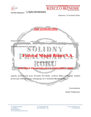 PATRON MEDIALNY: Katowice, 15 kwietnia 2010r. List gratulacyjny Szanowni Państwo, Miło mi poinformować, że firmie Federal Mogul Bimet S.A. został przyznany tytuł SOLIDNY PRACODAWCA POMORZA 2009 nagrody przyznawanej przez Kowalski Pro-Media, wydawcę Rzecz o Biznesie, dodatku promocyjno-informacyjnego, ukazującego się w dzienniku Rzeczpospolita. Z poważaniem, Zespół Redakcyjny Kowalski Pro-Media ul. 3 Maja 12 40-096 Katowice www.solidnypracodawca.pl tel. (0-32) 205 55 90 fax. (0-32) 206 11 86 e-mail: [email protected] www.kprom.pl