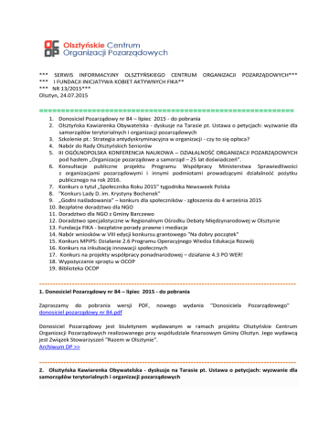 *** SERWIS INFORMACYJNY OLSZTYŃSKIEGO CENTRUM *** I FUNDACJI INICJATYWA KOBIET AKTYWNYCH FIKA** *** NR 13/2015*** Olsztyn, 24.07.2015 ORGANIZACJI POZARZĄDOWYCH*** ========================================================== 1. Donosiciel Pozarządowy nr 84 – lipiec 2015 - do pobrania 2. Olsztyńska Kawiarenka Obywatelska - dyskusje na Tarasie pt. Ustawa o petycjach: wyzwanie dla samorządów terytorialnych i organizacji pozarządowych 3. Szkolenie pt.: Strategia antydyskryminacyjna w organizacji - czy to się opłaca? 4. Nabór do Rady Olsztyńskich Seniorów 5. III OGÓLNOPOLSKA KONFERENCJA NAUKOWA – DZIAŁALNOŚĆ ORGANIZACJI POZARZĄDOWYCH pod hasłem „Organizacje pozarządowe a samorząd – 25 lat doświadczeń”. 6. Konsultacje publiczne projektu Programu Współpracy Ministerstwa Sprawiedliwości z organizacjami pozarządowymi i innymi podmiotami prowadzącymi działalność pożytku publicznego na rok 2016. 7. Konkurs o tytuł „Społecznika Roku 2015” tygodnika Newsweek Polska 8. "Konkurs Lady D. im. Krystyny Bochenek" 9. „Godni naśladowania” – konkurs dla społeczników - zgłoszenia do 4 września 2015 10. Bezpłatne doradztwo dla NGO 11. Doradztwo dla NGO z Gminy Barczewo 12. Doradztwo specjalistyczne w Regionalnym Ośrodku Debaty Międzynarodowej w Olsztynie 13. Fundacja FIKA - bezpłatne porady prawne i mediacje 14. Nabór wniosków w VIII edycji konkursu grantowego "Na dobry początek" 15. Konkurs MPiPS: Działanie 2.6 Programu Operacyjnego Wiedza Edukacja Rozwój 16. Konkurs na inkubację innowacji społecznych 17. Konkurs na projekty współpracy ponadnarodowej – działanie 4.3 PO WER! 18. Wypożyczanie sprzętu w OCOP 19. Biblioteka OCOP ----------------------------------------------------------------------------------------------1. Donosiciel Pozarządowy nr 84 – lipiec 2015 - do pobrania Zapraszamy do pobrania wersji donosiciel pozarządowy nr 84.pdf PDF, nowego wydania "Donosiciela Pozarządowego" Donosiciel Pozarządowy jest biuletynem wydawanym w ramach projektu Olsztyńskie Centrum Organizacji Pozarządowych realizowanego przy współudziale finansowym Gminy Olsztyn. Jego wydawcą jest Związek Stowarzyszeń "Razem w Olsztynie". Archiwum DP >> ----------------------------------------------------------------------------------------------2. Olsztyńska Kawiarenka Obywatelska - dyskusje na Tarasie pt. Ustawa o petycjach: wyzwanie dla samorządów terytorialnych i organizacji pozarządowych Czy wiecie, czym jest petycja? Czy jesteście przygotowani do jej złożenia lub rozpatrzenia? Czy wiecie, jakie wymogi nakłada ustawa na obywateli składających petycję i na samorządy w zakresie jej rozpatrzenia? Jeżeli nie, to zapraszamy na spotkanie prezentujące w przystępnej formie najważniejsze postanowienia ustawy o petycjach oraz wskazówki dotyczące tego, jak się przygotować do ich stosowania. 28 lipca 2015 roku, o godz. 16.30 w Olsztyńskim Centrum Organizacji Pozarządowych, ul. Tarasa Szewczenki 1. Zobacz więcej ----------------------------------------------------------------------------------------------3. Szkolenie pt.: Strategia antydyskryminacyjna w organizacji - czy to się opłaca? Związek Stowarzyszeń "Razem w Olsztynie" prowadzący Olsztyńskie Centrum Organizacji Pozarządowych zaprasza przedstawicielki i przedstawicieli organizacji pozarządowych na szkolenie pt.: Strategia antydyskryminacyjna w organizacji - czy to się opłaca? Termin: 29 lipca 2015 godz.09.30-12.30 Zapisy od: 2015-07-22 do: 2015-07-28 Zobacz więcej ----------------------------------------------------------------------------------------------4. Nabór do Rady Olsztyńskich Seniorów Kandydatów mających skończone 60 lat i poparcie instytucji albo organizacji działających na rzecz osób starszych lub co najmniej 20 osobowej grupy mieszkańców z tej samej grupy wiekowej, można zgłaszać osobiście składając właściwe formularze do Wydziału Zdrowia i Polityki Społecznej Urzędu Miasta Olsztyna ul. Knosały 3/5 pok. nr 15 lub Kancelarii Ogólnej Urzędu Miasta Olsztyna: Pl. Jana Pawła II 1 lub przesłać pocztą na powyższe adresy. do 31 lipca 2015 r. do godz. 15 - termin zgłaszania kandydatów do Rady Olsztyńskich Seniorów i do Komisji Wyborczej do 10 sierpnia 2015 r. do godz. 15 - termin zgłaszania kandydatów na Walne Zebranie 20 sierpnia 2015 r. godz. 16 – Wybory do Rady Olsztyńskich Seniorów. Zobacz więcej ----------------------------------------------------------------------------------------------5. III OGÓLNOPOLSKA KONFERENCJA NAUKOWA – DZIAŁALNOŚĆ ORGANIZACJI POZARZĄDOWYCH pod hasłem „Organizacje pozarządowe a samorząd – 25 lat doświadczeń”. Związek Stowarzyszeń "Razem w Olsztynie" przygotowuje kolejne wydarzenie na swoje 10 - lecie. W imieniu Rady Naukowej oraz Organizatorów, zapraszamy serdecznie na III OGÓLNOPOLSKĄ KONFERENCJĘ NAUKOWĄ – DZIAŁALNOŚĆ ORGANIZACJI POZARZĄDOWYCH pod hasłem „Organizacje pozarządowe a samorząd – 25 lat doświadczeń” Zobacz więcej ----------------------------------------------------------------------------------------------- 6. Konsultacje publiczne projektu Programu Współpracy Ministerstwa Sprawiedliwości z organizacjami pozarządowymi i innymi podmiotami prowadzącymi działalność pożytku publicznego na rok 2016. Departament Strategii i Funduszy Europejskich Ministerstwa Sprawiedliwości zaprasza do udziału w procesie konsultacji publicznych projektu Programu Współpracy Ministerstwa Sprawiedliwości z organizacjami pozarządowymi i innymi podmiotami prowadzącymi działalność pożytku publicznego na rok 2016. Uwagi można zgłaszać do dnia 17 sierpnia br. Zobacz więcej ----------------------------------------------------------------------------------------------7. Konkurs o tytuł „Społecznika Roku 2015” tygodnika Newsweek Polska Znasz osoby, które aktywnie i skutecznie działają na rzecz innych, na rzecz zmian w społeczności lokalnej l
