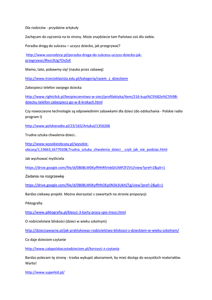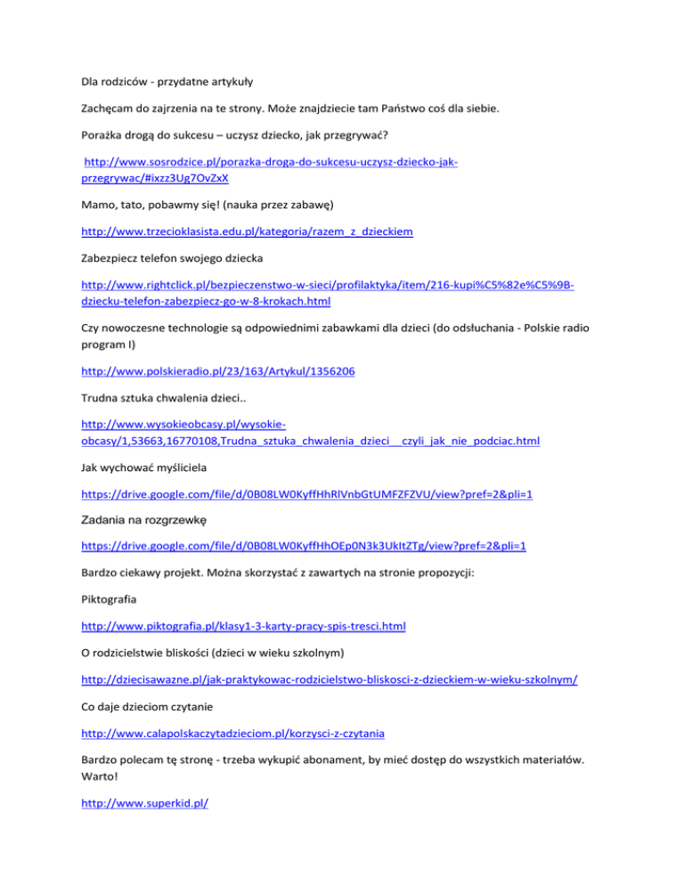 Dla rodziców - przydatne artykuły Zachęcam do zajrzenia na te strony. Może znajdziecie tam Państwo coś dla siebie. Porażka drogą do sukcesu – uczysz dziecko, jak przegrywać? http://www.sosrodzice.pl/porazka-droga-do-sukcesu-uczysz-dziecko-jakprzegrywac/#ixzz3Ug7OvZxX Mamo, tato, pobawmy się! (nauka przez zabawę) http://www.trzecioklasista.edu.pl/kategoria/razem_z_dzieckiem Zabezpiecz telefon swojego dziecka http://www.rightclick.pl/bezpieczenstwo-w-sieci/profilaktyka/item/216-kupi%C5%82e%C5%9Bdziecku-telefon-zabezpiecz-go-w-8-krokach.html Czy nowoczesne technologie są odpowiednimi zabawkami dla dzieci (do odsłuchania - Polskie radio program I) http://www.polskieradio.pl/23/163/Artykul/1356206 Trudna sztuka chwalenia dzieci.. http://www.wysokieobcasy.pl/wysokieobcasy/1,53663,16770108,Trudna_sztuka_chwalenia_dzieci__czyli_jak_nie_podciac.html Jak wychować myśliciela https://drive.google.com/file/d/0B08LW0KyffHhRlVnbGtUMFZFZVU/view?pref=2&pli=1 Zadania na rozgrzewkę https://drive.google.com/file/d/0B08LW0KyffHhOEp0N3k3UkItZTg/view?pref=2&pli=1 Bardzo ciekawy projekt. Można skorzystać z zawartych na stronie propozycji: Piktografia http://www.piktografia.pl/klasy1-3-karty-pracy-spis-tresci.html O rodzicielstwie bliskości (dzieci w wieku szkolnym) http://dziecisawazne.pl/jak-praktykowac-rodzicielstwo-bliskosci-z-dzieckiem-w-wieku-szkolnym/ Co daje dzieciom czytanie http://www.calapolskaczytadzieciom.pl/korzysci-z-czytania Bardzo polecam tę stronę - trzeba wykupić abonament, by mieć dostęp do wszystkich materiałów. Warto! http://www.superkid.pl/ Zamiast klapsa..... https://www.youtube.com/watch?v=B5DhGuWRJeY Jak zadbać o optymizm dziecka http://www.egodziecka.pl/Czytelnia/Emocje/Zadbaj-o-optymizm-swojego-dziecka.html O wychowaniu http://zuchpisze.pl/wychowujemy-przegranych/ Doskonała strona dla rodziców - a i nazwa brzmi znajomo "Świerszczyk" http://www.swierszczyk.pl/dla-rodzicow/ Motywowanie dzieci https://docs.google.com/presentation/d/1f8P76lhEDQ0vycpea1VQ4k7HGk_vzIQGgHH6epKKXm4/ht mlpresent?hl=pl Choć jestem zwolenniczką stosowania komputerów w edukacji, gorąco zachęcam także dzieci do innych form aktywności, w tym bardzo ważnej aktywności fizycznej. O jej znaczeniu można przeczytać w tym artykule. http://wyborcza.pl/mlodziodwagi/1,128591,13613753,Dziecinstwo_w_czterech_scianach__Co_zami ast_komputera.html Jak kochać i wymagać? https://drive.google.com/file/d/0B08LW0KyffHhY2JQVkF3VXdXaTQ/edit?pref=2&pli=1 Ćwiczymy z dzieckiem koncentrację http://miastodzieci.pl/dla_rodzicow/164:/2619:cwiczmy-z-dzieckiem-koncentracje-cz-i Nie zostawiaj dziecka w sieci! http://wyborcza.pl/szkola20/1,106745,15576901,Nie_zostawiaj_dziecka_w_sieci.html Umieć przegrywać http://www.polskatimes.pl/artykul/27261,przegrac-zeby-wygrac,id,t.html?cookie=1