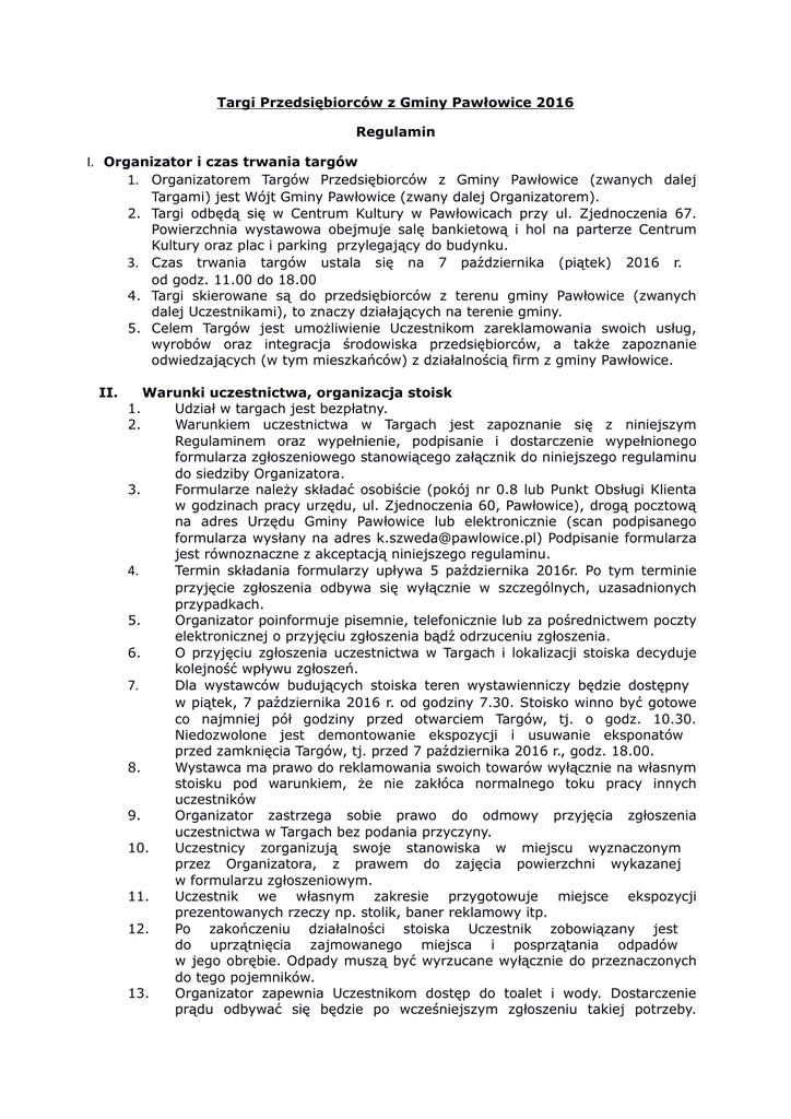 Targi Przedsiębiorców z Gminy Pawłowice 2016 Regulamin I