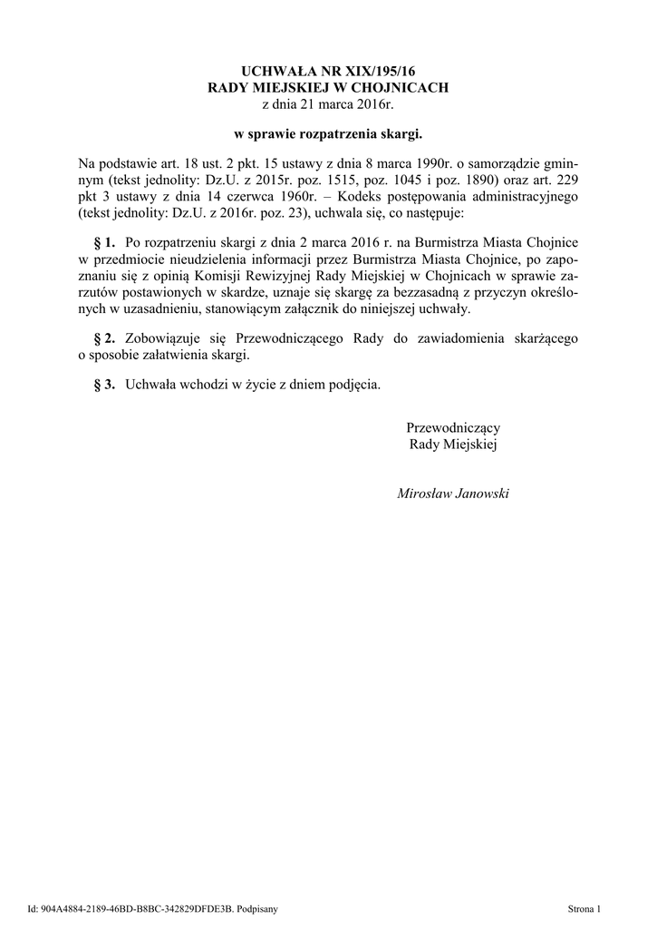 UCHWAŁA NR XIX/195/16 RADY MIEJSKIEJ W CHOJNICACH z dnia 21 marca 2016r. w sprawie rozpatrzenia skargi. Na podstawie art. 18 ust. 2 pkt. 15 ustawy z dnia 8 marca 1990r. o samorządzie gminnym (tekst jednolity: Dz.U. z 2015r. poz. 1515, poz. 1045 i poz. 1890) oraz art. 229 pkt 3 ustawy z dnia 14 czerwca 1960r. – Kodeks postępowania administracyjnego (tekst jednolity: Dz.U. z 2016r. poz. 23), uchwala się, co następuje: § 1. Po rozpatrzeniu skargi z dnia 2 marca 2016 r. na Burmistrza Miasta Chojnice w przedmiocie nieudzielenia informacji przez Burmistrza Miasta Chojnice, po zapoznaniu się z opinią Komisji Rewizyjnej Rady Miejskiej w Chojnicach w sprawie zarzutów postawionych w skardze, uznaje się skargę za bezzasadną z przyczyn określonych w uzasadnieniu, stanowiącym załącznik do niniejszej uchwały. § 2. Zobowiązuje się Przewodniczącego Rady do zawiadomienia skarżącego o sposobie załatwienia skargi. § 3. Uchwała wchodzi w życie z dniem podjęcia. Przewodniczący Rady Miejskiej Mirosław Janowski Id: 904A4884-2189-46BD-B8BC-342829DFDE3B. Podpisany Strona 1 Załącznik do Uchwały Nr XIX/195/16 Rady Miejskiej w Chojnicach z dnia 21 marca 2016r. UZASADNIENIE W dniu 3 marca 2016 r. do Rady Miejskiej w Chojnicach wpłynęła skarga na Burmistrza Miasta Chojnice, w której skarżący zarzucał mu nieudzielanie informacji publicznej, której domagał się pismem z dnia 17 lutego 2016 r. Informacja, której domagał się skarżący zawarta została w pytaniu „Czy Miasto Chojnice przystąpi do budowy/remontu ulic Willowej i Ludowej w Chojnicach?”. Jednocześnie skarżący wskazuje, iż na postawione przez niego pytanie otrzymał odpowiedz pismem z dnia 26 lutego 2016 r., w którym wskazano mu, iż informacja której się domaga nie stanowi informacji publicznej. Przewodniczący, celem zaopiniowania, skierował skargę do Komisji Rewizyjnej, która w wyniku zbadania zarzutów postawionych w skardze, posiłkując się przygotowaną opinią prawną, na posiedzeniu w dniu 10 marca 2016r. zaopiniowała skargę jako bezzasadną. Na wstępie należy wskazać, że materialnoprawną podstawą żądania, zawartego we wniosku złożonym przez skarżącego w dniu 17 lutego 2016 r., są przepisy ustawy z dnia 6 września 2001 r. o dostępie do informacji publicznej (Dz. U. Nr 112, poz. 1198, z późn. zm.). Powyższa ustawa służy bezspornie realizacji konstytucyjnego prawa obywateli do uzyskiwania wiedzy na temat działalności organów władzy publicznej i podmiotów wykonujących zadania publiczne, zagwarantowanego w art. 61 Konstytucji RP, stanowiąc element kontroli opinii publicznej nad ich działalnością. Pojęcie informacji publicznej określone zostało w art. 1 ust. 1 oraz w art. 6 ustawy o dostępie do informacji publicznej. Zgodnie z pierwszym z tych przepisów każda informacja o sprawach publicznych stanowi informację publiczną w rozumieniu ustawy i podlega udostępnieniu na zasadach i w trybie określonych w niniejszej ustawie. Natomiast art. 6 ust. 1 stanowi, że udostępnieniu podlega informacja publiczna, w szczególności o danych publicznych, w tym: treść i postać dokumentów urzędowych, w szczególności treść aktów administracyjnych i innych rozstrzygnięć (pkt 4 lit. a) oraz o zasadach funkcjonowania organów władzy publicznej, w tym o prowadzonych przez nie rejestrach, ewidencjach lub archiwach oraz o sposobach i zasadach udostępniania danych w nich zawartych (pkt 3 lit. f). Ponadto, w myśl art. 6 ust. 2, dokumentem urzędowym w rozumieniu ustawy jest treść oświadczenia woli lub wiedzy, utrwalona i podpisana w dowolnej formie przez funkcjonariusza publicznego w rozumieniu przepisów Kodeksu karnego, w ramach jego kompetencji, skierowana do innego podmiotu lub złożona do akt sprawy. Precyzując pojęcie informacji publicznej pod względem przedmiotowym należy uznać, że termin "informacja", jakim posłużył się ustawodawca, oznacza, że chodzi o opis rzeczywistości; o utrwalony komunikat, utrwaloną wiedzę, czyli określony stan istniejący na dzień udzielenia odpowiedzi (por. I. Kamińska, M. Rozbicka-Ostrowska "Ustawa o dostępie do informacji publicznej. Komentarz", Wyd. LexisNexis, Warszawa 2012, s. 14 oraz powołana tam literatura). W orzecznictwie sądowoadministracyjnym utrwalony jest pogląd, że informacją publiczną będzie każda wiadomość wytworzona lub odnoszona do władz publicznych, a także wytworzona lub odnoszona do innych podmiotów wykonujących funkcje publiczne w zakresie wykonywania przez nie zadań władzy publicznej i gospodarowania mieniem komunalnym lub mieniem Skarbu Państwa, o ile odnosi się do faktów (por. wyrok NSA z 25 marca 2003 r., II SA 4059/02, dostępny na stronie internetowej - Centralna Baza Orzeczeń Sądów Administracyjnych http://orzeczenia.nsa.gov.pl). Powyższe wywody uzasadniają stwierdzenie, że ustawa o dostępie do informacji publicznej znajduje zastosowanie wyłącznie w sytuacjach, gdy spełniony jest jej zakres podmiotowy i przedmiotowy, czyli istnieje informacja publiczna i podmiot zobowiązany do jej udzielenia. Natomiast o zakwalifikowaniu określonej informacji do podlegającej udostępnieniu w rozumieniu ustawy o dostępie do informacji publicznej decyduje kryterium rzeczowe, tj. treść i charakter informacji. Id: 904A4884-2189-46BD-B8BC-342829DFDE3B. Podpisany Strona 2 W okolicznościach niniejszej sprawy nie budzi wątpliwości, że organ administracji publicznej, jakim jest Burmistrz Miasta Chojnice, mieści się w zakresie podmiotowym stosowania ustawy o dostępie do informacji publicznej. W wyniku realizacji złożonego przez skarżącego wniosku o udostępnienie informacji publicznej, w którym wskazany został charakter i zakres żądanej informacji, organ ten jest zatem co do zasady podmiotem zobowiązanym do udostępnienia informacji, mającej charakter informacji publicznej, lecz co istotne, będącej w jego posiadaniu. W tym miejscu należy odwołać się 