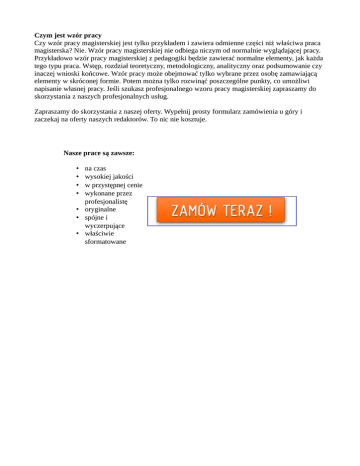 Czym jest wzór pracy Czy wzór pracy magisterskiej jest tylko przykładem i zawiera odmienne części niż właściwa praca magisterska? Nie. Wzór pracy magisterskiej nie odbiega niczym od normalnie wyglądającej pracy. Przykładowo wzór pracy magisterskiej z pedagogiki będzie zawierać normalne elementy, jak każda tego typu praca. Wstęp, rozdział teoretyczny, metodologiczny, analityczny oraz podsumowanie czy inaczej wnioski końcowe. Wzór pracy może obejmować tylko wybrane przez osobę zamawiającą elementy w skróconej formie. Potem można tylko rozwinąć poszczególne punkty, co umożliwi napisanie własnej pracy. Jeśli szukasz profesjonalnego wzoru pracy magisterskiej zapraszamy do skorzystania z naszych profesjonalnych usług. Zapraszamy do skorzystania z naszej oferty. Wypełnij prosty formularz zamówienia u góry i zaczekaj na oferty naszych redaktorów. To nic nie kosztuje. Nasze prace są zawsze: na czas wysokiej jakości w przystępnej cenie wykonane przez profesjonalistę • oryginalne • spójne i wyczerpujące • właściwie sformatowane • • • •