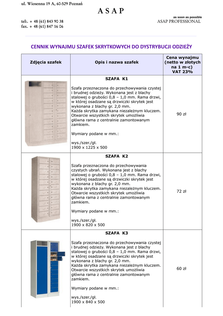 ul. Wiosenna 19 A, 60-529 Poznań ASAP as soon as possible tel:. + 48 (61) 843 90 38 fax. + 48 (61) 847 16 06 ASAP PROFESSIONAL CENNIK WYNAJMU SZAFEK SKRYTKOWYCH DO DYSTRYBUCJI ODZIEŻY Zdjęcia szafek Opis i nazwa szafek Cena wynajmu (netto w złotych na 1 m-c) VAT 23% SZAFA K1 Szafa przeznaczona do przechowywania czystej i brudnej odzieży. Wykonana jest z blachy stalowej o grubości 0,8 – 1,0 mm. Rama drzwi, w której osadzane są drzwiczki skrytek jest wykonana z blachy gr. 2,0 mm. Każda skrytka zamykana niezależnym kluczem. Otwarcie wszystkich skrytek umożliwia główna rama z centralnie zamontowanym zamkiem. 90 zł Wymiary podane w mm.: wys./szer./gł. 1900 x 1225 x 500 SZAFA K2 Szafa przeznaczona do przechowywania czystych ubrań. Wykonana jest z blachy stalowej o grubości 0,8 – 1,0 mm. Rama drzwi, w której osadzane są drzwiczki skrytek jest wykonana z blachy gr. 2,0 mm. Każda skrytka zamykana niezależnym kluczem. Otwarcie wszystkich skrytek umożliwia główna rama z centralnie zamontowanym zamkiem. 72 zł Wymiary podane w mm.: wys./szer./gł. 1900 x 820 x 500 SZAFA K3 Szafa przeznaczona do przechowywania czystej i brudnej odzieży. Wykonana jest z blachy stalowej o grubości 0,8 – 1,0 mm. Rama drzwi, w której osadzane są drzwiczki skrytek jest wykonana z blachy gr. 2,0 mm. Każda skrytka zamykana niezależnym kluczem. Otwarcie wszystkich skrytek umożliwia główna rama z centralnie zamontowanym zamkiem. Wymiary podane w mm.: wys./szer./gł. 1900 x 840 x 500 60 zł Zdjęcia szafek Opis i nazwa szafek Cena wynajmu (netto w złotych na 1 m-c) VAT 23% SZAFA K4 Szafa przeznaczona do przechowywania czystych ubrań. Wykonana jest z blachy stalowej o grubości 0,8 – 1,0 mm. Rama drzwi, w której osadzane są drzwiczki skrytek jest wykonana z blachy gr. 2,0 mm. Każda skrytka zamykana niezależnym kluczem. Otwarcie wszystkich skrytek umożliwia główna rama z centralnie zamontowanym zamkiem. 40 zł Wymiary podane w mm.: wys./szer./gł. 1900 x 435 x 500 SZAFA K5 Szafa przeznaczona do przechowywania brudnej odzieży. Wykonana jest z blachy stalowej o grubości 0,8 – 1,0 mm. Nad centralnie ryglowanymi drzwiami znajduje się skośna wrzutnia. Wewnątrz szafki umieszczony jest worek, do którego bezpośrednio trafiają brudne ubrania. Po otwarciu drzwi worek można bez problemu wyjąć i przekazać do pralni. 20 zł Wymiary podane w mm.: wys./szer./gł. 1900 x 425 x 500 Warunki dostawy szafek do Państwa firmy pozostają do uzgodnienia. W razie wszelkich ewentualnych pytań lub wątpliwości prosimy o kontakt: tel.: (061) 843 90 38 fax: (061) 847 16 06 tel: +48 602 134 131 tel: +48 665 950 700 e-mail: [email protected] e-mail: [email protected]