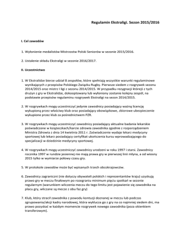 Regulamin Ekstraligi. Sezon 2015/2016 I. Cel zawodów 1. Wyłonienie medalistów Mistrzostw Polski Seniorów w sezonie 2015/2016. 2. Ustalenie składu Ekstraligi w sezonie 2016/2017. II. Uczestnictwo 1. W Ekstralidze bierze udział 8 zespołów, które spełniają wszystkie warunki regulaminowe wynikających z przepisów Polskiego Związku Rugby. Pierwsze siedem z rozgrywek sezonu 2014/2015 oraz mistrz I ligi z sezonu 2014/2015. W przypadku rezygnacji którejś z tych drużyn z gry w Ekstralidze, dokooptowany lub wyłoniony zostanie kolejny zespół, na podstawie przepisów regulaminu rozgrywek Ekstraligi na sezon 2014/2015. 2. W rozgrywkach mogą uczestniczyć jedynie zawodnicy posiadający ważną licencję wykupioną przez właściwy klub oraz posiadający obowiązkowe, zbiorowe ubezpieczenie wykupione przez klub za pośrednictwem PZR. 3. W rozgrywkach mogą uczestniczyć zawodnicy posiadający aktualne badania lekarskie poświadczone w książeczkach/karcie zdrowia zawodnika zgodnie z rozporządzeniem Ministra Zdrowia z dnia 14 kwietnia 2011 r. Zaświadczenie wydaje lekarz medycyny sportowej lub lekarz posiadający certyfikat ukończenia kursu wprowadzającego do specjalizacji w dziedzinie medycyny sportowej. 4. W rozgrywkach mogą uczestniczyć zawodnicy urodzeni w roku 1997 i starsi. Zawodnicy rocznika 1997 w rundzie jesiennej nie mają prawa gry w pierwszej linii młyna, a od wiosny 2015 tylko w wymiarze połowy czasu gry. 5. W protokole zawodów może być wpisanych trzech obcokrajowców. 6. Zawodnicy zagraniczni (nie dotyczy obywateli polskich i reprezentantów kraju) uzyskują prawo gry w meczu finałowym po rozegraniu minimum pięciu spotkań w sezonie regularnym (warunkiem wliczenia meczu do tego limitu jest pojawienie się zawodnika na placu gry, wliczane są mecze z obu faz gry) 7. Klub, który stracił zawodnika z powodu kontuzji doznanej w meczu lub podczas zgrupowania/akcji kadry narodowej, która wyklucza go z gry na co najmniej siedem dni, ma prawo pozyskać w każdym momencie rozgrywek nowego zawodnika (poza okienkiem transferowym). Zawodnika tego nie dotyczą następujące przepisy niniejszego regulaminu: - o konieczności rozegrania 5 meczów w sezonie zasadniczym, jeśli jest obcokrajowcem (rozdział II, punkt 6 regulaminu), by mógł grać w finale - o ograniczeniu do 3 obcokrajowców wpisanych do protokołu (rozdział II, punkt 5 regulaminu). Biuro PZR wydaje licencję nowemu zawodnikowi tylko po dostarczeniu przez zainteresowany klub wszystkich wymaganych dokumentów i zgód, w tym opinii lekarza kadry narodowej, która w sposób szczegółowy i nie budzący wątpliwości potwierdza wykluczenie z gry na co najmniej siedem dni kontuzjowanego kadrowicza. Zawodnik zgłoszony w miejsce kontuzjowanego kadrowicza może reprezentować dany klub do momentu powrotu do gry poszkodowanego podczas akcji kadry reprezentanta Polski. Dla nowego zawodnika należy wykupić dodatkową licencję. 8. Zawodnik uczestniczący w rozgrywkach centralnych (dotyczy także regionalnych rozgrywek juniorów oraz Pucharu Polski U’23), który rozegrał w spotkaniu więcej niż połowę czasu gry, musi mieć minimum 48 godzinną przerwę między występami na boisku. Zawodnicy, którzy wystąpili w meczu, ale w formacie nie większym niż połowa spotkania, mają prawo grać następnego dnia w wymiarze nie większym niż połowa czasu gry. 9. W protokole zawodów może być wpisanych 23 zawodników, w tym 6 przygotowanych do gry w pierwszej linii młyna. W takim wypadku można dokonać 8 zmian. W przypadku, gdy zespół nie ma 6 zawodników przygotowanych do gry w pierwszej linii młyna, limit zmian w meczu dla tego zespołu wynosi 7. III. System zawodów 1. Zawody rozgrywane są zgodnie z niniejszym regulaminem, terminarzem rozgrywek, przepisami gry, przepisami PZR oraz Regulaminem dyscyplinarnym PZR. 2. Rozgrywki odbywają się w cyklu jesień - wiosna. 3. System zawodów Ekstraligi: a) Pierwsza faza - wszystkie zespoły rozgrywają dwurundowy system każdy z każdym – mecz i rewanż, przy czym kolejność rozgrywania meczów w pierwszej fazie ustala się zgodnie z tabelą Bergera na podstawie klasyfikacji z poprzedniego sezonu, b) Druga faza 1. Na podstawie wyników z pierwszej fazy nastąpi podział na dwie grupy czterozespołowe. 2. Pierwsze cztery zespoły po rundzie jesiennej utworzą grupę walczącą o medale, kolejne cztery walczącą o miejsca 5-8. 3. Rywalizacja wewnątrz obu czterozespołowych grup toczy się dwurundowym systemem każdy z każdym (mecz i rewanż). Kolejność rozgrywania meczów w drugiej fazie ustala się zgodnie z tabelą Bergera, na podstawie klasyfikacji po pierwszej rundzie. 4. Przed rozpoczęciem drugiej fazy dorobek punktowy uzyskany przez poszczególne drużyny w pierwszej fazie zostanie podzielony przez dwa z zaokrągleniem wyniku w górę w przypadku dzielenia nieparzystej liczby punktów, c) Finały – drużyny, które zajęły w czołowej czwórce miejsca pierwsze i drugie po drugiej fazie rozgrywają jeden mecz finałowy. Drużyny, które zajęły miejsca trzecie i czwarte rozgrywają jeden mecz o brązowy medal (na boisku zespołu wyżej sklasyfikowanego), d) Zarząd PZR zastrzega sobie prawo wyboru gospodarza meczu finałowego o mistrzostwo Polski. W przypadku braku zadowalającej oferty dotyczącej organizacji meczu finałowego zespoły, które zakwalifikowały się do finału spotykają się w meczu o mistrzostwo Polski na boisku wyżej sklasyfikowanego po drugiej fazie rozgrywek, e) pozostałe zespoły zostają sklasyfikowane na miejscach 5-8 na podstawie wyników po zakończeniu drugiej fazy rozgrywek. Drużyna, która zajęła 8 miejsce spada do niższej klasy rozrywkowej, f) jeśli tego samego dnia w jednym mieście (dotyczy również Trójmiasta) odbywa się więcej niż jeden mecz rugby 15-osobowego seniorów, spotkania muszą rozpoczynać się z co najmniej 2,5 godzinną różnicą. W przypadku sporów decyzje o porze spotkań podejmuje