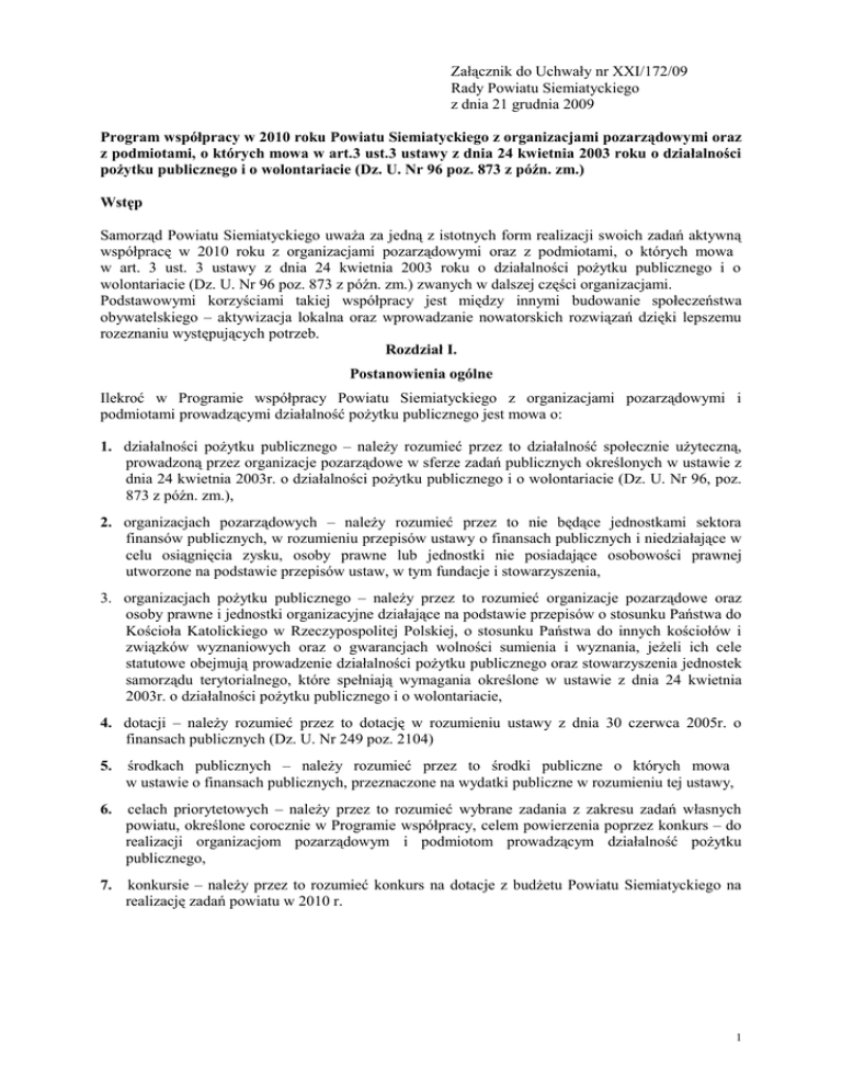 Załącznik do Uchwały nr XXI/172/09 Rady Powiatu Siemiatyckiego z dnia 21 grudnia 2009 Program współpracy w 2010 roku Powiatu Siemiatyckiego z organizacjami pozarządowymi oraz z podmiotami, o których mowa w art.3 ust.3 ustawy z dnia 24 kwietnia 2003 roku o działalności pożytku publicznego i o wolontariacie (Dz. U. Nr 96 poz. 873 z późn. zm.) Wstęp Samorząd Powiatu Siemiatyckiego uważa za jedną z istotnych form realizacji swoich zadań aktywną współpracę w 2010 roku z organizacjami pozarządowymi oraz z podmiotami, o których mowa w art. 3 ust. 3 ustawy z dnia 24 kwietnia 2003 roku o działalności pożytku publicznego i o wolontariacie (Dz. U. Nr 96 poz. 873 z późn. zm.) zwanych w dalszej części organizacjami. Podstawowymi korzyściami takiej współpracy jest między innymi budowanie społeczeństwa obywatelskiego – aktywizacja lokalna oraz wprowadzanie nowatorskich rozwiązań dzięki lepszemu rozeznaniu występujących potrzeb. Rozdział I. Postanowienia ogólne Ilekroć w Programie współpracy Powiatu Siemiatyckiego z organizacjami pozarządowymi i podmiotami prowadzącymi działalność pożytku publicznego jest mowa o: 1. działalności pożytku publicznego – należy rozumieć przez to działalność społecznie użyteczną, prowadzoną przez organizacje pozarządowe w sferze zadań publicznych określonych w ustawie z dnia 24 kwietnia 2003r. o działalności pożytku publicznego i o wolontariacie (Dz. U. Nr 96, poz. 873 z późn. zm.), 2. organizacjach pozarządowych – należy rozumieć przez to nie będące jednostkami sektora finansów publicznych, w rozumieniu przepisów ustawy o finansach publicznych i niedziałające w celu osiągnięcia zysku, osoby prawne lub jednostki nie posiadające osobowości prawnej utworzone na podstawie przepisów ustaw, w tym fundacje i stowarzyszenia, 3. organizacjach pożytku publicznego – należy przez to rozumieć organizacje pozarządowe oraz osoby prawne i jednostki organizacyjne działające na podstawie przepisów o stosunku Państwa do Kościoła Katolickiego w Rzeczypospolitej Polskiej, o stosunku Państwa do innych kościołów i związków wyznaniowych oraz o gwarancjach wolności sumienia i wyznania, jeżeli ich cele statutowe obejmują prowadzenie działalności pożytku publicznego oraz stowarzyszenia jednostek samorządu terytorialnego, które spełniają wymagania określone w ustawie z dnia 24 kwietnia 2003r. o działalności pożytku publicznego i o wolontariacie, 4. dotacji – należy rozumieć przez to dotację w rozumieniu ustawy z dnia 30 czerwca 2005r. o finansach publicznych (Dz. U. Nr 249 poz. 2104) 5. środkach publicznych – należy rozumieć przez to środki publiczne o których mowa w ustawie o finansach publicznych, przeznaczone na wydatki publiczne w rozumieniu tej ustawy, 6. celach priorytetowych – należy przez to rozumieć wybrane zadania z zakresu zadań własnych powiatu, określone corocznie w Programie współpracy, celem powierzenia poprzez konkurs – do realizacji organizacjom pozarządowym i podmiotom prowadzącym działalność pożytku publicznego, 7. konkursie – należy przez to rozumieć konkurs na dotacje z budżetu Powiatu Siemiatyckiego na realizację zadań powiatu w 2010 r. 1 Rozdział II. Cel programu Celem programu jest prowadzenie przez Powiat Siemiatycki działalności w sferze zadań publicznych powiatu określonych w art. 4 ustawy z dnia 5 czerwca 1998r. o samorządzie powiatowym (Dz. U. z 2001r. Nr 142 poz. 1592) oraz art. 4 ustawy z dnia 24 kwietnia 2003r. o działalności pożytku publicznego i o wolontariacie (Dz. U. Nr 96, poz. 873 z późn. zm.) we współpracy z organizacjami pozarządowymi i podmiotami wymienionymi w art. 3 ust. 3 tej samej ustawy, prowadzącymi odpowiednio do terytorialnego zakresu działania powiatu, działalność pożytku publicznego w zakresie odpowiadającym zadaniom powiatu. Współpraca odbywa się na zasadach: pomocniczości, suwerenności stron, partnerstwa, efektywności, uczciwej konkurencji i jawności. Adresaci programu Program adresowany jest do: 1) organizacji pozarządowych, 2) osób prawnych i jednostek organizacyjnych działających na podstawie przepisów o stosunku Państwa do Kościoła Katolickiego w Rzeczypospolitej Polskiej, o stosunku Państwa do innych kościołów i związków wyznaniowych oraz o gwarancjach wolności sumienia i wyznania, jeżeli ich cele statutowe obejmują prowadzenie działalności pożytku publicznego, 3) stowarzyszeń jednostek samorządu terytorialnego, prowadzących, odpowiednio do terytorialnego zakresu działania organów powiatu, działalność pożytku publicznego w zakresie odpowiadającym zadaniom tych organów. Realizatorzy programu W realizacji programu uczestniczą: 1. Rada Powiatu Siemiatyckiego, w zakresie wytyczania polityki społecznej i finansowej powiatu, 2. Zarząd Powiatu Siemiatyckiego, w zakresie realizacji polityki społecznej i finansowej powiatu wytyczonej przez Radę Powiatu Siemiatyckiego, 3. Komisja Konkursowa w zakresie przeprowadzania otwartego konkursu ofert na realizację zadań zleconych przez Powiat Siemiatycki organizacjom pozarządowym oraz podmiotom, o których mowa w art. 3 ust. 3 ustawy o działalności pożytku publicznego i o wolontariacie, 4. Naczelnicy wydziałów, samodzielne stanowiska pracy Starostwa Powiatowego w Siemiatyczach oraz jednostki organizacyjne powiatu w zakresie bieżącej współpracy z organizacjami pozarządowymi w ramach swoich kompetencji określonych regulaminowo lub statutowo, w tym konsultowania projektów aktów prawnych. Rozdział III. Zakres współpracy 1. Zlecenie realizacji zadań Powiatu Siemiatyckiego organizacjom obejmuje w pierwszej kolejności te zadania, które program corocznie określa jako zagadnienia priorytetowe. Zlecenie odbywa się po przeprowadzeniu otwartego konkursu ofert, chyba że przepisy odrębne przewidują inny tryb zlecania lub dane zadanie można zrealizować efektywniej w inny sposób,