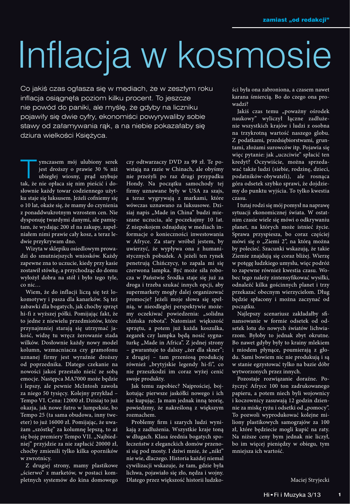 zamiast „od redakcji” ymczasem mój ulubiony serek jest droższy o prawie 30 % niż ubiegłej wiosny, prąd szybuje tak, że nie opłaca się nim pieścić i dosłownie każdy towar codziennego użytku staje się luksusem. Jeżeli cofniemy się o 10 lat, okaże się, że mamy do czynienia z ponaddwukrotnym wzrostem cen. Nie dysponuję twardymi danymi, ale pamiętam, że wydając 200 zł na zakupy, zapełniałem nimi prawie cały kosz, a teraz ledwie przykrywam dno. Wizyta w sklepiku osiedlowym prowadzi do smutniejszych wniosków. Każdy zapewne zna to uczucie, kiedy przy kasie zostawił stówkę, a przychodząc do domu wyłożył dobra na stół i było tego tyle, co nic… Wiem, że do inflacji liczą się też lokomotywy i pasza dla kanarków. Są też zabawki dla bogatych, jak choćby sprzęt hi-fi z wyższej półki. Pomijając fakt, że to jedne z niewielu przedmiotów, które przynajmniej starają się utrzymać jakość, widzę tu wręcz żerowanie stada wilków. Dosłownie każdy nowy model kolumn, wzmacniacza czy gramofonu uznanej firmy jest wyraźnie droższy od poprzednika. Dlatego czekanie na nowości jakoś przestało nieść ze sobą emocje. Następca MA7000 może będzie i lepszy, ale pewnie McIntosh zawoła za niego 50 tysięcy. Kolejny przykład – Tempo VI. Cena: 12000 zł. Dzisiaj to już okazja, jak nowe futro w lumpeksie, bo Tempo 25 (ta sama obudowa, inny tweeter) to już 16000 zł. Pomijając, że uważam „szóstkę” za kolumnę lepszą, to aż się boję premiery Tempo VII. „Najbiedniej” przyjdzie za nie zapłacić 20000 zł, choćby zmienili tylko kilka oporników w zwrotnicy. Z drugiej strony, mamy plastikowe „ścierwo” z marketów, w postaci kompletnych systemów do kina domowego czy odtwarzaczy DVD za 99 zł. Te powstają na razie w Chinach, ale obyśmy nie przeżyli po raz drugi przypadku Hondy. Na początku samochody tej firmy uznawane były w USA za szajs, a teraz wygrywają z markami, które wówczas uznawano za luksusowe. Dzisiaj napis „Made in China” budzi mieszane uczucia, ale poczekajmy 10 lat. Z niepokojem odnajduję w mediach informacje o konieczności inwestowania w Afryce. Za stary wróbel jestem, by uwierzyć, że wypływa ona z humanistycznych pobudek. A jeżeli ten rynek penetrują Chińczycy, to zapala mi się czerwona lampka. Być może siła robocza w Państwie Środka staje się już za droga i trzeba szukać innych opcji, aby supermarkety mogły dalej organizować promocje? Jeżeli moje słowa się spełnią, w nieodległej perspektywie możemy oczekiwać powiedzenia: „solidna chińska robota”. Natomiast większość sprzętu, a potem już każda koszulka, zegarek czy lampka będą nosić sygnaturkę „Made in Africa”. Z jednej strony – gwarantuje to dalszy „żer dla skner”; z drugiej – tam przeniosą produkcję również „brytyjskie legendy hi-fi”, co nie przeszkodzi im coraz wyżej cenić swoje produkty. Jak temu zapobiec? Najprościej, bojkotując pierwsze jaskółki nowego i ich nie kupując. Ja mam jednak inną teorię, powiedzmy, że nakreśloną z większym rozmachem. Problemy firm i szarych ludzi wynikają z zadłużenia. Wszystkie kraje toną w długach. Klasa średnia bogatych społeczeństw z eleganckich domów przenosi się pod mosty. I dziwi mnie, że „nikt” nie wie, dlaczego. Historia każdej niemal cywilizacji wskazuje, że tam, gdzie była lichwa, pojawiało się zło, nędza i wojny. Dlatego przez większość historii ludzko- ści była ona zabroniona, a czasem nawet karana śmiercią. Bo do czego ona prowadzi? Jakiś czas temu „poważny ośrodek naukowy” wyliczył łączne zadłużenie wszystkich krajów i ludzi z osobna na trzykrotną wartość naszego globu. Z podatkami, przedsiębiorstwami, gruntami, złożami surowców itp. Pojawia się więc pytanie: jak „uczciwie” spłacić ten kredyt? Oczywiście, można sprzedawać także ludzi (siebie, rodzinę, dzieci, podatników-obywateli), ale rosnąca góra odsetek szybko sprawi, że dojdziemy do punktu wyjścia. To tylko kwestia czasu. I tutaj rodzi się mój pomysł na naprawę sytuacji ekonomicznej świata. W ostatnim czasie wiele się mówi o odkrywaniu planet, na których może istnieć życie. Sprawa przyspiesza, bo coraz częściej mówi się o „Ziemi 2”, na którą można by polecieć. Szacunki wskazują, że takie Ziemie znajdują się coraz bliżej. Wierzę w potęgę ludzkiego umysłu, więc podróż to zapewne również kwestia czasu. Wobec tego należy zintensyfikować wysiłki, odnaleźć kilka gościnnych planet i trzy przekazać obecnym wierzycielom. Dług będzie spłacony i można zaczynać od początku. Najlepszy scenariusz zakładałby sfinansowanie w formie odsetek od odsetek lotu do nowych światów lichwiarzom. Byłoby to jednak zbyt okrutne. Bo nawet gdyby były to krainy mlekiem i miodem płynące, poumierają z głodu. Sami bowiem nic nie produkują i są w stanie egzystować tylko na bazie dóbr wytworzonych przez innych. Pozostaje rozwiązanie doraźne. Pożyczyć Afryce 100 ton zadrukowanego papieru, a potem niech byli wojownicy i koczownicy zasuwają 12 godzin dziennie za miskę ryżu i odsetki od „pomocy”. To pozwoli wyprodukować kolejne miliony plastikowych samograjów za 100 zł, które będziecie mogli kupić na raty. Na niższe ceny bym jednak nie liczył, bo im więcej pieniędzy w obiegu, tym mniejsza ich wartość. Maciej Stryjecki 1