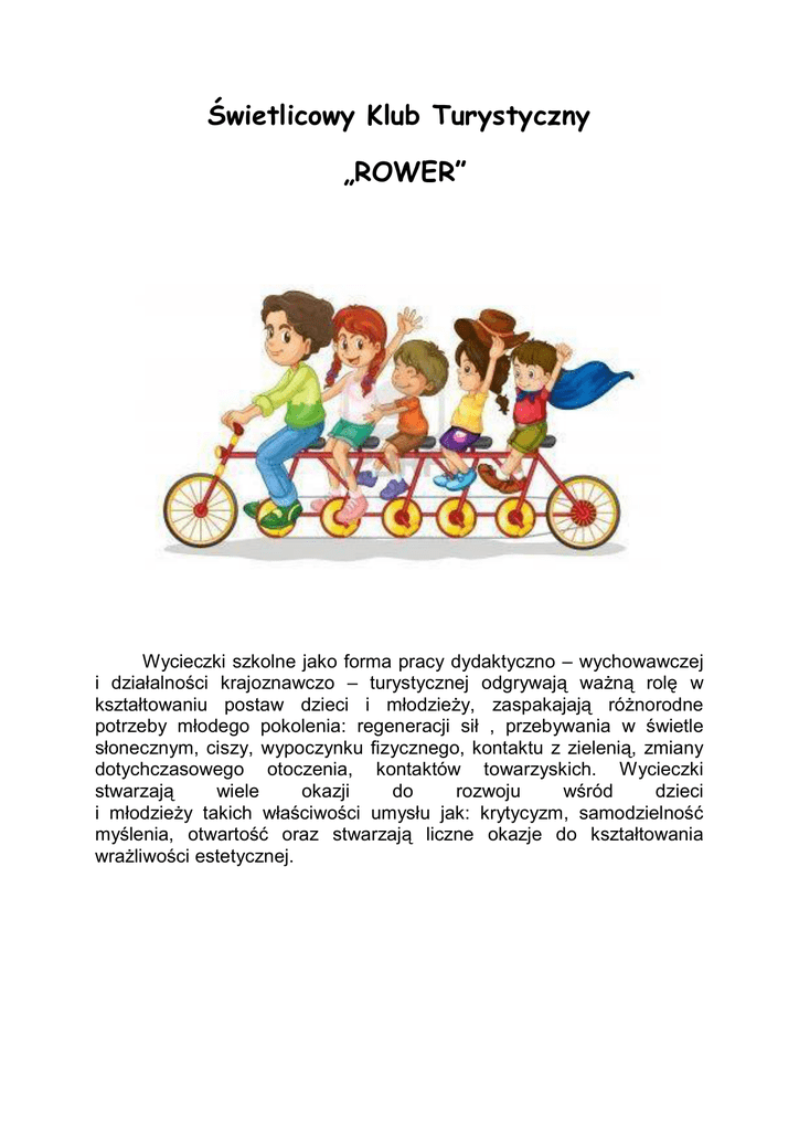 Świetlicowy Klub Turystyczny „ROWER” Wycieczki szkolne jako forma pracy dydaktyczno – wychowawczej i działalności krajoznawczo – turystycznej odgrywają ważną rolę w kształtowaniu postaw dzieci i młodzieży, zaspakajają różnorodne potrzeby młodego pokolenia: regeneracji sił , przebywania w świetle słonecznym, ciszy, wypoczynku fizycznego, kontaktu z zielenią, zmiany dotychczasowego otoczenia, kontaktów towarzyskich. Wycieczki stwarzają wiele okazji do rozwoju wśród dzieci i młodzieży takich właściwości umysłu jak: krytycyzm, samodzielność myślenia, otwartość oraz stwarzają liczne okazje do kształtowania wrażliwości estetycznej. Zajęcia odbywają się w piątki od 15.00-18.00 lub w soboty od 8.30. Cele poznawcze: - łączenie wiedzy zdobytej w szkole z praktyką - świadome ukierunkowanie wycieczek turystyczno – krajoznawczych na powtórzenie i pogłębienie wiedzy już posiadanej - umożliwienie uczniom samodzielnego sprawdzenia zdobycia wiedzy podczas zajęć praktycznych - rozwój zdolności obserwacyjnych i dostrzeganie zjawisk przyczynowo – skutkowych - kształtowanie nawyków prawidłowego wykorzystania środowiska geograficznego dla życia człowieka walorów - poznawanie sposobów aktywnego wypoczynku na świeżym powietrzu. Cele wychowawcze: - kształtowanie osobowości poprzez ukazywanie wartości wynikających z przebywania w świecie przyrody i kultury - zaspokojenie potrzeb kulturalnych, budowanie wrażliwości i poczucia piękna, dążenie do rozwoju emocjonalnego i estetycznego - kształtowanie emocjonalnych postaw przywiązania do kraju ojczystego, do dziedzictwa kulturowego własnego regionu - tworzenie postaw otwartych na współdziałanie w ramach grupy i kulturę bycia - zaangażowanie do poszczególnych zadań wybranych uczniów, wyrabianie w nich odpowiedzialności za przyjęte zobowiązania, wyrabianie konieczności działania na rzecz innych, wzmacniają się w ten sposób więzi koleżeńskie; uczniowie nieśmiali mają okazję do nawiązywania kontakty z rówieśnikami i dorosłymi oraz widzą potrzebę niesienia pomocy innym. Plan: 1. Wyjazd na rewię do Łodzi – Disney On Ice 2. Wyjazd o Krośnic – Zwiedzanie fabryki bombek oraz basen 3. Wyjazd do Milicza – Kreatywny Obiekt Multifunkcyjny – KOM 4. Wycieczki piesze, 5. Wycieczki rowerowe 6. Wyjazd do Milicza na lodowisko 7. Wyjazd do Górecznika 8. Wyjazd do Rudy Sułowskiej 9. Wyjazd do Kórnika – Rogalin 10. Wyjazd do Wrocławia – zwiedzanie miasta z przewodnikiem 11. Wyjazd do Poznania – Malta i pieczenie rogali 12. Wyjazd do Poznania – Malta oraz piekarnia XXI wiek Prowadzące: Jolanta Roszak Mirosława Płonka