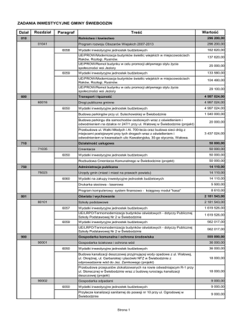 ZADANIA INWESTYCYJNE GMINY ŚWIEBODZIN Dział Rozdział Treść Paragraf 010 01041 6058 296 200,00 Program rozwoju Obszarów Wiejskich 2007-2013 296 200,00 Wydatki inwestycyjne jednostek budżetowych 162 620,00 UE/PROW/Modernizacja budynków świetlic wiejskich w miejscowościach Raków, Rozłogi, Rusinów. UE/PROW/Remot budynku w celu promocji aktywnego stylu życia społeczności wsi Jeziory 6059 60016 6050 UE/PROW/Modernizacja budynków świetlic wiejskich w miejscowościach Raków, Rozłogi, Rusinów. 104 480,00 6050 750 75023 6060 801 80101 6057 6059 900 90001 6050 90002 6050 29 100,00 Transport i łączność 4 997 024,00 Drogi publiczne gminne 4 997 024,00 Wydatki inwestycyjne jednostek budżetowych 4 997 024,00 Budowa parkingów przy ul. Sulechowskiej w Świebodzinie 1 540 000,00 Przebudowa ul. Walki Młodych i Al. 700-lecia oraz budowa sieci dróg z miejscami postojowymi przy tych drogach wraz z oświetleniem i odwodnieniem w kwareatach ulic Kawaleryjska, 30-go stycznia, Wałowa. 71035 25 000,00 133 580,00 Budowa parkingu dla samochodów osobowych wraz z oświetleniem i odwodnieniem na działce nr 247/1 przy ul. Wałowej w Świebodzinie (projekt) 710 137 620,00 Wydatki inwestycyjne jednostek budżetowych UE/PROW/Remot budynku w celu promocji aktywnego stylu życia społeczności wsi Jeziory 600 Wartość Rolnictwo i łowiectwo 20 000,00 3 437 024,00 Działalność usługowa 50 000,00 Cmentarze 50 000,00 Wydatki inwestycyjne jednostek budżetowych 50 000,00 Rozbudowa Cmentarza Komunalnego w Świebodzinie (projekt) 50 000,00 Administracja publiczna 14 110,00 Urzędy gmin (miast i miast na prawach powiatu) 14 110,00 Wydatki na zakupy inwestycyjne jednostek budżetowych 14 110,00 Drukarka sieciowa - laserowa 5 500,00 Program komputerowy: system finansowo - księgowy moduł "kasa" 8 610,00 Oświata i wychowanie 2 181 543,00 Szkoły podstawowe 2 181 543,00 Wydatki inwestycyjne jednostek budżetowych 1 619 526,00 UE/LRPO/Termomodernizacja budynków oświatowych - dotyczy Publicznej Szkoły Podstawowej Nr 2 w Świebodzinie 1 619 526,00 Wydatki inwestycyjne jednostek budżetowych 562 017,00 UE/LRPO/Termomodernizacja budynków oświatowych - dotyczy Publicznej Szkoły Podstawowej Nr 2 w Świebodzinie 562 017,00 Gospodarka komunalna i ochrona środowiska 555 000,00 Gospodarka ściekowa i ochrona wód 36 000,00 Wydatki inwestycyjne jednostek budżetowych 36 000,00 Budowa kanalizacji deszczowej przyjmującej wody opadowe z ul. Wałowej, ul. Okrężnej, ul. Garbarskiej i placówki NFZ w Świebodzinie z odprowadzenie wód do Jez. Zamkowego (projekt) 18 000,00 Przebudowa przepustów zlokalizowanych na rowie odwadniajacym R-1 przy ul. Słonecznej w Świebodzinie wraz z budową rurociagu kanalizacji deszczowej (projekt) 18 000,00 Gospodarka odpadami 9 000,00 Wydatki inwestycyjne jednostek budżetowych 9 000,00 Przyłacze kanalizacji sanitarnej do posesji nr 10 przy ul. Ogrodowej w Świebodzinie 9 000,00 Strona 1 90015 6050 6057 6059 90095 6050 Oświetlenie ulic, placów i dróg 370 000,00 Wydatki inwestycyjne jednostek budżetowych 100 000,00 Oświetlenie miejscowości Wilkowo i Rosin (projekt) 100 000,00 Wydatki inwestycyjne jednostek budżetowych 229 500,00 UE/EFRR/Podniesienie atrakcyjności inwestycyjnej działki nr 68/1 poprzez przygotowanie dokumentacji technicznej uzbrojenia terenu. 229 500,00 Wydatki inwestycyjne jednostek budżetowych 40 500,00 UE/EFRR/Podniesienie atrakcyjności inwestycyjnej działki nr 68/1 poprzez przygotowanie dokumentacji technicznej uzbrojenia terenu. 40 500,00 Pozostała działalność 140 000,00 Wydatki inwestycyjne jednostek budżetowych 140 000,00 Zagospodarowanie terenu części działki nr 444/44 przy ul. Sikorskiego 26 w Świebodzinie - projekt Zagospodarowanie terenu kwartału ulic: Średnia, Wałowa, 30-go stycznia, Plac Wolności w Świebodzinie - projekt Zagospodorowanie terenu kwartału ulic: Wałowa, Średnia, Piłsudskiego, Głogowska - dz. 252/74 w Świebodzinie - projekt 926 92601 6050 10 000,00 65 000,00 65 000,00 Kultura fizyczna 2 549 700,00 Obiekty sportowe 2 549 700,00 Wydatki inwestycyjne jednostek budżetowych 2 549 700,00 Budowa hali sportowej przy Publicznym Gimnazjum nr 3 2 549 700,00 Razem: Strona 2 10 643 577,00