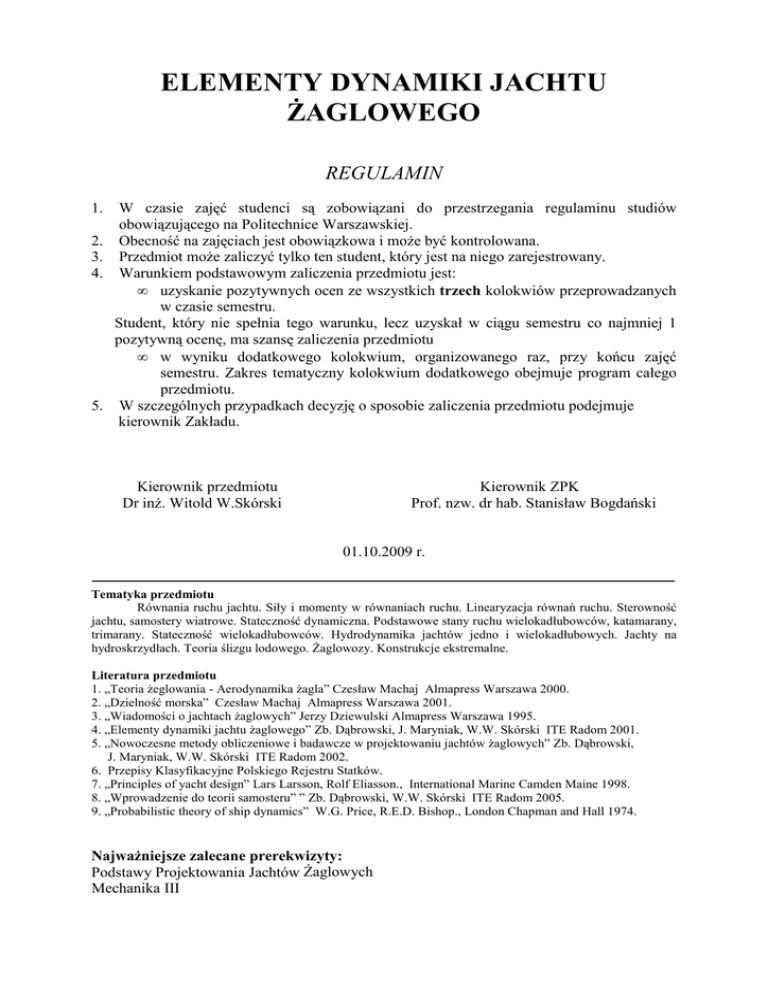 ELEMENTY DYNAMIKI JACHTU śAGLOWEGO REGULAMIN 1. 2. 3. 4. 5. W czasie zajęć studenci są zobowiązani do przestrzegania regulaminu studiów obowiązującego na Politechnice Warszawskiej. Obecność na zajęciach jest obowiązkowa i moŜe być kontrolowana. Przedmiot moŜe zaliczyć tylko ten student, który jest na niego zarejestrowany. Warunkiem podstawowym zaliczenia przedmiotu jest: • uzyskanie pozytywnych ocen ze wszystkich trzech kolokwiów przeprowadzanych w czasie semestru. Student, który nie spełnia tego warunku, lecz uzyskał w ciągu semestru co najmniej 1 pozytywną ocenę, ma szansę zaliczenia przedmiotu • w wyniku dodatkowego kolokwium, organizowanego raz, przy końcu zajęć semestru. Zakres tematyczny kolokwium dodatkowego obejmuje program całego przedmiotu. W szczególnych przypadkach decyzję o sposobie zaliczenia przedmiotu podejmuje kierownik Zakładu. Kierownik przedmiotu Dr inŜ. Witold W.Skórski Kierownik ZPK Prof. nzw. dr hab. Stanisław Bogdański 01.10.2009 r. Tematyka przedmiotu Równania ruchu jachtu. Siły i momenty w równaniach ruchu. Linearyzacja równań ruchu. Sterowność jachtu, samostery wiatrowe. Stateczność dynamiczna. Podstawowe stany ruchu wielokadłubowców, katamarany, trimarany. Stateczność wielokadłubowców. Hydrodynamika jachtów jedno i wielokadłubowych. Jachty na hydroskrzydłach. Teoria ślizgu lodowego. śaglowozy. Konstrukcje ekstremalne. Literatura przedmiotu 1. „Teoria Ŝeglowania - Aerodynamika Ŝagla” Czesław Machaj Almapress Warszawa 2000. 2. „Dzielność morska” Czesław Machaj Almapress Warszawa 2001. 3. „Wiadomości o jachtach Ŝaglowych” Jerzy Dziewulski Almapress Warszawa 1995. 4. „Elementy dynamiki jachtu Ŝaglowego” Zb. Dąbrowski, J. Maryniak, W.W. Skórski ITE Radom 2001. 5. „Nowoczesne metody obliczeniowe i badawcze w projektowaniu jachtów Ŝaglowych” Zb. Dąbrowski, J. Maryniak, W.W. Skórski ITE Radom 2002. 6. Przepisy Klasyfikacyjne Polskiego Rejestru Statków. 7. „Principles of yacht design” Lars Larsson, Rolf Eliasson., International Marine Camden Maine 1998. 8. „Wprowadzenie do teorii samosteru” ” Zb. Dąbrowski, W.W. Skórski ITE Radom 2005. 9. „Probabilistic theory of ship dynamics” W.G. Price, R.E.D. Bishop., London Chapman and Hall 1974. NajwaŜniejsze zalecane prerekwizyty: Podstawy Projektowania Jachtów śaglowych Mechanika III