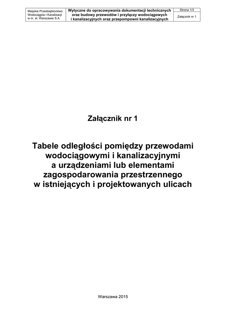 Miejskie Przedsiębiorstwo Wodociągów i Kanalizacji w m. st. Warszawie S.A. Wytyczne do opracowywania dokumentacji technicznych oraz budowy przewodów i przyłączy wodociągowych i kanalizacyjnych oraz przepompowni kanalizacyjnych Strona 1/3 Załącznik nr 1 Załącznik nr 1 Tabele odległości pomiędzy przewodami wodociągowymi i kanalizacyjnymi a urządzeniami lub elementami zagospodarowania przestrzennego w istniejących i projektowanych ulicach Warszawa 2015 Miejskie Przedsiębiorstwo Wodociągów i Kanalizacji w m. st. Warszawie S.A. Strona 2/3 Wytyczne do opracowywania dokumentacji technicznych oraz budowy przewodów i przyłączy wodociągowych i kanalizacyjnych oraz przepompowni kanalizacyjnych Załącznik nr 1 Tabela 1 linie zabudowy i budynki mieszkalne budynki inne stacje paliw tłocznie gazu, stacje gazowe - granice terenu krawężniki i krawędzie jezdni linie tramwajowe -oś toru niezelektryfikowane zelektryfikowane mosty i wiadukty wały p.pow. i uregulowane brzegi rzek 0,5 0,5 0,5 0,5 0,5 0,6 0,8 1,0 1,5 0,5 0,8 0,5 2,5 2,0 1,0 1,8 1,3 1,3 1,3 0,7 2,2 2,0 2,2 1,8 0,8 0,5 0,5 0,5 0,5 0,5 0,5 0,5 0,6 0,6 0,6 0,6 0,5 0,6 0,7 1,0 1,0 1,5 0,8 1,0 0,8 2,5 2,0 1,5 4,3 2,7 2,7 2,7 0,8 2,5 2,0 2,5 4,7 1,7 0,5 0,5 0,8 0,5 0,5 0,5 0,8 0,7 0,7 0,7 0,7 0,6 0,7 0,8 1,0 1,0 1,5 0,8 1,0 0,8 2,5 2,0 1,5 4,3 4,3 4,3 4,3 1,0 3,5 3,0 3,5 7,5 2,3 0,7 0,7 1,0 0,7 0,7 1,0 0,8 0,8 0,8 0,8 0,8 0,8 1,0 1,0 1,0 1,0 1,5 0,8 1,0 0,8 2,5 2,0 1,0 4,3 4,3 4,3 4,3 1,0 3,5 3,0 3,5 7,5 2,3 0,5 0,5 0,8 0,5 0,8 0,8 0,8 0,8 1,3 0,8 1,3 1,0 1,0 1,0 1,0 0,8 0,5 1,0 0,5 2,5 2,0 1,0 1,8 1,0 1,0 1,0 1,0 1,3 1,8 1,8 1,0 0,8 0,5 0,5 1,0 0,5 1,0 1,0 1,0 1,0 1,5 1,0 1,5 1,5 1,5 1,5 1,5 0,8 1,0 1,0 2,0 1,0 2,5 2,0 1,5 4,5 3,0 3,0 3,0 2,0 2,0 2,5 2,5 3,0 2,5 0,0 0,0 0,8 0,0 0,3 0,3 0,8 0,5 0,5 0,5 0,5 0,5 0,8 0,8 0,8 0,5 1,0 1,0 1,0 1,0 2,5 2,0 0,0 2,0 2,0 2,0 2,0 2,0 2,5 5,0 5,0 0,5 2,0 kable ziemne słupy pow. 1kV do 1kV do 100 mm pow. 100 mm - . Uwagi: 1) odległości podane są w metrach od krawędzi urządzeń; 2) tabela powstała na podstawie "Wytycznych projektowania sieci uzbrojenia podziemnego i nadziemnego na obszarze m. st. Warszawy i WSW", opracowanych przez Zespół Doradczy ds. procesu inwestycyjnego, funkcjonujący w Urzędzie m. st. Warszawy. istniejące 0,5 pow. 100 mm projektowane 0,5 do 100 mm nadziemne 0,5 średniego podziemne 0,5 niskiego drenaż 0,5 słupy 0,5 szczelna 0,5 kable zwykła 0,5 magistralne magistralne magistralne rozdzielcze pow. 250 mm do 1000 mm do 250 mm 1000 mm 500 mm linie rozgraniczające i trwałe ogrodzenia drzewa tłoczna napowietrzna przewody elementy zagospodarowania przestrzennego koleje - oś toru kanały przewody zieleń magistralne pow. 1000 mm gazociągi ciśnienia ciepłownictwo magistralne do 1000 mm kanalizacja kablowa kanalizacja magistralne 250 mm 500 mm wodociągi rozdzielcze do 250 mm gazownictwo drenaż telekomunikacja kanały przewody elektroenergetyka tłoczna napowietrzna kanalizacja wodociągi urządzenia lub elementy zagospodarowania przestrzennego Odległości pomiędzy przewodami wodociągowymi i kanalizacyjnymi a urządzeniami lub elementami zagospodarowania przestrzennego w istniejących ulicach Miejskie Przedsiębiorstwo Wodociągów i Kanalizacji w m. st. Warszawie S.A. Strona 3/3 Wytyczne do opracowywania dokumentacji technicznych oraz budowy przewodów i przyłączy wodociągowych i kanalizacyjnych oraz przepompowni kanalizacyjnych Załącznik nr 1 Tabela 2 istniejące linie rozgraniczające i trwałe ogrodzenia linie zabudowy i budynki mieszkalne budynki inne stacje paliw tłocznie gazu, stacje gazowe - granice terenu krawężniki i krawędzie jezdni linie tramwajowe -oś toru niezelektryfikowane zelektryfikowane mosty i wiadukty wały p.pow. i uregulowane brzegi rzek 0,7 0,6 0,7 0,6 0,7 0,7 0,9 1,3 1,6 1,3 2,0 0,7 1,0 0,7 2,5 2,0 1,2 2,0 1,5 1,5 1,5 0,8 2,5 2,0 2,5 2,0 1,0 0,8 0,8 1,0 0,8 0,8 0,8 1,0 0,9 1,0 0,9 1,0 0,9 1,1 1,5 2,0 1,4 2,2 1,0 1,2 1,0 2,5 2,0 1,8 5,0 3,0 3,0 3,0 1,0 3,0 2,5 3,0 5,0 2,0 1,0 1,0 1,5 1,0 1,0 1,0 1,5 1,3 1,3 1,3 1,3 1,3 1,5 1,8 2,0 1,7 2,5 1,3 1,5 1,3 2,5 2,0 2,0 5,0 5,0 5,0 5,0 1,5 4,0 3,5 4,0 8,0 3,0 1,4 1,4 1,9 1,4 1,4 1,4 1,9 1,6 1,6 1,6 1,6 1,6 2,0 2,0 2,0 1,9 2,7 1,5 1,7 1,5 3,0 2,5 2,5 5,0 5,0 5,0 5,0 1,7 4,0 3,5 4,0 8,0 3,0 0,8 0,8 1,0 0,8 1,0 1,0 1,0 1,0 1,5 1,0 1,5 1,3 1,4 1,7 1,9 1,5 0,7 1,2 0,7 2,5 2,0 1,2 2,0 1,2 1,2 1,2 1,2 1,5 2,0 2,0 1,2 1,0 1,0 1,0 1,5 1,0 1,5 1,5 1,5 1,5 2,0 1,5 2,0 2,0 2,2 2,5 2,7 1,5 2,0 1,5 2,5 1,5 2,5 2,0 2,0 5,0 3,5 3,5 3,5 2,5 2,5 3,0 3,0 5,5 3,0 0,0 0,0 1,0 0,0 0,5 0,5 1,0 0,5 0,5 0,5 0,5 0,7 1,0 1,3 1,5 0,7 1,5 1,0 1,0 1,0 2,5 2,0 0,0 2,0 2,0 2,0 2,0 2,0 2,5 5,0 5,0 0,5 2,0 kable ziemne słupy pow. 1kV do 1kV do 100 mm pow. 100 mm do 100 mm pow. 100 mm - Uwagi: 1) odległości podane są w metrach od krawędzi urządzeń; 2) tabela powstała na podstawie "Wytycznych projektowania sieci uzbrojenia podziemnego i nadziemnego na obszarze m. st. Warszawy i WSW", opracowanych przez Zespół Doradczy ds. procesu inwestycyjnego, funkcjonujący w Urzędzie m. st. Warszawy. nadziemne 0,7 średniego podziemne 0,7 niskiego drenaż 0,7 słupy 0,7 szczelna 0,7 kable zwykła 0,7 magistralne magistralne magistralne rozdzielcze pow. 250 mm do 1000 mm do 250 mm 1000 mm 500 mm projektowane drzewa tłoczna napowietrzna przewody elementy zagospodarowania przestrzennego koleje - oś toru kanały przewody zieleń magistralne pow. 1000 mm gazociągi ciśnienia ciepłownictwo magistralne do 1000 mm kanalizacja kablowa kanalizacja magistralne 250 mm 500 mm wodociągi rozdzielcze do 250 mm gazownictwo drenaż telekomunikacja kanały przewody elektroenergetyka tłoczna napowietrzna kanalizacja wodociągi urządzenia lub elementy zagospodarowania przestrzennego Odległości pomiędzy przewodami wodociągowymi i kanalizacyjnymi a urządzeniami lub elementami zagospodarowania przestrzennego w projektowanych ulicach