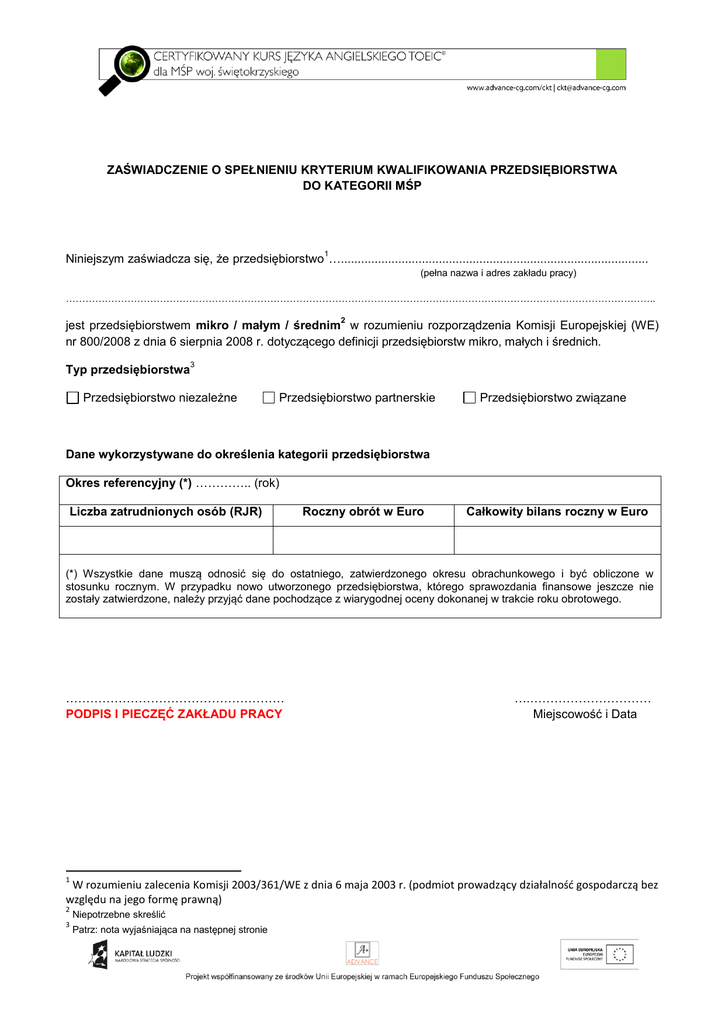 ZAŚWIADCZENIE O SPEŁNIENIU KRYTERIUM KWALIFIKOWANIA PRZEDSIĘBIORSTWA DO KATEGORII MŚP 1 Niniejszym zaświadcza się, że przedsiębiorstwo …........................................................................................... (pełna nazwa i adres zakładu pracy) ……………………………………………………………………………………………………………………………………………………………….. 2 jest przedsiębiorstwem mikro / małym / średnim w rozumieniu rozporządzenia Komisji Europejskiej (WE) nr 800/2008 z dnia 6 sierpnia 2008 r. dotyczącego definicji przedsiębiorstw mikro, małych i średnich. Typ przedsiębiorstwa 3 Przedsiębiorstwo niezależne Przedsiębiorstwo partnerskie Przedsiębiorstwo związane Dane wykorzystywane do określenia kategorii przedsiębiorstwa Okres referencyjny (*) ………….. (rok) Liczba zatrudnionych osób (RJR) Roczny obrót w Euro Całkowity bilans roczny w Euro (*) Wszystkie dane muszą odnosić się do ostatniego, zatwierdzonego okresu obrachunkowego i być obliczone w stosunku rocznym. W przypadku nowo utworzonego przedsiębiorstwa, którego sprawozdania finansowe jeszcze nie zostały zatwierdzone, należy przyjąć dane pochodzące z wiarygodnej oceny dokonanej w trakcie roku obrotowego. ……………………………………………… PODPIS I PIECZĘĆ ZAKŁADU PRACY 1 ….………………………… Miejscowość i Data W rozumieniu zalecenia Komisji 2003/361/WE z dnia 6 maja 2003 r. (podmiot prowadzący działalność gospodarczą bez względu na jego formę prawną) 2 Niepotrzebne skreślić 3 Patrz: nota wyjaśniająca na następnej stronie NOTA WYJAŚNIAJĄCA dotycząca typów przedsiębiorstw branych pod uwagę przy obliczaniu liczby osób zatrudnionych i danych finansowych TYP PRZEDSIĘBIORSTWA Definicja MŚP rozróżnia trzy typy przedsiębiorstwa, w zależności od ich związków z innymi przedsiębiorstwami pod względem udziału w kapitale, prawach głosu lub wywierania dominującego wpływu. Typ 1: Przedsiębiorstwo niezależne Oznacza on każde przedsiębiorstwo, którego nie można zaliczyć do żadnego z dwóch pozostałych typów (przedsiębiorstwo partnerskie bądź związane). Przedsiębiorstwo wnioskodawcy jest niezależne, jeśli: nie posiada 25% lub więcej udziałów lub głosów w innym przedsiębiorstwie, inne przedsiębiorstwa lub podmioty publiczne nie posiadają, samodzielnie lub wspólnie z jednym lub kilkoma przedsiębiorstwami związanymi lub podmiotami publicznymi 25% lub więcej udziałów lub głosów w przedsiębiorstwie wnioskodawcy, poza niektórymi wyjątkami, nie sporządza skonsolidowanych sprawozdań finansowych i nie jest ujęte w sprawozdaniach finansowych przedsiębiorstwa, które sporządza sprawozdania skonsolidowane, a zatem nie jest przedsiębiorstwem związanym. Typ 2: Przedsiębiorstwo partnerskie Ten typ oznacza sytuację przedsiębiorstw, które ustanowiły poważne partnerstwa finansowe z innymi przedsiębiorstwami, ale żadne z przedsiębiorstw pozostających w tym związku nie sprawuje skutecznej, bezpośredniej lub pośredniej kontroli nad drugim. Przedsiębiorstwa partnerskie to przedsiębiorstwa, które nie są ani niezależne, ani ze sobą związane. Przedsiębiorstwo wnioskodawcy jest partnerem drugiego przedsiębiorstwa, jeśli: posiada 25% lub więcej udziałów lub głosów w drugim przedsiębiorstwie lub drugie przedsiębiorstwo posiada 25% lub więcej udziałów lub głosów w przedsiębiorstwie wnioskodawcy, przedsiębiorstwa nie są przedsiębiorstwami związanymi, w poniższym rozumieniu, co oznacza, między innymi, że głosy jednego przedsiębiorstwa w drugim nie przekraczają 50% łącznej liczby głosów, przedsiębiorstwo wnioskodawcy nie sporządza skonsolidowanych sprawozdań finansowych obejmujących na zasadzie konsolidacji dane innego przedsiębiorstwa oraz nie jest ujęte na zasadzie konsolidacji w sprawozdaniach skonsolidowanych innego przedsiębiorstwa lub przedsiębiorstwa z nim związanego. W przypadku przedsiębiorstwa partnerskiego przy ustalaniu, czy kwalifikuje się ono do przyznania mu statusu MŚP, należy dodać do danych przedsiębiorstwa wnioskodawcy procent liczby osób zatrudnionych i danych finansowych drugiego przedsiębiorstwa. Procent ten odzwierciedla posiadany proporcjonalny udział w kapitale lub głosach (w zależności który jest większy). Typ 3: Przedsiębiorstwo związane Ten rodzaj relacji odpowiada sytuacji gospodarczej przedsiębiorstw, które tworzą grupę, w której jedno przedsiębiorstwo kontroluje, bezpośrednio lub pośrednio, większość praw głosu w innym przedsiębiorstwie (za pośrednictwem umów lub, w niektórych przypadkach, osób fizycznych jako udziałowców) lub wywiera dominujący wpływ na to przedsiębiorstwo. Przedsiębiorstwo wnioskodawcy jest związane z innym przedsiębiorstwem, jeśli: przedsiębiorstwo posiada ponad 50% głosów udziałowców lub wspólników w innym przedsiębiorstwie, a/lub inne przedsiębiorstwo posiada ponad 50% głosów w przedsiębiorstwie wnioskodawcy, przedsiębiorstwo wnioskodawcy sporządza skonsolidowane sprawozdania finansowe obejmujące na zasadzie konsolidacji dane innego przedsiębiorstwa oraz jest ujęte na zasadzie konsolidacji w sprawozdaniach skonsolidowanych innego przedsiębiorstwa. Aby ustalić, czy przedsiębiorstwo zachowuje próg zatrudnienia i pułapy finansowe, należy dodać 100% danych przedsiębiorstwa związanego do danych przedsiębiorstwa wnioskodawcy. Jeżeli przedsiębiorstwo nie sporządza sprawozdań finansowych skonsolidowanych, a przedsiębiorstwo, z którym przedsiębiorstwo wnioskodawcy jest związane, także jest powiązane na zasadzie łańcuchowej, z innymi przedsiębiorstwami, należy dodać do swoich danych 100% danych wszystkich tych przedsiębiorstw związanych. W przypadku gdy na ostatni dzień bilansu dane Przedsiębiorstwo przekracza lub spada poniżej progu zatrudnienia 