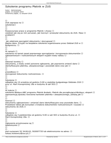 Cech Rzemiosł Drzewnych Szkolenie programu Płatnik w ZUS Autor: Administrator piątek, 12 sierpień 2016 Zmieniony piątek, 12 sierpień 2016 ZUS zaprasza na szkolenia Rozpoczynasz prace w programie Płatnik i chcesz wiedzieć jak się po nim poruszać, jak tworzyć i przesyłać dokumenty do ZUS. Masz problem jak właściwie sporządzić dokumenty i skorygować błędne dane. Przyjdź na bezpłatne szkolenia organizowane przez Oddział ZUS w Bydgoszczy. W ramach szkolenia na temat zasad poprawnego sporządzania i korygowania dokumentów zgłoszeniowych i rozliczeniowych ekspert wyjaśni kiedy należy dokonać korekty dokumentu, a kiedy zrobić ponowne zgłoszenie, jak poprawnie zmienić dane identyfikacyjne płatnika, ubezpieczonego i pozostałe dane oraz jak prawidłowo skorygować dokumenty rozliczeniowe. Szkolenie odbędzie się 19 września od godziny 9.00 w siedzibie bydgoskiego Oddziału ZUS przy ul. Marii Konopnickiej 18a w budynku B sali 503. W trakcie szkolenie „ABC programu Płatnik – Płatnik dla początkujących” ekspert zaprezentują sposoby tworzenia kartoteki płatnika i ubezpieczonego, pokażą jak tworzyć dokumenty zgłoszeniowe i zmieniać dane identyfikacyjne oraz pozostałe dane. Przedstawi także jak korzystać z kreatora dokumentów rozliczeniowych i wysyłać dokumenty do ZUS. Szkolenie odbędzie się 3 października od godziny 9.00 w sali 503 w budynku B przy ul. Marii Konopnickiej 18a. Zgłoszenia przyjmowane są telefonicznie pod numerami 52 3418143, 502007735 lub elektronicznie na adres: [email protected], http://cechdrzewny.bydgoszcz.pl/portal Powered by Joomla! Wygenerowano: 8 March, 2017, 11:57 Cech Rzemiosł Drzewnych i pod numerem 52 3418109 lub elektronicznie na adres: [email protected] IPP jest rozwinięciem programu Płatnik, który ułatwi płatnikom pracę związaną z poprawnym sporządzaniem dokumentów ubezpieczeniowych, przyspieszy obieg informacji pomiędzy płatnikiem i ZUS oraz zapewni ewidencjonowanie poprawnych danych na kontach płatników składek i ubezpieczonych. http://cechdrzewny.bydgoszcz.pl/portal Powered by Joomla! Wygenerowano: 8 March, 2017, 11:57