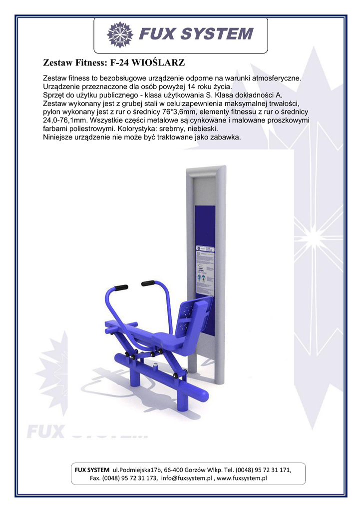Zestaw Fitness: F-24 WIOŚLARZ Zestaw fitness to bezobsługowe urządzenie odporne na warunki atmosferyczne. Urządzenie przeznaczone dla osób powyżej 14 roku życia. Sprzęt do użytku publicznego - klasa użytkowania S. Klasa dokładności A. Zestaw wykonany jest z grubej stali w celu zapewnienia maksymalnej trwałości, pylon wykonany jest z rur o średnicy 76*3,6mm, elementy fitnessu z rur o średnicy 24,0-76,1mm. Wszystkie części metalowe są cynkowane i malowane proszkowymi farbami poliestrowymi. Kolorystyka: srebrny, niebieski. Niniejsze urządzenie nie może być traktowane jako zabawka. FUX SYSTEM ul.Podmiejska17b, 66-400 Gorzów Wlkp. Tel. (0048) 95 72 31 171, Fax. (0048) 95 72 31 173, [email protected] , www.fuxsystem.pl Funkcje: wzmacnia mięśnie nóg, ramion i pleców. Dane techniczne: długość: 155 cm szerokość: 140 cm wysokość: 190cm waga: 100 kg minimalna przestrzeń: 455 x 440 cm, normy bezpieczeństwa: PN-EN 1176-1:2009; DIN 79000:2012 liczba użytkowników : 1 Materiały: elementy metalowe wykonane ze stali cynkowanej malowanej proszkowo. Zabezpieczenia: stal cynkowana malowana proszkowo. FUX SYSTEM ul.Podmiejska17b, 66-400 Gorzów Wlkp. Tel. (0048) 95 72 31 171, Fax. (0048) 95 72 31 173, [email protected] , www.fuxsystem.pl