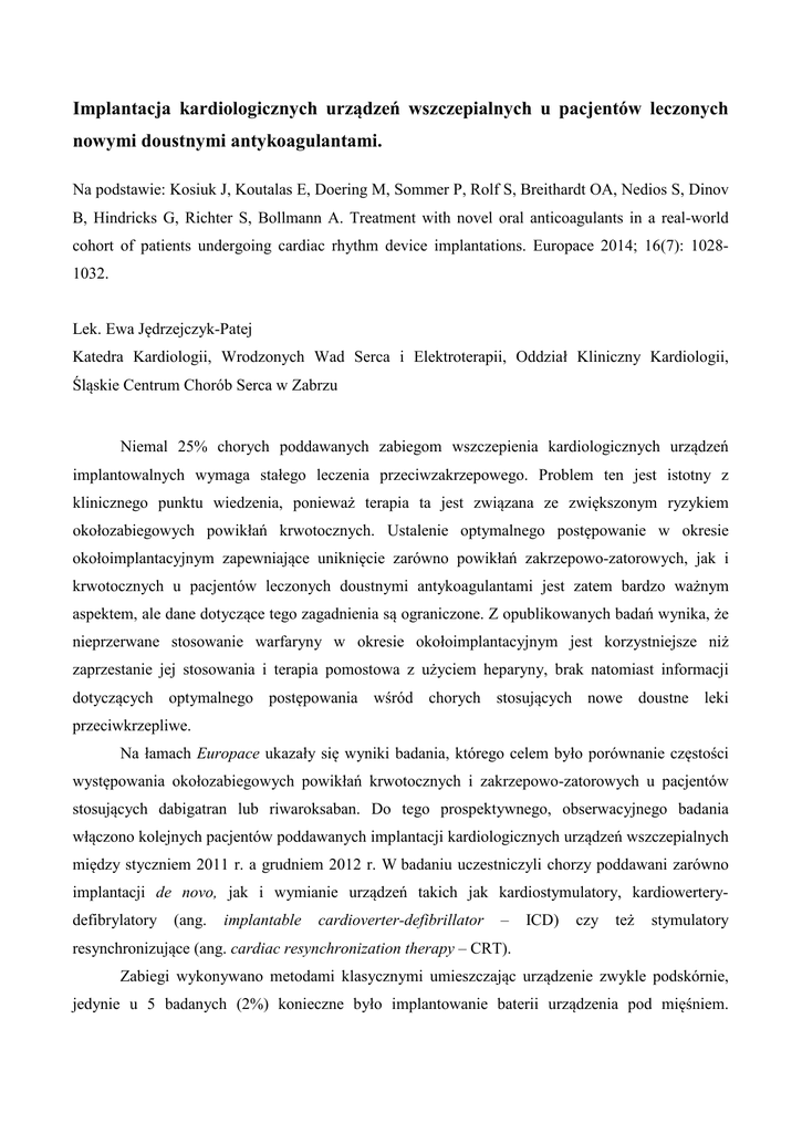 Implantacja kardiologicznych urządzeń wszczepialnych u pacjentów leczonych nowymi doustnymi antykoagulantami. Na podstawie: Kosiuk J, Koutalas E, Doering M, Sommer P, Rolf S, Breithardt OA, Nedios S, Dinov B, Hindricks G, Richter S, Bollmann A. Treatment with novel oral anticoagulants in a real-world cohort of patients undergoing cardiac rhythm device implantations. Europace 2014; 16(7): 10281032. Lek. Ewa Jędrzejczyk-Patej Katedra Kardiologii, Wrodzonych Wad Serca i Elektroterapii, Oddział Kliniczny Kardiologii, Śląskie Centrum Chorób Serca w Zabrzu Niemal 25% chorych poddawanych zabiegom wszczepienia kardiologicznych urządzeń implantowalnych wymaga stałego leczenia przeciwzakrzepowego. Problem ten jest istotny z klinicznego punktu wiedzenia, ponieważ terapia ta jest związana ze zwiększonym ryzykiem okołozabiegowych powikłań krwotocznych. Ustalenie optymalnego postępowanie w okresie okołoimplantacyjnym zapewniające uniknięcie zarówno powikłań zakrzepowo-zatorowych, jak i krwotocznych u pacjentów leczonych doustnymi antykoagulantami jest zatem bardzo ważnym aspektem, ale dane dotyczące tego zagadnienia są ograniczone. Z opublikowanych badań wynika, że nieprzerwane stosowanie warfaryny w okresie okołoimplantacyjnym jest korzystniejsze niż zaprzestanie jej stosowania i terapia pomostowa z użyciem heparyny, brak natomiast informacji dotyczących optymalnego postępowania wśród chorych stosujących nowe doustne leki przeciwkrzepliwe. Na łamach Europace ukazały się wyniki badania, którego celem było porównanie częstości występowania okołozabiegowych powikłań krwotocznych i zakrzepowo-zatorowych u pacjentów stosujących dabigatran lub riwaroksaban. Do tego prospektywnego, obserwacyjnego badania włączono kolejnych pacjentów poddawanych implantacji kardiologicznych urządzeń wszczepialnych między styczniem 2011 r. a grudniem 2012 r. W badaniu uczestniczyli chorzy poddawani zarówno implantacji de novo, jak i wymianie urządzeń takich jak kardiostymulatory, kardiowerterydefibrylatory (ang. implantable cardioverter-defibrillator – ICD) czy też stymulatory resynchronizujące (ang. cardiac resynchronization therapy – CRT). Zabiegi wykonywano metodami klasycznymi umieszczając urządzenie zwykle podskórnie, jedynie u 5 badanych (2%) konieczne było implantowanie baterii urządzenia pod mięśniem. Elektrody umieszczano z dojścia przez żyłę podobojczykową, elektrodę defibrylującą lokalizowano najczęściej w okolicy koniuszka prawej komory, a w przypadku implantacji stymulującej elektrody prawokomorowej umieszczano ją zwykle w okolicy przegrody międzykomorowej. Zabiegi wykonywało 16 operatorów o różnym doświadczeniu. W okresie przedzabiegowym pacjenci nie otrzymywali ostatniej zalecanej dawki, tak więc chorzy leczeni przewlekle dabigatranem przyjmowali ostatnią dawkę leku 24 godziny przed zabiegiem, a badani stosujący riwaroksaban ostatnią dawkę antykoagulantu zażywali 36 godzin przed implantacją. Ponowne włączenie leku w okresie pozabiegowym było uzależnione od decyzji lekarza wykonującego zabieg implantacji. Wszystkich pacjentów rutynowo kontrolowano w pierwszej dobie po zabiegu, przed wypisaniem ze szpitala oraz miesiąc po implantacji. W trakcie tych kontroli dwóch doświadczonych lekarzy oceniało przede wszystkim stan miejscowy po implantacji urządzenia. Ponadto u wszystkich chorych poddawanych zabiegom wszczepialnym, z wyjątkiem badanych, u których wymieniano jedynie baterię urządzenia, w okresie pozabiegowym ultrasonograficznie oceniano obecność płynu w osierdziu. W trakcie kontroli po miesiącu od zabiegu zbierano także dokładny wywiad dotyczący powikłań zakrzepowo-zatorowych. Za istotnego klinicznie krwiaka loży urządzenia uznawano takiego, który wymagał przedłużonego pobytu w szpitalu, zaprzestania leczenia przeciwkrzepliwego lub przetoczenia krwi. Leczenie zabiegowe krwiaka podejmowano w przypadku, gdy żadna z metod leczenia zachowawczego, a więc redukcja czy odstawienie leczenia przeciwkrzepliwego nie przynosiła pożądanego efektu w postaci redukcji/zaprzestania krwawienia i powiększania się krwiaka. Analizie poddano dane 93 kolejnych chorych, którzy w okresie okołoimplantacyjnym stosowali dabigatran i 83 kolejnych pacjentów leczonych okołozabiegowo riwaroksabanem. W zależności od klirensu kreatyniny oraz wieku badani z grupy dabigatranu przyjmowali lek w dawce 110 mg (n=54, 58%) lub 150 mg (n=39, 42%) dwa razy dziennie, natomiast w zależności od parametrów nerkowych chorzy z grupy riwaroksabanu stosowali raz dziennie lek w dawce 15 mg (n=41, 49%) lub 20 mg (n=42, 51%). W zakresie charakterystyki podstawowej nie stwierdzono znamiennych statystycznie różnic pomiędzy dwiema wymienionymi powyżej grupami badanymi. Ryzyko powikłań zakrzepowozatorowych oceniane na podstawie skali CHA2DS2-VASc było podobne w obu grupach (4, zakres 35 dla chorych stosujących dabigatran vs 4, zakres 3-5 dla pacjentów leczonych riwaroksabanem; P=0.77). Badani z grupy dabigatranu częściej stosowali dodatkowo kwas acetylosalicylowy (27 vs 10%; P=0.015) oraz pochodne tienopirydyny (14 vs 4%; P=0.018). Parametry związane z zabiegiem implantacji urządzeń, takie jak średni czas trwania implantacji (60 ± 30 min w grupie chorych leczonych dabigatranem vs 56 ± 35 min w grupie badanych stosujących riwaroksaban; P=NS), częstość implantacji urządzenia pod mięśniem (3 vs 2%; P=NS), a także rodzaj wszczepianych urządzeń (71 vs 78% dwujamowych stymulatorów lub CRT; P=NS) były porównywalne w obu grupach badanych. Najczęściej wykonywanym zabiegiem w obu grupach była implantacja urządzenia de novo (79 vs 78%; P=NS), rzadziej wymiana baterii urządzenia (10 vs 12%; P=NS), a najrzadziej rozbudowa urządzenia (10 vs 10%; P=NS). Wśród pacjentów leczonych dabigatranem w okresie pozabiegowym lek otrzymało 24 badanych (26%), a pozostałych 69 chorych (74%) było leczonych tym lek
