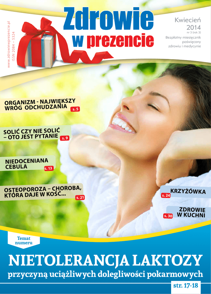 www.zdrowiewprezencie.pl ISSN 2084 – 5324 Kwiecień 2014 nr 3 (rok 3) Bezpłatny miesięcznik poświęcony zdrowiu i medycynie ORGANIZM - NA JWIĘKSZY WRÓG ODCHUDZANIA s. 5 SOLIĆ CZY NIE SOLIĆ – oto jest pytanie s. 9 NIEDOCENIANA CEBULA s. 13 Osteoporoza – choroba, która daje w kość... s. 21 s. 24 Krzyżówka s. 30 Zdrowie w kuchni Temat numeru nietolerancja laktozy przyczyną uciążliwych dolegliwości pokarmowych s.14 str. 17-18 Drodzy Czytelnicy Zdrowia w prezencie! K wiecień większości z Nas upłynie pod znakiem jajek. Praktycznie we wszystkich kulturach, zarówno starożytnych jak i współczesnych, jaja symbolizują bardzo ważne prawdy religijne. Aby podkreślić ich metafizyczną rolę, od tysięcy lat ludzie starają się nadać im określoną wymowę, głównie poprzez odpowiednie zdobienie jaj. Na przykład w kulturze chrześcijańskiej jaja się maluje i święci wraz z innymi pokarmami, a następnie ludzie dzielą się nimi na znak zmartwychwstania Chrystusa oraz z nadzieją na życie wieczne. Najstarsze ślady zdobienia jaj pochodzą z Asyrii sprzed 5 tys. lat p.n.e. Jaja zdobiono również w starożytnej Persji, Egipcie, Rzymie czy Chinach. Z kolei Aborygeni rzeźbili jaja strusie, jednocześnie uznając je za największą świętość. Jaja stanowią niezwykle cenny produkt spożywczy, odznaczający się wysoką zawartością niezbędnych do prawidłowego funkcjonowania organizmu białek, aminokwasów, witamin i soli mineralnych. Wbrew powszechnym opiniom jaja należą do pokarmów niskokalorycznych. Przede wszystkim zawierają białko w czystej postaci, o bardzo wysokim stopniu przyswajalności. Na uwagę zasługuje również bogactwo witamin głównie rozpuszczalnych w tłuszczach: A, D, E, K oraz witaminy z grupy B. Zjedzone na śniadanie jajo daje energię, ale też, dzięki dużej zawartości choliny, poprawia funkcjonowanie mózgu, wzmacnia także męskość. Zapewne i tym razem nie odpowiemy sobie jednoznacznie, co było pierwsze: jajko czy kura, lecz na pewno warto pamiętać o zaletach pokarmowych jaj. Drodzy Czytelnicy! W najnowszym numerze Zdrowia w prezencie polecam Państwu artykuł: „Nietolerancja laktozy przyczyną uciążliwych dolegliwości pokarmowych” - być może pozwoli on uzyskać Państwu odpowiedź na pytanie, dlaczego wielu ludzi wypicie mleka czy zjedzenie lodów może odchorować biegunką. Życzę Państwu przyjemnej lektury. Redakcja ul. Wojska Polskiego 4 72-315 Resko tel. +48 91 395 14 80 [email protected] Redaktor Naczelny Zbigniew Szczepankowski [email protected] Konsultacja medyczna lek. Beata Szczepankowska Wydawca WEGAFARM sp. z o.o. 70-785 Szczecin ul. Zofii Nałkowskiej 6/U6 NIP 955-23-46-540 REGON: 321351580 Manager ds. Reklamy Marcin Sochan Tel. 797 721 466 [email protected] Biuro Obsługi Klienta Tel. +48 91 395 14 80 [email protected] Pozdrawiam serdecznie Skład graficzny i druk „Leszczyńscy” s. c. Partnerzy www.artelis.pl Zbigniew Szczepankowski Redakcja nie zwraca materiałów niezamówionych, zastrzega sobie prawo redagowania zamówionych tekstów, nie odpowiada za treść zamieszczonych reklam i ogłoszeń. Miesięcznik ZDROWIE W PREZENCIE nie zastępuje bezpośredniej porady lekarskiej, może jedynie stanowić źródło informacji. Przed skorzystaniem z porady należy skonsultować się z lekarzem. Dystrybucja miesięcznika bez zgody wydawcy lub sprzedaż magazynu jest nielegalna. r e k l a m a a m a ® 40 mg kapsułki Simethiconum Raniberl Max ® 150 mg tabletki powlekane Ranitidinum r e k l Espumisan WSKAZANIA DO STOSOWANIA : WSKAZANIA DO STOSOWANIA : Leczenie objawowe zaburzeń żołądkowo-jelitowych związanych z nadmiernym gromadzeniem się gazów w przewodzie pokarmowym, np.: wzdęcia. W przypadku wzmożonego powstawania gazów w okresie pooperacyjnym. W przygotowaniu pacjentów do badań radiologicznych i ultrasonograficznych jamy brzusznej oraz gastroskopii. Raniberl Max jest stosowany w leczeniu objawowym dolegliwości żołądkowych, takich jak: zgaga, niestrawność (dyspepsja),nadkwaśność soku żołądkowego, ból w nadbrzuszu, które nie są związane z chorobą organiczną przewodu pokarmowego. PRZECIWWSKAZANIA : Nie wolno przyjmować produktu Raniberl Max w przypadku stwierdzonej nadwrażliwości na chlorowodorek ranitydyny lub na którąkolwiek substancję pomocniczą. Nadwrażliwość na substancję czynną – symetykon lub na którąkolwiek substancję pomocniczą wchodzącą w skład produktu ESPUMISAN. PODMIOT ODPOWIEDZIALNY: Berlin Chemie AG, Glienicker Weg 125, 12489 Berlin, Niemcy. PRZECIWWSKAZANIA : PODMIOT ODPOWIEDZIALNY: AG Glienicker Weg 125, 12489 Berlin, Niemcy, Informacja naukowa: BERLIN-CHEMIE/MENARINI POLSKA Sp. z o.o. ul. Cybernetyki 7B, 02-677 Warszawa, tel. 22 566 21 00 r e k l a m a Przed użyciem zapoznaj się z ulotką, która zawiera wskazania, przeciwwskazania, dane dotyczące działań niepożądanych i dawkowanie oraz informacje dotyczące stosowania produktu leczniczego, bądź skonsultuj się z lekarzem lub farmaceutą, gdyż każdy lek niewłaściwie stosowany zagraża Twojemu życiu lub zdrowiu. www.zdrowiewprezencie.pl organizm - największy wróg odchudzania o g ł o s z e n i e w ł a s n e w y d a w c y Przyzwyczajenie jest drugą naturą - na pewno o tym słyszeliście. Czy jednak zdajecie sobie sprawę z tego, że przyzwyczajenie może ci też przeszkadzać? Tak jest na przykład w przypadku odchudzania Przyzwyczajenie nieświadome Organizm przyzwyczaja się do Twojej diety – tak ustawia swój metabolizm, aby do maksimum wykorzystać substancje, które mu dostarczasz. Jak zapewne wiesz, najbardziej powszechne, uznawane za bardzo skuteczne diety, na przykład dieta Dukana albo dieta kopenhaska, dość poważnie ingerują w Twoje nawyki żywieniowe. Problem polega na tym, że organizm, przyzwycza- jony do przyjmowania określonych substancji w konkretnej ilości, uruchomi mechanizmy, które mają mu taką możliwość zapewnić. Mówiąc najpro