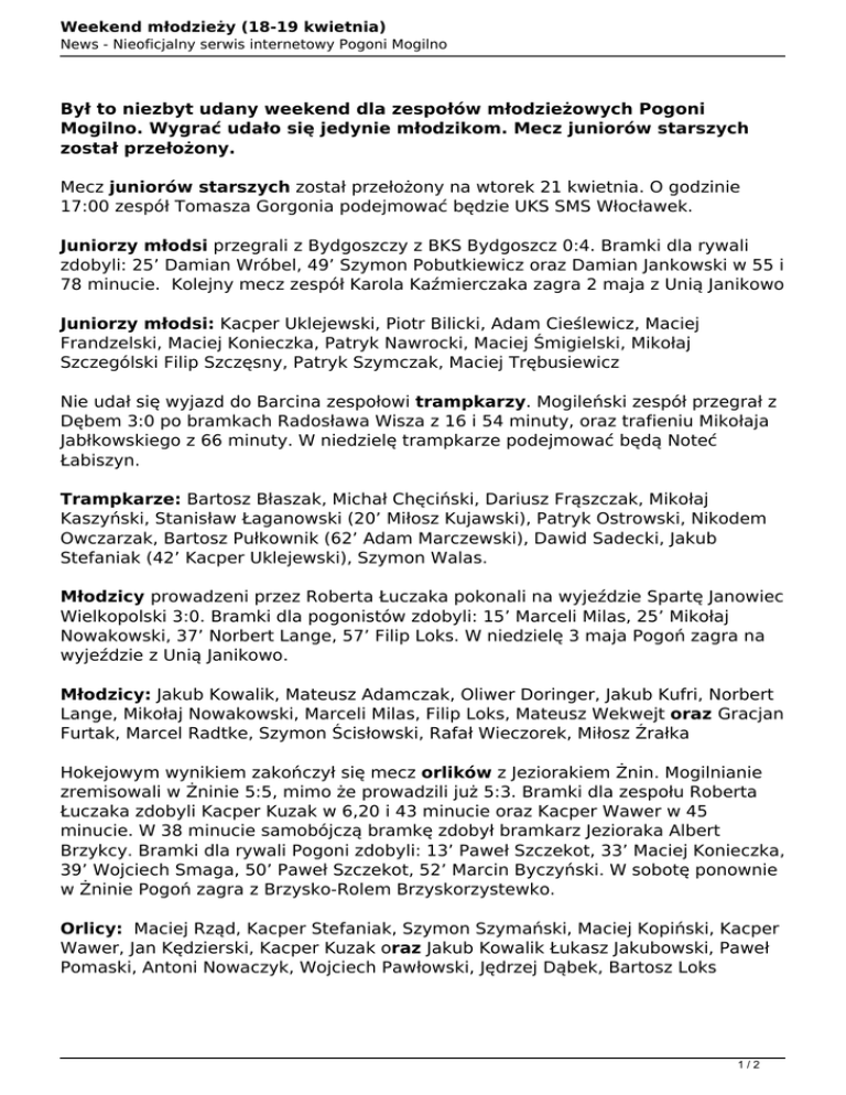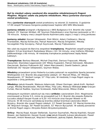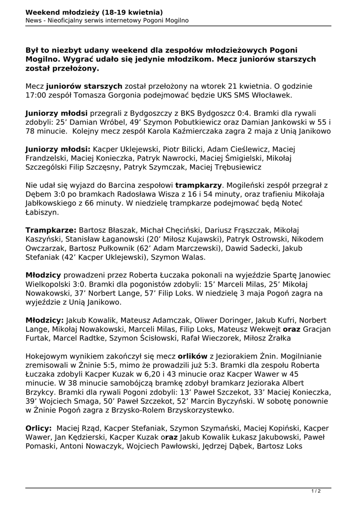 Weekend młodzieży (18-19 kwietnia) News - Nieoficjalny serwis internetowy Pogoni Mogilno Był to niezbyt udany weekend dla zespołów młodzieżowych Pogoni Mogilno. Wygrać udało się jedynie młodzikom. Mecz juniorów starszych został przełożony. Mecz juniorów starszych został przełożony na wtorek 21 kwietnia. O godzinie 17:00 zespół Tomasza Gorgonia podejmować będzie UKS SMS Włocławek. Juniorzy młodsi przegrali z Bydgoszczy z BKS Bydgoszcz 0:4. Bramki dla rywali zdobyli: 25’ Damian Wróbel, 49’ Szymon Pobutkiewicz oraz Damian Jankowski w 55 i 78 minucie. Kolejny mecz zespół Karola Kaźmierczaka zagra 2 maja z Unią Janikowo Juniorzy młodsi: Kacper Uklejewski, Piotr Bilicki, Adam Cieślewicz, Maciej Frandzelski, Maciej Konieczka, Patryk Nawrocki, Maciej Śmigielski, Mikołaj Szczególski Filip Szczęsny, Patryk Szymczak, Maciej Trębusiewicz Nie udał się wyjazd do Barcina zespołowi trampkarzy. Mogileński zespół przegrał z Dębem 3:0 po bramkach Radosława Wisza z 16 i 54 minuty, oraz trafieniu Mikołaja Jabłkowskiego z 66 minuty. W niedzielę trampkarze podejmować będą Noteć Łabiszyn. Trampkarze: Bartosz Błaszak, Michał Chęciński, Dariusz Frąszczak, Mikołaj Kaszyński, Stanisław Łaganowski (20’ Miłosz Kujawski), Patryk Ostrowski, Nikodem Owczarzak, Bartosz Pułkownik (62’ Adam Marczewski), Dawid Sadecki, Jakub Stefaniak (42’ Kacper Uklejewski), Szymon Walas. Młodzicy prowadzeni przez Roberta Łuczaka pokonali na wyjeździe Spartę Janowiec Wielkopolski 3:0. Bramki dla pogonistów zdobyli: 15’ Marceli Milas, 25’ Mikołaj Nowakowski, 37’ Norbert Lange, 57’ Filip Loks. W niedzielę 3 maja Pogoń zagra na wyjeździe z Unią Janikowo. Młodzicy: Jakub Kowalik, Mateusz Adamczak, Oliwer Doringer, Jakub Kufri, Norbert Lange, Mikołaj Nowakowski, Marceli Milas, Filip Loks, Mateusz Wekwejt oraz Gracjan Furtak, Marcel Radtke, Szymon Ścisłowski, Rafał Wieczorek, Miłosz Źrałka Hokejowym wynikiem zakończył się mecz orlików z Jeziorakiem Żnin. Mogilnianie zremisowali w Żninie 5:5, mimo że prowadzili już 5:3. Bramki dla zespołu Roberta Łuczaka zdobyli Kacper Kuzak w 6,20 i 43 minucie oraz Kacper Wawer w 45 minucie. W 38 minucie samobójczą bramkę zdobył bramkarz Jezioraka Albert Brzykcy. Bramki dla rywali Pogoni zdobyli: 13’ Paweł Szczekot, 33’ Maciej Konieczka, 39’ Wojciech Smaga, 50’ Paweł Szczekot, 52’ Marcin Byczyński. W sobotę ponownie w Żninie Pogoń zagra z Brzysko-Rolem Brzyskorzystewko. Orlicy: Maciej Rząd, Kacper Stefaniak, Szymon Szymański, Maciej Kopiński, Kacper Wawer, Jan Kędzierski, Kacper Kuzak oraz Jakub Kowalik Łukasz Jakubowski, Paweł Pomaski, Antoni Nowaczyk, Wojciech Pawłowski, Jędrzej Dąbek, Bartosz Loks 1/2 Weekend młodzieży (18-19 kwietnia) News - Nieoficjalny serwis internetowy Pogoni Mogilno Autor: Rychu 2/2 Powered by TCPDF (www.tcpdf.org)
