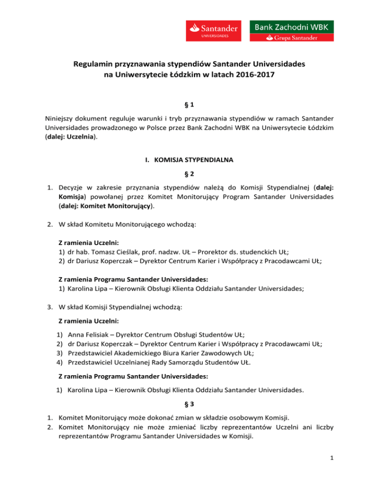 Regulamin przyznawania stypendiów Santander Universidades na Uniwersytecie Łódzkim w latach 2016-2017 §1 Niniejszy dokument reguluje warunki i tryb przyznawania stypendiów w ramach Santander Universidades prowadzonego w Polsce przez Bank Zachodni WBK na Uniwersytecie Łódzkim (dalej: Uczelnia). I. KOMISJA STYPENDIALNA §2 1. Decyzje w zakresie przyznania stypendiów należą do Komisji Stypendialnej (dalej: Komisja) powołanej przez Komitet Monitorujący Program Santander Universidades (dalej: Komitet Monitorujący). 2. W skład Komitetu Monitorującego wchodzą: Z ramienia Uczelni: 1) dr hab. Tomasz Cieślak, prof. nadzw. UŁ – Prorektor ds. studenckich UŁ; 2) dr Dariusz Koperczak – Dyrektor Centrum Karier i Współpracy z Pracodawcami UŁ; Z ramienia Programu Santander Universidades: 1) Karolina Lipa – Kierownik Obsługi Klienta Oddziału Santander Universidades; 3. W skład Komisji Stypendialnej wchodzą: Z ramienia Uczelni: 1) 2) 3) 4) Anna Felisiak – Dyrektor Centrum Obsługi Studentów UŁ; dr Dariusz Koperczak – Dyrektor Centrum Karier i Współpracy z Pracodawcami UŁ; Przedstawiciel Akademickiego Biura Karier Zawodowych UŁ; Przedstawiciel Uczelnianej Rady Samorządu Studentów UŁ. Z ramienia Programu Santander Universidades: 1) Karolina Lipa – Kierownik Obsługi Klienta Oddziału Santander Universidades. §3 1. Komitet Monitorujący może dokonać zmian w składzie osobowym Komisji. 2. Komitet Monitorujący nie może zmieniać liczby reprezentantów Uczelni ani liczby reprezentantów Programu Santander Universidades w Komisji. 1 3. Komitet Monitorujący może dokonać zmiany Przewodniczącego Komisji, z zastrzeżeniem pkt. 2 niniejszego artykułu. §4 1. 2. 3. 4. 5. Komisja działa do 31 grudnia 2017 r. Komisja podejmuje decyzje większością głosów w obecności wszystkich jej członków. W przypadku równej ilości głosów decyduje głos Przewodniczącego. Decyzje Komisji są ostateczne i nie przysługuje od nich odwołanie. Pracami Komisji kieruje Przewodniczący wybierany większością głosów podczas pierwszego posiedzenia Komisji, które zwołuje Komitet. 6. Posiedzenia Komisji mogą odbywać się za pomocą środków elektronicznego porozumiewania się na odległość, jeżeli zgodę na to wyrażą wszyscy jej członkowie. II. STYPENDIA SANTANDER UNIVERSIDADES §5 Komisja przydziela 2 rodzaje stypendiów: 1. Stypendia Santander Universidades dla wybitnych studentów Uniwersytetu Łódzkiego. 2. Stypendium „Nagroda Santander Universidades”. III. STYPENDIA SANTANDER UNIVERSIDADES DLA WYBITNYCH STUDENTOW UNIWERSYTETU ŁÓDZKIEGO §6 1. Stypendia przeznaczone będą przede wszystkim na pokrycie kosztów związanych z rozwojem naukowym i badawczym, wymianą międzynarodową, poprzez udział w konferencjach naukowych i badawczych lub poprzez wymianę studencką. 2. Stypendia będą przyznawane studentom za zaangażowanie społeczne, zaangażowanie w inicjatywy na Uczelni oraz za szczególne osiągnięcia w nauce i działalności pozauczelnianej. 3. W przypadku otrzymania Stypendium Santander Universidades studenta obowiązuje okres 12 miesięcy karencji przed ponownym aplikowaniem o stypendium Santander Universidades. Okres karencji liczony jest od dnia ogłoszenia decyzji o przyznaniu stypendium. 4. Jeżeli student studiuje na dwóch kierunkach, może ubiegać się o stypendium tylko na jednym kierunku. 5. W ramach przyznanych środków, w roku akademickim 2016/2017, Uczelnia zrealizuje minimum 17 jednorazowych stypendiów. §7 Stypendium Santander Universidades może być przyznane studentowi/ce, który/a ukończył/a co najmniej pierwszy rok studiów i spełnia łącznie następujące warunki: 2 1. jest studentem/ka studiów I, II lub III stopnia, bądź jednolitych studiów magisterskich lub studiów III stopnia i osiągnął/ęła średnią ocen z toku studiów za 2 ostatnie semestry nie niższą niż 4,00; 2. posiada szczególne, udokumentowane (dyplomy, zaświadczenia, certyfikaty, nagrody etc.) osiągnięcia w działalności uczelnianej (koła naukowe, krajowe i międzynarodowe organizacje studenckie etc.) lub pozauczelnianej (działalność w sektorze NGO, stowarzyszenia, fundacje etc.). 3. złożył/ła w terminie prawidłowo wypełniony wniosek o Stypendium Santander Universidades wraz z załącznikami. §8 1. Nabór wniosków o Stypendium Santander Universidades będzie przebiegał od dnia 15.11.2016 r. do dnia 15.12.2016 r. włącznie, w Placówce Relacyjnej Santander Universidades na Wydziale Zarządzania UŁ. 2. Wzór wniosku stanowi Załącznik do niniejszego regulaminu. 3. Wnioski złożone po terminie, o którym mowa w ust. 1, nie będą rozpatrywane. 4. Wnioski zostaną rozpatrzone przez Komisję najpóźniej w terminie 45 dni, liczonych od zakończenia naboru, o którym mowa w ust. 1. 5. Stypendium Santander Universidades może być przyznane osobie, która otrzymuje inne stypendia. §9 1. Podstawą wypłaty Stypendium Santander Universidades jest posiadanie statusu studenta/ki Uniwersytetu Łódzkiego. 2. Jeżeli stypendysta/ka utraci status studenta w danym roku akademickim, zobowiązany jest do zwrotu 50% otrzymanego stypendium. 3. Wypłata stypendium będzie realizowana w formie jednorazowego świadczenia pieniężnego. 4. Stypendium zostanie przekazane na wskazany przez Stypendystę rachunek bankowy w Banku Zachodnim WBK. IV. STYPENDIUM „NAGRODA SANTANDER UNIVERSIDADES” § 10 1. Stypendium „Nagroda Santander Universidades” w wysokości 4.000 PLN (słownie: cztery tysiące złotych) zostanie przyznane w roku akademickim 2017/2018 osobie posiadającej status studenta Uniwersytetu Łódzkiego, przyjętej na I rok studiów I stopnia lub jednolitych studiów magisterskich, która uzyskała najwyższy wynik punktowy z przedmiotów wymaganych na kierunku na który student został przyjęty w postępowaniu rekrutacyjnym. 2. Komisja przyznaje stypendium na podstawie informacji pisemnej przekazanej przez Centrum Obsługi Stud