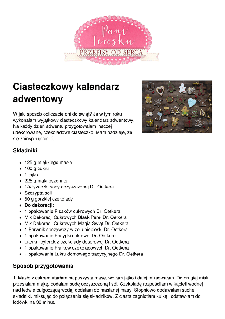 Ciasteczkowy kalendarz adwentowy W jaki sposób odliczacie dni do świąt? Ja w tym roku wykonałam wyjątkowy ciasteczkowy kalendarz adwentowy. Na każdy dzień adwentu przygotowałam inaczej udekorowane, czekoladowe ciasteczko. Mam nadzieje, że się zainspirujecie. :) Składniki 125 g miękkiego masła 100 g cukru 1 jajko 225 g mąki pszennej 1/4 łyżeczki sody oczyszczonej Dr. Oetkera Szczypta soli 60 g gorzkiej czekolady Do dekoracji: 1 opakowanie Pisaków cukrowych Dr. Oetkera Mix Dekoracji Cukrowych Blask Pereł Dr. Oetkera Mix Dekoracji Cukrowych Magia Świąt Dr. Oetkera 1 Barwnik spożywczy w żelu niebieski Dr. Oetkera 1 opakowanie Posypki cukrowej Dr. Oetkera Literki i cyferek z czekolady deserowej Dr. Oetkera 1 opakowanie Płatków czekoladowych Dr. Oetkera 1 opakowanie Lukru domowego tradycyjnego Dr. Oetkera Sposób przygotowania 1. Masło z cukrem utarłam na puszystą masę, wbiłam jajko i dalej miksowałam. Do drugiej miski przesiałam mąkę, dodałam sodę oczyszczoną i sól. Czekoladę rozpuściłam w kąpieli wodnej nad ledwie bulgoczącą wodą, dodałam do maślanej masy. Stopniowo dodawałam suche składniki, miksując do połączenia się składników. Z ciasta zagniotłam kulkę i odstawiłam do lodówki na 30 minut. 2. Piekarnik rozgrzałam do temperatury 180°C. Formę z wyposażenia piekarnika wyłożyłam papierem do pieczenia. 3. Na oprószonym mąką blacie rozwałkowałam schłodzone ciasto na grubość około 5 mm i wycięłam z niego świąteczne wzory. Jeśli Wasz kalendarz będziecie chcieli zawiesić na sznureczku, przed pieczeniem nie zapomnijcie o zrobieniu dziurki w ciastkach, najlepiej przy użyciu słomki. 4. Ciasteczka ułożyłam w sporych odstępach od siebie i piekłam około 12 minut. Po upieczeniu przełożyłam na kratkę do wystudzenia. 5. Do dekoracji ciasteczek użyłam szerokiej gamy dekoracji Dr. Oetkera. Ciasteczka dekorowałam głównie pisakami, które po rozgrzaniu w dłoniach są bardzo wygodne w użyciu. Każde ciasteczko zostało przez mnie ponumerowane i inaczej udekorowane, by każdego dnia adwentu móc cieszyć się inną niespodzianką.