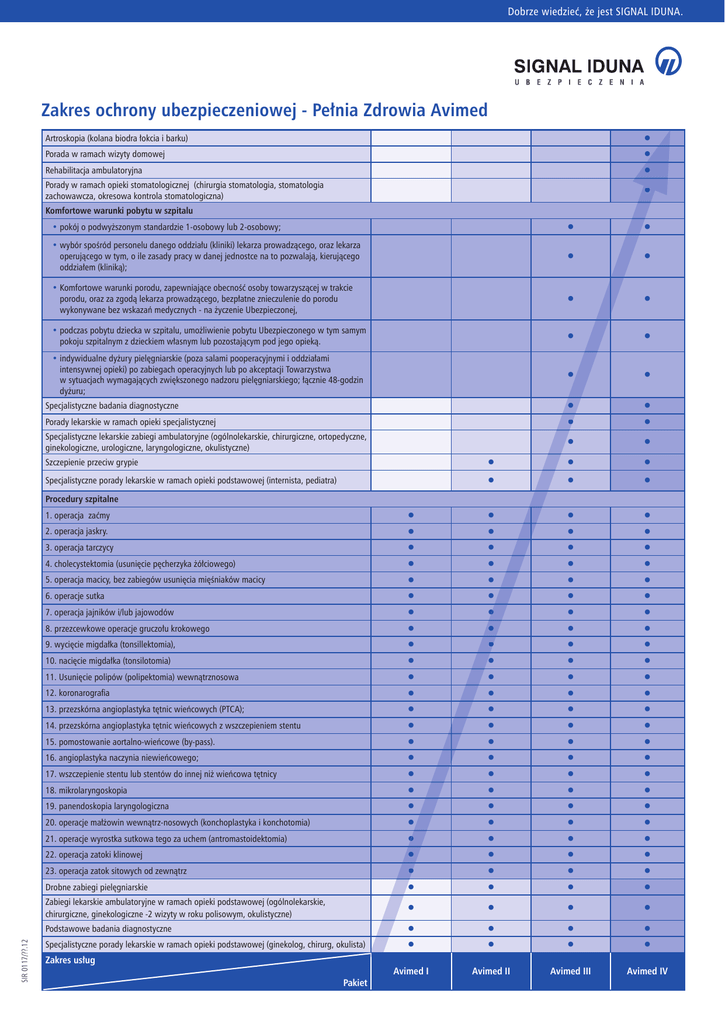 Dobrze wiedzieć, że jest SIGNAL IDUNA. Zakres ochrony ubezpieczeniowej - Pełnia Zdrowia Avimed • • • • Artroskopia (kolana biodra łokcia i barku) Porada w ramach wizyty domowej Rehabilitacja ambulatoryjna Porady w ramach opieki stomatologicznej (chirurgia stomatologia, stomatologia zachowawcza, okresowa kontrola stomatologiczna) Komfortowe warunki pobytu w szpitalu • pokój o podwyższonym standardzie 1-osobowy lub 2-osobowy; • • • wybór spośród personelu danego oddziału (kliniki) lekarza prowadzącego, oraz lekarza operującego w tym, o ile zasady pracy w danej jednostce na to pozwalają, kierującego oddziałem (kliniką); • • • Komfortowe warunki porodu, zapewniające obecność osoby towarzyszącej w trakcie porodu, oraz za zgodą lekarza prowadzącego, bezpłatne znieczulenie do porodu wykonywane bez wskazań medycznych - na życzenie Ubezpieczonej, • • • podczas pobytu dziecka w szpitalu, umożliwienie pobytu Ubezpieczonego w tym samym pokoju szpitalnym z dzieckiem własnym lub pozostającym pod jego opieką. • • • indywidualne dyżury pielęgniarskie (poza salami pooperacyjnymi i oddziałami intensywnej opieki) po zabiegach operacyjnych lub po akceptacji Towarzystwa w sytuacjach wymagających zwiększonego nadzoru pielęgniarskiego; łącznie 48-godzin dyżuru; • • • • • • • • • • • • • • • • • • • • • • • • • • • • • • • • • • • • • • • • • • • • • • • • • • • • • • • • • • • • • • • • • • • • • • • • • • • • • • • • • • • • • • • • • • • • • • • • • • • • • • • • • • • • • • • • • • • • • • • • • • Avimed I Avimed II Avimed III Avimed IV Specjalistyczne badania diagnostyczne Porady lekarskie w ramach opieki specjalistycznej Specjalistyczne lekarskie zabiegi ambulatoryjne (ogólnolekarskie, chirurgiczne, ortopedyczne, ginekologiczne, urologiczne, laryngologiczne, okulistyczne) Szczepienie przeciw grypie Specjalistyczne porady lekarskie w ramach opieki podstawowej (internista, pediatra) Procedury szpitalne 1. operacja zaćmy 2. operacja jaskry. 3. operacja tarczycy 4. cholecystektomia (usunięcie pęcherzyka żółciowego) 5. operacja macicy, bez zabiegów usunięcia mięśniaków macicy 6. operacje sutka 7. operacja jajników i/lub jajowodów 8. przezcewkowe operacje gruczołu krokowego 9. wycięcie migdałka (tonsillektomia), 10. nacięcie migdałka (tonsilotomia) 11. Usunięcie polipów (polipektomia) wewnątrznosowa 12. koronarografia 13. przezskórna angioplastyka tętnic wieńcowych (PTCA); 14. przezskórna angioplastyka tętnic wieńcowych z wszczepieniem stentu 15. pomostowanie aortalno-wieńcowe (by-pass). 16. angioplastyka naczynia niewieńcowego; 17. wszczepienie stentu lub stentów do innej niż wieńcowa tętnicy 18. mikrolaryngoskopia 19. panendoskopia laryngologiczna 20. operacje małżowin wewnątrz-nosowych (konchoplastyka i konchotomia) 21. operacje wyrostka sutkowa tego za uchem (antromastoidektomia) 22. operacja zatoki klinowej 23. operacja zatok sitowych od zewnątrz Drobne zabiegi pielęgniarskie Zabiegi lekarskie ambulatoryjne w ramach opieki podstawowej (ogólnolekarskie, chirurgiczne, ginekologiczne -2 wizyty w roku polisowym, okulistyczne) SIR 0117/??.12 Podstawowe badania diagnostyczne Specjalistyczne porady lekarskie w ramach opieki podstawowej (ginekolog, chirurg, okulista) Zakres usług Pakiet Komfortowe warunki hospitalizacji • • • • • • • • • • • • • operacja rekonstrukcyjna błony bębenkowej operacja mikroskopowo endoskopowa nosa i zatok operacja przegrody nosa plastyka stawów (kolana biodra łokcia i barku) wymiana stawu (kolana biodra łokcia i barku) Nieoperacyjne leczenie kamicy układu moczowego (ESWL) operacyjne leczenie kamicy układu moczowego; operacje macicy (wszystkie) operacje wysiłkowego nietrzymania moczu; operacje wysiłkowego nietrzymania moczu; operacja przepukliny brzusznej operacja żylaków kończyn dolnych i okolic odbytu. artroskopia (kolana biodra łokcia i barku) Procedury szpitalne • • • • • • • • • • • • • • • • • • • • • • • • • • • • • • • • • • • • • • • • • • • • • • • • • • • • • • • • • • • • • • • • • • • STANDARD MEDIUM MAXIMUM operacja zatok sitowych od zewnątrz operacja zatoki klinowej operacje wyrostka sutkowa tego za uchem (antromastoidektomia) operacje małżowin wewnątrz-nosowych (konchoplastyka i konchotomia) panendoskopia laryngologiczna mikrolaryngoskopia wszczepienie stentu lub stentów do innej niż wieńcowa tętnicy angioplastyka naczynia niewieńcowego; pomostowanie aortalno-wieńcowe (by-pass). przezskórna angioplastyka tętnic wieńcowych z wszczepieniem stentu przezskórna angioplastyka tętnic wieńcowych (PTCA); koronarografia Komfortowe warunki pobytu w szpitalu • Komfortowe warunki porodu, zapewniające obecność osoby towarzyszącej w trakcie porodu, oraz za zgodą lekarza prowadzącego, bezpłatne znieczulenie do porodu wykonywane bez wskazań medycznych - na życzenie Ubezpieczonej, • podczas pobytu dziecka w szpitalu, umożliwienie pobytu Ubezpieczonego w tym samym pokoju szpitalnym z dzieckiem własnym lub pozostającym pod jego opieką. • pokój o podwyższonym standardzie 1-osobowy lub 2-osobowy; • wybór spośród personelu danego oddziału (kliniki) lekarza prowadzącego, oraz lekarza operującego w tym, o ile zasady pracy w danej jednostce na to pozwalają, kierującego oddziałem (kliniką); Procedury szpitalne Usunięcie polipów (polipektomia) wewnątrznosowa nacięcie migdałka (tonsilotomia) wycięcie migdałka (tonsillektomia), przezcewkowe operacje gruczołu krokowego operacja jajników i/lub jajowodów operacje sutka operacj