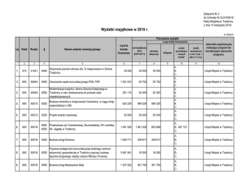 Załącznik Nr 3 do Uchwały Nr XLIV/438/10 Rady Miejskiej w Trzebnicy z dnia 10 listiopada 2010r. Wydatki majątkowe w 2010 r. w złotych Planowane wydatki z tego źródła finansowania Lp. Dział 1 2 Rozdz. 3 § Nazwa zadania inwestycyjnego 4 5 Wykonanie planów odnowy dla 12 miejscowości w Gminie Trzebnica 1. 010 01041 6050 2. 600 60004 6050 Utworzenie węzła komunikacyjnego PKS, PKP 3. 600 60004 Modernizacja budynku i terenu Dworca Kolejowego w 6050 Trzebnicy w celu dostosowania do potrzeb osób niepełnosprawnych 4. 600 60013 6300 5. 600 60013 6300 Projekt ścieżki rowerowej 6. 600 60016 7. 600 Łączne rok budżetowy koszty 2010 dochody finansowe (8+9+10+11) własne jst 6 7 8 30 000 30 000 30 000 1 021 812 50 752 50 752 281 174 93 300 93 300 624 225 569 325 569 325 50 000 50 000 50 000 6050 Przebudowa ulic Czereśniowej, Grunwaldzkiej, Wł. Łokietka, 6059 Wł. Jagiełły w Trzebnicy 1 461 026 1 461 026 60016 6050 Budowa drogi Koniowo 1 929 711 339 817 5 481 641 1 347 522 Budowa chodnika w miejscowości Cerekwica w ciągu drogi wojewódzkiej nr 340 8. 600 60016 Poprawa dostępności komunikacyjnej lokalnego centrum 6050 aktywności gospodarczej w Trzebnicy poprzez budowę łącznika drogowego między ulicami Milicką i Prusicką 9. 600 60016 6050 Budowa drogi Biedaszków Mały obligacje środki pochodzące z innych źródeł* środki wymienione w art. 5 ust. 1 pkt 2 i 3 u.f.p. 10 11 9 A. B. C. A. B. C. A. B. C. A. B. C. Jednostka organizacyjna realizująca program lub koordynująca wykonanie programu 12 Urząd Miejski w Trzebnicy Urząd Miejski w Trzebnicy Urząd Miejski w Trzebnicy Urząd Miejski w Trzebnicy A. B. C. Urząd Miejski w Trzebnicy 853 899 A. B. 607 127 C. Urząd Miejski w Trzebnicy 339 817 A. B. C. Urząd Miejski w Trzebnicy 16 000 16 000 A. B. C. Urząd Miejski w Trzebnicy 361 700 361 700 A. B. C. Urząd Miejski w Trzebnicy 1 2 3 4 5 10. 600 60016 6050 Projekt deptaku na ul. Daszyńskiego 11. 600 60016 6050 Modernizacja muru oporowego przy ul. Głowackiego i ul. Matejki 12. 600 60016 6059 Rewitalizacja ulic Leśnej i Korczaka oraz zagospodarowanie terenów przy stawach w Trzebnicy 13. 600 60016 6050 Projekt parkingu na ul. Polnej 14. 600 60016 6050 15. 600 60016 6050 Projekt przebudowy ul. Stawowej 16. 600 60016 6050 17. 600 60016 6050 Projekt drogi Cerekwica, Ujeździec Mały 18. 600 60016 6050 Przebudowa chodnika w Brzykowie 19. 600 60016 6050 20. 600 60016 6060 Zakup wiaty przystankowej 21. 630 63003 22. 630 63003 Modernizacja nawierzchni chodników oraz remont i budowa dróg gminnych Projekt drogi ul. Polnej w Trzebnicy na odcinku od M. Konopnickiej do ul. J. Słowackiego Projekt zatok Autobusowych przy ul. Ks. Bochenka w Trzebnicy Dokumentacja techniczna parkingów, punktów informacji 6050 turystycznej oraz małej architektury powstających w ramach projektu: Południowo-Zachodni Szlak Cystersów Utworzenie pieszych i rowerowych szlaków turystycznych 6059 wraz z niezbędną infrastrukturą w Lesie Bukowym w Trzebnicy. 6 7 8 70 000 70 000 70 000 52 000 52 000 52 000 3 534 000 2 018 436 753 041 6 600 6 600 6 600 300 000 300 000 300 000 15 616 15 616 15 616 50 000 40 728 40 728 41 256 41 256 41 256 160 000 160 000 160 000 4 700 4 700 4 700 25 000 25 000 25 000 92 833 24 400 24 400 450 000 450 000 450 000 9 10 A. B. C. A. B. C. A. 1 265 395 B. C. A. B. C. A. B. C. A. B. C. A. B. C. A. B. C. A. B. C. A. B. C. A. B. C. A. B. C. A. B. C. 11 12 Urząd Miejski w Trzebnicy Urząd Miejski w Trzebnicy Urząd Miejski w Trzebnicy Urząd Miejski w Trzebnicy Urząd Miejski w Trzebnicy Urząd Miejski w Trzebnicy Urząd Miejski w Trzebnicy Urząd Miejski w Trzebnicy Urząd Miejski w Trzebnicy Urząd Miejski w Trzebnicy Urząd Miejski w Trzebnicy Urząd Miejski w Trzebnicy Urząd Miejski w Trzebnicy 1 2 3 4 5 6 23. 630 63003 6059 Południowo - Zachodni Szlak Cysterski 24. 630 63003 6630 25. 700 70005 26. 754 27. 7 8 5 185 508 738 114 738 114 50 628 50 628 50 628 6050 Wykup gruntów 146 540 146 540 146 540 75404 Projekt Modernizacji budynku Komendy Powiatowej Policji w 6170 Trzebnicy w celu wzmocnienia formuły dostępności instytucji dla mieszkańców i turystów, oraz poprawy estetyki ciągu ul. 200 000 200 000 200 000 754 75411 6620 Dotacja celowa przekazana dla Państwowej Straży Pożarnej na modernizację boksów garaźowych 15 000 15 000 15 000 28. 754 75412 6050 Budowa remizy strażackiej w Marcinowie 860 000 461 714 461 714 29. 754 75414 6050 24 500 24 500 24 500 30. 754 75416 6060 Zakup samochodu dla Straży Miejskiej 65 000 65 000 65 000 31. 754 75416 6060 64 000 64 000 64 000 32. 801 80101 6050 Budowa hali sportowej przy SP3 w Trzebnicy 5 260 135 2 112 000 2 112 000 33. 801 80101 6050 Projekt boiska przy SP w Kuźniczysku 12 000 12 000 12 000 34. 801 80101 6050 Utworzenie szkolnego placu zabaw przy SP nr 3 219 014 219 014 219 014 35. 801 80101 6050 60 000 60 000 60 000 Dotacja celowa przekazana do samorządu województwa na inwestycje pn. "Południowo - Zachodni Szlak Cysterski" Zakup pakietu - Samorządowy Informator SMS - "Platforma komunikacji SMS w gminie" Zwiększenie bezpieczeństwa na drogach Gminy Trzebnica zakup fotolaseru Termomodernizacja budynku Boleścinie - wymiana okien Szkoły Podstawowej w 9 10 A. B. C. A. B. C. A. B. C. A. B. C. A. B. C. A. B. C. A. B. C. A. B. C. A. B. C. A. B. C. A. B. C. A. B. C. A. B. C. 11 12 Urząd Miejski w Trzebnicy Urząd Miejski w Trzebnicy Urząd Miejski w Trzebnicy Urząd Miejski w Trzebnicy Urząd Miejski w Trzebnicy Urząd Miejski w Trzebnicy Urząd Miejski w Trzebnicy Urząd Miejski w Trzebnicy Urząd Miejski w Trzebnicy Urząd Miejski w Trzebnicy Urząd Miejski w Trzebnicy Urząd Miejski w Trzebnicy Urząd Miejski w Trzebnicy 1 2 3 4 5 36. 801 80101 6050 Przebudowa łazienek w SP w Kuźniczysku 37. 801 80101 6050 38. 801 80101 6060 Zakup kserokopiarki dla SP w Masłowie 39. 801 80104 6050 Modernizacja Przedszkola nr 2 w Trzebnicy 40. 801 80104 6050 41. 801 80104 6050 Wykonanie monitoringu w Przedszkolu nr 1 42. 80