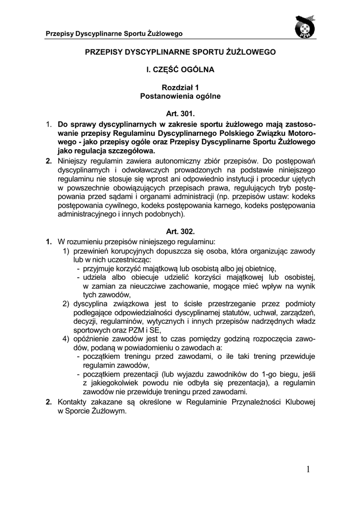 Przepisy Dyscyplinarne Sportu Żużlowego PRZEPISY DYSCYPLINARNE SPORTU ŻUŻLOWEGO I. CZĘŚĆ OGÓLNA Rozdział 1 Postanowienia ogólne Art. 301. 1. Do sprawy dyscyplinarnych w zakresie sportu żużlowego mają zastosowanie przepisy Regulaminu Dyscyplinarnego Polskiego Związku Motorowego - jako przepisy ogóle oraz Przepisy Dyscyplinarne Sportu Żużlowego jako regulacja szczegółowa. 2. Niniejszy regulamin zawiera autonomiczny zbiór przepisów. Do postępowań dyscyplinarnych i odwoławczych prowadzonych na podstawie niniejszego regulaminu nie stosuje się wprost ani odpowiednio instytucji i procedur ujętych w powszechnie obowiązujących przepisach prawa, regulujących tryb postępowania przed sądami i organami administracji (np. przepisów ustaw: kodeks postępowania cywilnego, kodeks postępowania karnego, kodeks postępowania administracyjnego i innych podobnych). Art. 302. 1. W rozumieniu przepisów niniejszego regulaminu: 1) przewinień korupcyjnych dopuszcza się osoba, która organizując zawody lub w nich uczestnicząc: - przyjmuje korzyść majątkową lub osobistą albo jej obietnicę, - udziela albo obiecuje udzielić korzyści majątkowej lub osobistej, w zamian za nieuczciwe zachowanie, mogące mieć wpływ na wynik tych zawodów, 2) dyscyplina związkowa jest to ścisłe przestrzeganie przez podmioty podlegające odpowiedzialności dyscyplinarnej statutów, uchwał, zarządzeń, decyzji, regulaminów, wytycznych i innych przepisów nadrzędnych władz sportowych oraz PZM i SE, 4) opóźnienie zawodów jest to czas pomiędzy godziną rozpoczęcia zawodów, podaną w powiadomieniu o zawodach a: - początkiem treningu przed zawodami, o ile taki trening przewiduje regulamin zawodów, - początkiem prezentacji (lub wyjazdu zawodników do 1-go biegu, jeśli z jakiegokolwiek powodu nie odbyła się prezentacja), a regulamin zawodów nie przewiduje treningu przed zawodami. 2. Kontakty zakazane są określone w Regulaminie Przynależności Klubowej w Sporcie Żużlowym. 1 Przepisy Dyscyplinarne Sportu Żużlowego Art. 303. 1. Organami właściwymi do orzekania w sprawach dyscyplinarnych są: 1) GKSŻ w stosunku do klubów, zawodników i działaczy - za wyjątkiem przypadków naruszenia przepisów dyscyplinarnych w związku z rozgrywkami Ekstraligi lub innymi prowadzonymi przez SE, 2) GKSŻ w stosunku do sędziów - w każdym wypadku, 3) SE w stosunku do klubów, zawodników i działaczy - w przypadku naruszenia przepisów dyscyplinarnych w związku z rozgrywkami Ekstraligi oraz innymi prowadzonymi przez SE. 2. Prawo składania wniosków do organów dyscyplinarnych o wszczęcie postępowania w stosunku do naruszających przepisy dyscyplinarne mają: GKSŻ, SE, Jury Zawodów, komisarz toru, władze klubów, działacze, zawodnicy i sędziowie. Rozdział 2 Szczególne rodzaje kar i środków dyscyplinarnych. Zasady karania Art. 304. Dodatkowymi karami dyscyplinarnymi w sporcie żużlowym są: 1) wykluczenie z zawodów lub ich części, 2) Wykluczenie z cyklu zawodów. Art. 305. 1. Dodatkowymi Środkami dyscyplinarnymi w sporcie żużlowym są: 1) anulowanie zdobytych przez zawodnika lub drużynę punktów, 2) walkower, 3) uznanie zawodów za niebyłe, 4) odszkodowanie pieniężne w związku z walkowerem, 5) zakaz organizacji jakichkolwiek zawodów, 6) zawieszenie lub utrata licencji określonego rodzaju, 7) skierowanie na powtórny egzamin, 8) skreślenie z kadry narodowej, 9) zakaz startów za granicą, 10) utrata nagród, 11) zwrot nienależnie pobranych świadczeń, 12) zwrot poniesionych nakładów i utraconych korzyści, 13) pozbawienie zawodnika lub zespołu sportowego tytułu mistrza kraju, medali albo tytułu zdobywcy nagrody PZM lub SE, 14) przeniesienie zespołu sportowego do niższej klasy rozgrywek, 15) zakaz reprezentowania sportu polskiego w zawodach międzynarodowych lub międzynarodowych rozgrywkach pucharowych, 16) nakaz określonego zachowania się lub wykonania określonych czynności, 17) zamknięcie stadionu, 18) zamknięcie dla publiczności stadionu lub jego części, 19) zakaz przyjmowania kibiców przyjezdnych, 2 Przepisy Dyscyplinarne Sportu Żużlowego 2. 3. 4. 5. 6. 7. 8. 20) odszkodowanie, 21) przyznanie punktów ujemnych, 22) przyznanie punktów dodatnich, 23) weryfikacja wyniku zawodów. Środek dyscyplinarny w postaci walkoweru może być orzeczona jedynie w przypadku meczu o mistrzostwo Polski lub nagrodę PZM / SE. Konsekwencje orzeczenia walkoweru określają przepisy niniejszego regulaminu tylko wtedy, gdy regulaminy rozgrywek na dany rok nie stanowią inaczej. Wskazane w ust. 1 środki dyscyplinarne organ dyscyplinarny może wymierzać w każdym przypadku obok kar i środków dyscyplinarnych orzeczonych na podstawie przepisów Części Szczegółowej niniejszego regulaminu. Zakres orzeczonych środków dyscyplinarnych określa organ dyscyplinarny w orzeczeniu dyscyplinarnym. Środek dyscyplinarny w postaci zawieszenia licencji danego rodzaju powoduje w okresie zawieszenia skutki tożsame z brakiem danej licencji. Środek dyscyplinarny w postaci nakazu określonego zachowania się lub wykonania określonych czynności obejmuje swym zakresem także zobowiązania do składania oświadczeń wiedzy oraz woli, a także wykonywania czynności związanych z wydatkami pieniężnymi. Środek dyscyplinarny w postaci przyznania punktów ujemnych polega na anulowaniu co najmniej jednego z dotychczas zdobytych punktów meczowych albo biegowych. Art. 306. 1. Zasady wymierzania i wykonania środka dyscyplinarnego: 1) w przypadkach, gdy przemawiają za tym okoliczności łagodzące: a) wykonanie środka dyscyplinarnego może być zawieszone na okres wskazany w orzeczeniu, przy czym okres zawieszenia nie może być krótszy niż 6 miesięcy a dłuższy niż 2 lata, b) organ dyscyplinarny ma prawo obniżyć dolną granicę stosowanego środka dyscyplinarnego maksymalnie o połowę, 2) zawieszony środek dyscyplinarny podlega wykonaniu, gdy w okresie zawieszeni