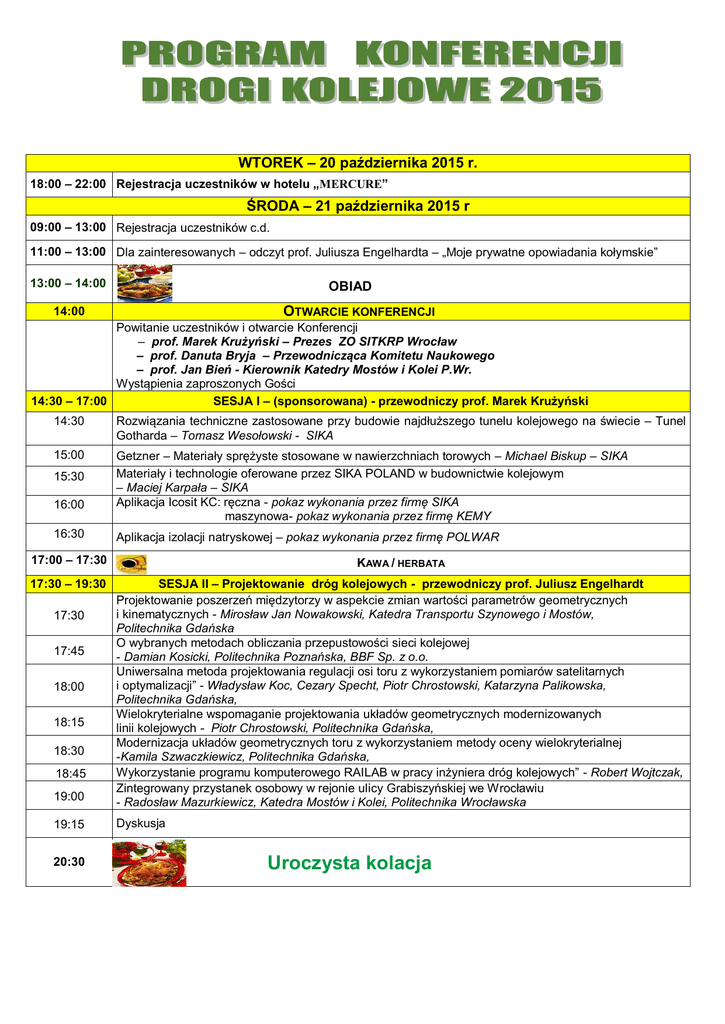 WTOREK – 20 października 2015 r. 18:00 – 22:00 Rejestracja uczestników w hotelu „MERCURE” ŚRODA – 21 października 2015 r 09:00 – 13:00 Rejestracja uczestników c.d. 11:00 – 13:00 Dla zainteresowanych – odczyt prof. Juliusza Engelhardta – „Moje prywatne opowiadania kołymskie” 13:00 – 14:00 OBIAD OTWARCIE KONFERENCJI Powitanie uczestników i otwarcie Konferencji – prof. Marek Krużyński – Prezes ZO SITKRP Wrocław – prof. Danuta Bryja – Przewodnicząca Komitetu Naukowego – prof. Jan Bień - Kierownik Katedry Mostów i Kolei P.Wr. Wystąpienia zaproszonych Gości 14:30 – 17:00 SESJA I – (sponsorowana) - przewodniczy prof. Marek Krużyński 14:00 14:30 Rozwiązania techniczne zastosowane przy budowie najdłuższego tunelu kolejowego na świecie – Tunel Gotharda – Tomasz Wesołowski - SIKA 15:00 Getzner – Materiały sprężyste stosowane w nawierzchniach torowych – Michael Biskup – SIKA Materiały i technologie oferowane przez SIKA POLAND w budownictwie kolejowym – Maciej Karpała – SIKA Aplikacja Icosit KC: ręczna - pokaz wykonania przez firmę SIKA maszynowa- pokaz wykonania przez firmę KEMY 15:30 16:00 16:30 Aplikacja izolacji natryskowej – pokaz wykonania przez firmę POLWAR 17:00 – 17:30 KAWA / HERBATA 17:30 – 19:30 19:00 SESJA II – Projektowanie dróg kolejowych - przewodniczy prof. Juliusz Engelhardt Projektowanie poszerzeń międzytorzy w aspekcie zmian wartości parametrów geometrycznych i kinematycznych - Mirosław Jan Nowakowski, Katedra Transportu Szynowego i Mostów, Politechnika Gdańska O wybranych metodach obliczania przepustowości sieci kolejowej - Damian Kosicki, Politechnika Poznańska, BBF Sp. z o.o. Uniwersalna metoda projektowania regulacji osi toru z wykorzystaniem pomiarów satelitarnych i optymalizacji” - Władysław Koc, Cezary Specht, Piotr Chrostowski, Katarzyna Palikowska, Politechnika Gdańska, Wielokryterialne wspomaganie projektowania układów geometrycznych modernizowanych linii kolejowych - Piotr Chrostowski, Politechnika Gdańska, Modernizacja układów geometrycznych toru z wykorzystaniem metody oceny wielokryterialnej -Kamila Szwaczkiewicz, Politechnika Gdańska, Wykorzystanie programu komputerowego RAILAB w pracy inżyniera dróg kolejowych” - Robert Wojtczak, Zintegrowany przystanek osobowy w rejonie ulicy Grabiszyńskiej we Wrocławiu - Radosław Mazurkiewicz, Katedra Mostów i Kolei, Politechnika Wrocławska 19:15 Dyskusja 17:30 17:45 18:00 18:15 18:30 18:45 20:30 Uroczysta kolacja CZWARTEK – 22 października 2015 r. 07:30 – 9:00 9:00 – 11:00 ŚNIADANIE SESJA III - Układy geometryczne dróg kolejowych – przewodniczy prof. Kazimierz Towpik 10:15 Zastosowanie mobilnych pomiarów satelitarnych do położenia wysokościowego torów - Cezary Specht, Władysław Koc, Piotr Chrostowski, Jacek Szmagliński, Politechnika Gdańska, Optymalizacja wielomianowych krzywych przejściowych z punktu widzenia wielkości zrywu - Piotr Woźnica, Politechnika Warszawska, Graniczna wichrowatość toru kolejowego - Zbigniew Kędra, Politechnika Gdańska, Modele mikrosymulacyjne sieci kolejowej w studiach wykonalności realizowanych dla PKP PLK S.A. - Michał Jasiak, Bartosz Uryga, Biuro Planowania Strategicznego PKP PLK S.A., Damian Kosicki, Politechnika Poznańska, BBF Sp. z o.o., Propozycja niekonwencjonalnego trasowania nowej linii tramwajowej - Jacek Makuch, Politechnika Wrocławska, Planowanie tras tramwajowych w miejskiej sieci ulic - Jeremi Rychlewski, Politechnika Poznańska, 10:30 Nowoczesne techniki pomiarowe w diagnostyce stanu toru” - Juliusz Grabczyk – GRAW Sp. z o.o. 9:00 9:15 9:30 9:45 10:00 Dyskusja 10:45 11:00 – 11:30 KAWA / HERBATA 13:15 SESJA IV – Dynamika dróg kolejowych - przewodniczy prof. Łucjan Siewczyński Analiza drgań pojazdów kolejowych w trakcie ich przejazdu przez nierówność progową toru - Danuta Bryja, Adam Popiołek, Politechnika Wrocławska, Wpływ parametrów technicznych izolacji antywibracyjnej podkładów strunobetonowych na ochronę antywibracyjną toru kolejowego - Ewelina Kwiatkowska, Politechnika Wrocławska, Parametry charakteryzujące izolatory wibroakustyczne stosowane w konstrukcji dróg szynowych - Cezary Kraśkiewicz, Cezary Lipko, Wojciech Oleksiewicz, Artur Zbiciak, Instytut Dróg i Mostów, Wydział Inzynierii Lądowej Politechnika Warszawska, Badania doświadczalne i symulacyjne rozwiązań konstrukcyjnych nawierzchni kolejowej do dużych prędkości - Kazimierz Towpik, Jacek Kukulski, Politechnika Warszawska Systemy bezpieczeństwa kolei jednoszynowych - Dominik Bednarek, Politechnika Wrocławska, Rozwój analitycznych i półanalitycznych metod badania dynamiki toru kolejowego – Włodzimierz Czyczuła, Politechnika Krakowska, Trwałość i niezawodność systemów masowo-sprężystych w torze kolejowym - Ralf Jurkewitz, Igor Gisterek - JORDAHL&PFEIFER Materiały wibroizolacyjne w nawierzchniach torowych”- Dariusz Kuta – MMR Trading Polska Gdynia, 13:30 Prezentacja firmy Bauchemie, 13:45 Dyskusja 11:30 – 14:00 11:30 11:45 12:00 12:15 12:30 12:45 13:00 14:00 – 15:00 15:00 – 17:15 OBIAD 16:45 SESJA V - Zagadnienia technologiczno- ekonomiczne –przewodniczy prof. Włodzimierz Czyczuła Aspekty społeczne i ekonomiczne związane z dynamiczną modernizacją infrastruktury szynowej w ujęciu technologii wymiany rozjazdów kolejowych - Jacek Paś, KZN BIEŻANÓW, Wpływ warunków techniczno - eksploatacyjnych na powstawanie i rozwój wad kontaktowo zmęczeniowych w szynach kolejowych - Jerzy Zariczny, Sławomir Grulkowski, Politechnika Gdańska, Identyfikacja ryzyk wynikających ze strategii szlifowania szyn w procesie utrzymania toru kolejowego - Sławomir Grulkowski, Jerzy Zariczny,Politechnika Gdańska Rozpoznawanie przyczyn wyboczeń torów - Henryk Bałuch; Iwona Nowosińska – Instytut Kolejnictwa, Skuteczność profilowania szyn w usuwaniu falistego zużycia - Grzegorz Stencel, Instytut Kolejnictwa, Technologia 