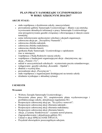 PLAN PRACY SAMORZĄDU UCZNIOWSKIEGO W ROKU SZKOLNYM 2016/2017 AKCJE STAŁE: stała współpraca z dyrektorem szkoły, nauczycielami; prowadzenie gabloty Samorządu Uczniowskiego i dbanie o jej estetykę; wywieszanie aktualnych informacji o pracy Samorządu Uczniowskiego oraz przygotowywanie gazetki związanej z obowiązującą w danym czasie tematyką; ustne informowanie społeczności szkolnej o akcjach organizacji; całoroczna akcja pn. „Szczęśliwy Numerek”; całoroczna zbiórka nakrętek; całoroczna zbiórka makulatury; całoroczna zbiórka baterii; spotkania Rady Samorządu Uczniowskiego z opiekunem (raz w miesiącu); współpraca z Radą Rodziców naszej szkoły; współpraca z fundacjami organizującymi akcje charytatywne, np.: akcja „ Pomóż i Ty”; udział w uroczystościach szkolnych - wystawienie pocztu sztandarowego; redagowanie gazetki szkolnej „Koszałek – Opałek”; dbałość o wystrój klas; prowadzenie akcji „Poczytaj mi ”; stała współpraca z organizacjami działającymi na terenie szkoły działania wynikające z aktualnej sytuacji. I SEMESTR Wrzesień Wybory Zarządu Samorządu Uczniowskiego ; Stworzenie planu pracy SU, zaopiniowanie planu wychowawczego i profilaktycznego szkoły, aktualizacja regulaminu SU; Rozpoczęcie całorocznej akcji pn. "Szczęśliwy numerek"; Rozpoczęcie całorocznej akcji zbierania nakrętek ; Rozpoczęcie całorocznej akcji zbierania makulatury; Rozpoczęcie całorocznej akcji zbierania baterii; Akcja „Czytamy Sienkiewicza”- czytanie nowel pisarza; Zagospodarowanie i aktualizacja gabloty SU; Udział w akcji SPRZĄTANIE ŚWIATA. Przydział obowiązków poszczególnym sekcjom. Październik Dzień Edukacji Narodowej – przygotowanie akademii; Akcja „Znicz” Listopad Narodowe Święto Niepodległości – poszukujemy świadków historii, udział w apelu, wystawienie pocztu sztandarowego; Andrzejki – dyskoteka szkolna; przygotowanie wieczoru wróżb; Włączenie się do akcji „Góra Grosza”; Konkurs wiedzy o Sienkiewiczu Udział w Ogólnopolskiej Olimpiadzie Mitologicznej. Grudzień • Kim jest Mikołaj?(gazetka). • Tradycje wigilijne w naszych domach –piszemy artykuły do gazetki szkolnej; Boże Narodzenie - udekorowanie choinki; przygotowanie plakatu świątecznego z życzeniami dla Rady Pedagogicznej i dla uczniów naszej szkoły; Styczeń Sporządzenie sprawozdania z pracy Samorządu Uczniowskiego za I semestr w roku szkolnym 2015/2016 Dzień Czekolady- uczniowie, którzy tego dnia się przebiorą za wybraną postać bajkową częstowani są czekoladą; Wywieszenie na tablicy SU wyników klasyfikacji i frekwencji. Dzień Babci i Dziadka – gazetka. Zorganizowanie przedstawienia jasełkowego dla mieszkańców wsi. Zabawa choinkowa z konkursami. Bezpieczne ferie – gazetka SEMESTR II Luty Akcja Walentynowa- poczta Amora; ubieramy się na czerwono; Marzec Dzień Kobiet – akcja kwiatek dla Pań i dziewczyn naszej szkoły; Zorganizowanie konkursu na najpiękniejszą wielkanocną dekorację klasową; Konkurs recytatorski „Twórczość Marii Konopnickiej” kl. I-III; kl. IV-VI Kwiecień Konkurs Ortograficzny „Ortofrajdek 2016”; Zainicjowanie akcji pn. "Wakacyjna oś czasu" – informowanie uczniów o ilości dni w szkole, które zostały do końca roku szkolnego; Obchody Dnia Ziemi – ubieramy się na zielono; wykonanie gazetki okolicznościowej; Udział w apelu z okazji rocznicy Uchwalenia Konstytucji 3-Maja; wystawienie pocztu sztandarowego. Maj Dzień Matki – życzenia; gazetka; Piknik Rodzinny, kiermasz prac. Dzień Patrona – akademia. Czerwiec Podsumowanie pracy Samorządu Uczniowskiego w roku szkolnym 2016/2017; Rozstrzygnięcie konkursów Przygotowanie gazetki ściennej na temat wakacji. Uroczyste Zakończenie roku szkolnego 2015/2016; wystawienie pocztu sztandarowego;