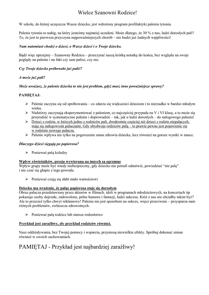 Wielce Szanowni Rodzice! W szkole, do której uczęszcza Wasze dziecko, jest wdrożony program profilaktyki palenia tytoniu. Palenie tytoniu to nałóg, na który jesteśmy najmniej uczuleni. Może dlatego, że 30 % z nas, ludzi dorosłych pali? To, że jest to pierwsza przyczyna najpoważniejszych chorób – nie budzi już żadnych wątpliwości! Nam natomiast chodzi o dzieci, o Wasze dzieci i o Twoje dziecko. Bądź więc uprzejmy – Szanowny Rodzicu – przeczytać naszą krótką notatkę do końca, bez względu na swoje poglądy na palenie i na fakt czy sam palisz, czy nie. Czy Twoje dziecko próbowało już palić? A może już pali? Może uważasz, że palenie dziecka to nie jest problem, gdyż masz inne poważniejsze sprawy? PAMIĘTAJ: Palenie zaczyna się od spróbowania – co zdarza się większości dzieciom i to nierzadko w bardzo młodym wieku. Niektórzy zaczynają eksperymentować z paleniem, co najczęściej przypada na V i VI klasę, a to może się przerodzić w systematyczne palenie i doprowadzić – tak, jak u ludzi dorosłych – do nałogowego palenia! Dzieci z rodzin, w których jedno z rodziców pali, dwukrotnie częściej niż dzieci z rodzin niepalących, stają się nałogowymi palaczami. Gdy obydwoje rodziców palą – to prawie pewne jest pojawienie się w rodzinie nowego palacza. Palenie wpływa nie tylko na pogorszenie stanu zdrowia dziecka, lecz również na gorsze wyniki w nauce. Dlaczego dzieci sięgają po papierosa? Ponieważ palą koledzy Wpływ rówieśników, presja wywierana na innych są ogromne Wpływ grupy może być wtedy niebezpieczny, gdy dziecko nie potrafi odmówić, powiedzieć “nie palę” i nie czuć się głupio z tego powodu. Ponieważ czują się słabi mało wartościowi Dziecko ma wrażenie, że paląc papierosa staje się dorosłym Obraz palacza przedstawiony przez aktorów w filmach, idoli w programach młodzieżowych, na koncertach itp pokazuje osoby dojrzałe, zadowolone, pełne humoru i fantazji, ludzi sukcesu. Któż z nas nie chciałby takim być? Ale to przecież tylko chwyt reklamowy! Palenie nie jest sposobem na sukces, wręcz przeciwnie – przysparza nam różnych problemów, zwłaszcza zdrowotnych. Ponieważ palą rodzice lub starsze rodzeństwo Przykład jest zaraźliwy, zły przykład rodziców również. Nasz oddziaływania, bez Twojej pomocy i wsparcia, przyniosą niewielkie efekty. Spróbuj dokonać zmian również w swoich zachowaniach. PAMIĘTAJ - Przykład jest najbardziej zaraźliwy!