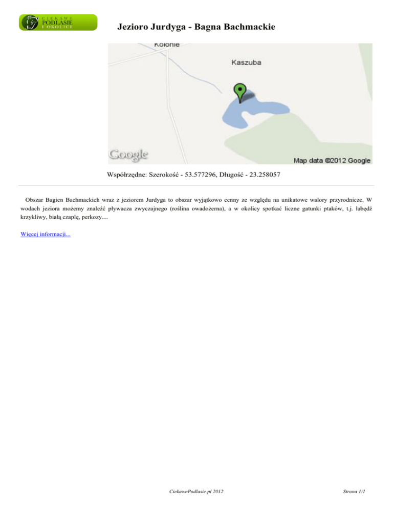 Jezioro Jurdyga - Bagna Bachmackie Współrzędne: Szerokość - 53.577296, Długość - 23.258057 Obszar Bagien Bachmackich wraz z jeziorem Jurdyga to obszar wyjątkowo cenny ze względu na unikatowe walory przyrodnicze. W wodach jeziora możemy znaleźć pływacza zwyczajnego (roślina owadożerna), a w okolicy spotkać liczne gatunki ptaków, t.j. łabędź krzykliwy, białą czaplę, perkozy.... Więcej informacji... CiekawePodlasie.pl 2012 Strona 1/1