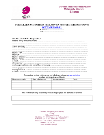 Ośrodek Badawczo Rozwojowy Małgorzaty Stawarz Elipsa FORMULARZ ZAMÓWIENIA REKLAMY NA PORTALU INTERNETOWYM WWW.GETJOB.PL Z DNIA.................................... NR …....................................... DANE ZAMAWIAJĄCEGO: Nazwa firmy/ Imię i nazwisko ......................................................................................... …......................................................................................................................................... …......................................................................................................................................... Adres siedziby …............................................................................................................... ….......................................................................................................................................... ….......................................................................................................................................... Numer NIP …...................................................................................................................... REGON …........................................................................................................................... Numer telefonu …............................................................................................................. Numer Faksu .................................................................................................................... e-mail …............................................................................................................................ strona www …................................................................................................................... osoba upoważniona do kontaktu z wydawcą …............................................................ …........................................................................................................................................ numer telefonu ….............................................................................................................. e-mail …............................................................................................................................. Zamawiam emisję reklamy na portalu internetowym www.getjob.pl według poniższej specyfikacji: Data rozpoczęcia Data zakończenia Nazwa reklamy Opcje Inna forma reklamy ustalona podczas negocjacji, nie zawarta w ofercie: ___________________________________________________________________ Ośrodek Badawczo Rozwojowy „Elipsa” Małgorzata Stawarz Siedziba: 30 - 834 Kraków, ul. Kallimacha 5/1 NIP: 944-134-71-86, REGON: 120902818 Biuro: 30 – 819 Kraków, ul. Górników 13 mobile: 510 164 707 www.osrodek-elipsa.pl Ośrodek Badawczo Rozwojowy Małgorzaty Stawarz Elipsa Uwagi Zamawiającego: ___________________________________________________________________ Koszt emisji reklamy – podany w kwocie netto ( według cennika, lub po indywidualnych uzgodnieniach): Nazwa Reklamy Kwota netto Kwota brutto W tym vat 22% SUMA: Zamawiający zobowiązuje się do udostępnienia wszelkich materiałów niezbędnych do emisji reklamy (banerów, zdjęć, tekstów), przydatnych wydawcy do sporządzenia skutecznej reklamy. Wypełniony i podpisany formularz zamówienia należy dostarczyć nie później niż 10 dni przed pierwszym dniem emisji zamówionej reklamy na adres: OŚRODEK BADAWCZO – ROZWOJOWY „ELIPSA” MAŁGORZATA STAWARZ, 30-834 Kraków, ul. Kallimacha 5/1, lub drogą e-mail: [email protected] OŚWIADCZENIE ZAMAWIAJĄCEGO Zapoznałem się z regulaminem zamieszczania reklam na portalu internetowym www.getjob.pl oraz upoważniam firmę OŚRODEK BADAWCZO-ROZWOJOWY ”ELIPSA” MAŁGORZATA STAWARZ, do wystawienia faktury VAT bez podpisu odbiorcy. Podpis i Pieczęć Zamawiającego ….............................................. ___________________________________________________________________ Ośrodek Badawczo Rozwojowy „Elipsa” Małgorzata Stawarz Siedziba: 30 - 834 Kraków, ul. Kallimacha 5/1 NIP: 944-134-71-86, REGON: 120902818 Biuro: 30 – 819 Kraków, ul. Górników 13 mobile: 510 164 707 www.osrodek-elipsa.pl