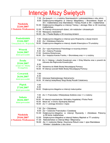 Intencje Mszy Świętych 7.30 Za Ŝywych i ++ z rodziny Szeniawskich i pokrewieństwa z obu stron 9.00 Dziękczynno-błagalna w intencji Magdaleny i Bronisława Sopel w 30 r. małŜeństwa oraz Stanisława i Teresy Kozik w 36 r. małŜeństwa Niedziela 10.30 Dziękczynno-błagalna w intencji Teresy i Jerzego Stec w 30 rocznicę 22.04.2007 małŜeństwa 3 Niedziela Wielkanocna 12.00 W intencji chrzczonych dzieci, ich rodziców i chrzestnych 17.30 Nieszpory niedzielne 18.00 Za + Pawła Bojdę w 20 rocznicę śmierci Poniedziałek 23.04.2007 7.00 Dziękczynno-błagalna w intencji syna Wojciecha z okazji imienin 8.30 Za + Zdzisława Kielocha Uroczystość św. Wojciecha 18.00 Dziękczynno-błagalna w intencji Józefa Wawrzyka w 75 urodziny Wtorek 24.04.2007 dzień powszedni Środa 25.04.2007 święto św. Marka Ewangelisty Czwartek 26.04.2007 dzień powszedni Piątek 27.04.2007 dzień powszedni Sobota 28.04.2007 dzień powszedni 7.00 8.30 17.00 18.00 Za + ojca Kazimierza Potockiego w rocznicę śmierci Za + Adama Przybyłę Godzina RóŜańcowa Za + księdza Karola Franka, + Bronisławę oraz ++ z rodziny 7.00 Za ++ Helenę i Józefa Kowalczyk oraz + Erkę Nitsche oraz o powrót do zdrowia dla Rajmunda Kowalczyka 8.30 17.30 Nowenna do Matki BoŜej Nieustającej Pomocy 18.00 W intencji czcicieli Matki BoŜej Nieustającej Pomocy 7.00 8.30 17.00 Adoracja Najświętszego Sakramentu 18.00 W intencji beatyfikacji Sługi BoŜej Rozalii Celakówny 7.00 8.30 18.00 Dziękczynno-błagalna w intencji maturzystów 7.00 8.30 16.00 16.00 18.00 Za ++ Franciszka i Władysławę Sobków oraz ++ z rodziny W intencji nowoŜeńców: Michaliny Argalskiej i Piotra Pecki Msza św. w Domu Spokojnej Starości Za ++ Jadwigę Smolorz i męŜa 7.30 Za + Zdzisława 9.00 Za + rodziców Franciszka i Czesławę 10.30 Dziękczynno-błagalna w intencji Ryszardy i Zdzisława Pokorny Niedziela w 50 lecie małŜeństwa 12.00 Dziękczynno-błagalna w intencji Heleny Mędrek w 77 urodziny 29.04.2007 4 Niedziela Wielkanocna 17.30 NaboŜeństwo w intencji Misji i Misjonarzy 18.00 Za ++ rodziców Marię i Szymona Rduch oraz + ojca Stanisława Winkler i dziadków z obu stron