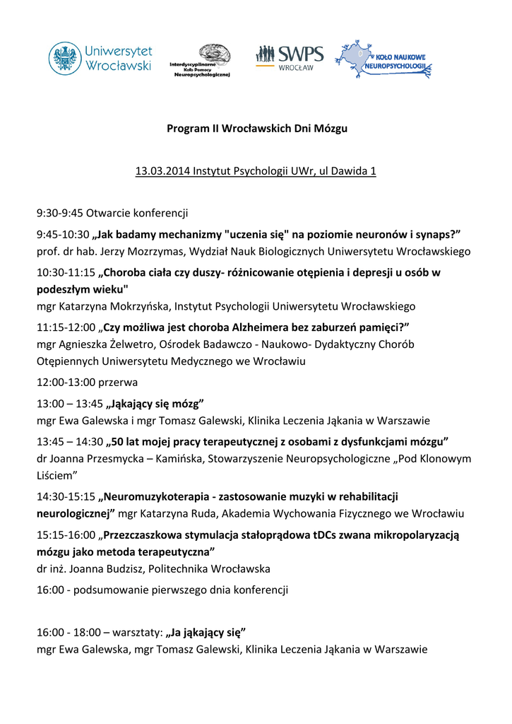 Program II Wrocławskich Dni Mózgu 13.03.2014 Instytut Psychologii