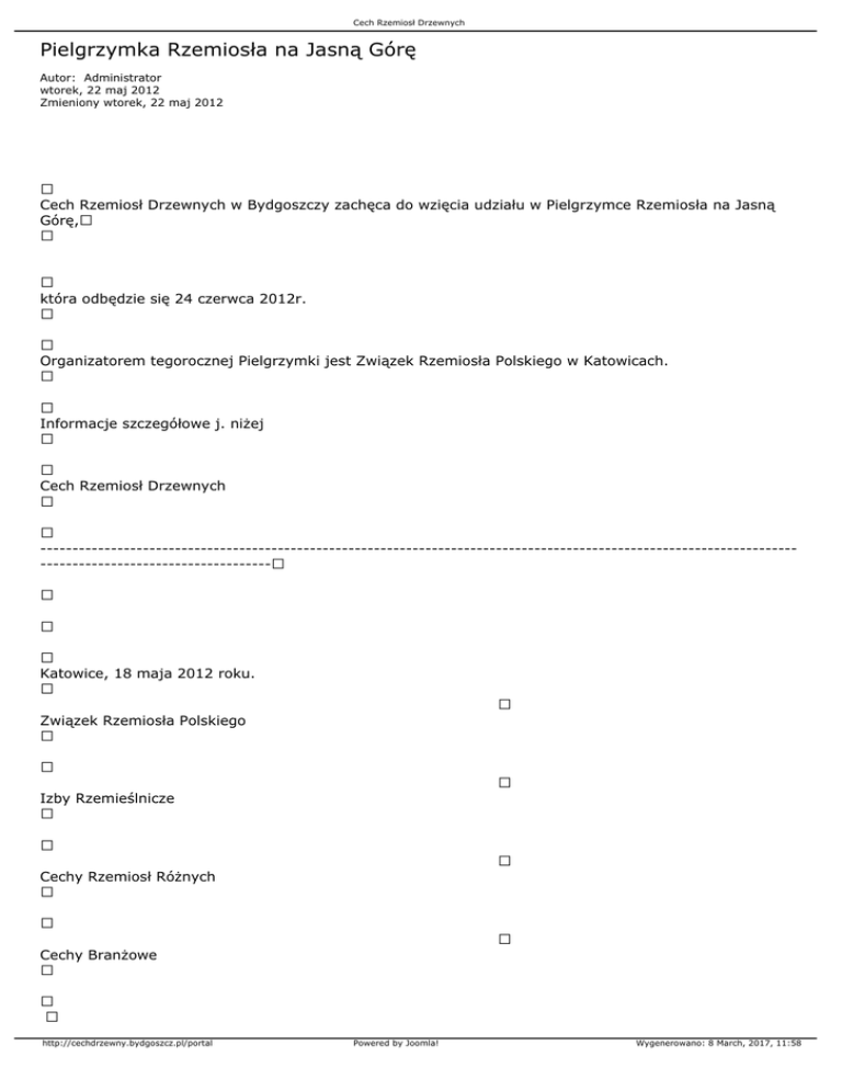 Cech Rzemiosł Drzewnych Pielgrzymka Rzemiosła na Jasną Górę Autor: Administrator wtorek, 22 maj 2012 Zmieniony wtorek, 22 maj 2012 Cech Rzemiosł Drzewnych w Bydgoszczy zachęca do wzięcia udziału w Pielgrzymce Rzemiosła na Jasną Górę, która odbędzie się 24 czerwca 2012r. Organizatorem tegorocznej Pielgrzymki jest Związek Rzemiosła Polskiego w Katowicach. Informacje szczegółowe j. niżej Cech Rzemiosł Drzewnych --------------------------------------------------------------------------------------------------------------------------------------------------------- Katowice, 18 maja 2012 roku. Związek Rzemiosła Polskiego Izby Rzemieślnicze Cechy Rzemiosł Różnych Cechy Branżowe http://cechdrzewny.bydgoszcz.pl/portal Powered by Joomla! Wygenerowano: 8 March, 2017, 11:58 Cech Rzemiosł Drzewnych Szanowni Państwo, Uprzejmie informujemy, że Izba Rzemieślnicza oraz Małej i Średniej Przedsiębiorczości w Katowicach jest organizatorem tegorocznej, XXXI Ogólnopolskiej Pielgrzymki Rzemiosła na Jasną Górę, która odbędzie się 24 czerwca 2012 roku w Częstochowie. Uroczystości odbędą się według następującego porządku: 9:45 Zbiórka uczestników pielgrzymki (Aleja Henryka Sienkiewicza, przed Szczytem Jasnogórskim) 10:00 Wprowadzenie Starszyzny Cechowej oraz Pocztów Sztandarowych przez Ojca Jana Golonkę 10:30 Uhonorowanie mistrzów rzemiosła oraz uczniów (na Szczycie Jasnogórskim) 11:05 Złożenie kwiatów pod pomnikiem Bł. Jana Pawła II 11:15 Msza Święta koncelebrowana przez Ks. Arcybiskupa Wiktora Skworca – Metropolitę Katowickiego 13:15 Przejście ze sztandarami przed Obrazem Matki Boskiej Częstochowskiej Organizacje lub osoby prywatne, które zechcą wesprzeć finansowo organizację pielgrzymki prosimy o przesłanie środków pieniężnych na specjalnie wydzielone w tym celu konto nr 54 1020 2313 0000 3202 0212 2927. Informujemy, że odmiennie niż w poprzednich latach, uroczystości wręczenia dyplomów wskazanym przez Izby mistrzom i ich uczniom, odbędą się na Szczycie Jasnogórskim, bezpośrednio przed rozpoczęciem Mszy Świętej. http://cechdrzewny.bydgoszcz.pl/portal Powered by Joomla! Wygenerowano: 8 March, 2017, 11:58 Cech Rzemiosł Drzewnych Ze względu na prowadzone w Częstochowie prace modernizacyjne zrezygnowaliśmy z przemarszu i prosimy Państwa o zbiórkę pod Szczytem Jasnogórskim o godzinie 9:45. Będziemy wdzięczni za punktualność. Jednocześnie nowym punktem obchodów uroczystości będzie złożenie kwiatów pod pomnikiem błogosławionego Ojca Świętego Jana Pawła II (co nastąpi bezpośrednio przed rozpoczęciem Mszy Świętej). W tym roku pielgrzymom – rzemieślnikom, ich rodzinom, osobom bliskim, pracownikom oraz innym osobom związanym z naszym środowiskiem towarzyszyć będzie po raz pierwszy w historii Zespół Pieśni i Tańca „Śląsk” im. Stanisława Hadyny. Uroczystość uświetni również górniczy zespół wystawiony przez Katowicki Holding Węglowy S.A. Uprzejmie prosimy wszystkie organizacje, które zamierzają poświęcić insygnia rzemieślnicze o kontakt bezpośrednio z naszą organizacją. Osoby odpowiedzialne za pielgrzymkę: - sprawy finansowe – Izabela Staciwa, tel.: 32 259 62 61 wew. 118, e-mail: [email protected]; - sprawy logistyczne – Katarzyna Maciejska, tel.: 32 259 62 61 wew. 119, e-mail: [email protected]. Będziemy wdzięczni za zachęcenie rzemieślników zrzeszonych w Państwa Organizacji do wzięcia http://cechdrzewny.bydgoszcz.pl/portal Powered by Joomla! Wygenerowano: 8 March, 2017, 11:58 Cech Rzemiosł Drzewnych udziału w tegorocznej pielgrzymce. Czas jest wyjątkowy i wymaga szczególnej jedności naszego środowiska. Z wyrazami szacunku Michał Wójcik Jan Klimek Dyrektor Naczelny IR MSP Katowice Prezes Zarządu IR MSP Katowice ----------------------------------------------------------------------------------------------------------------------------------------------------------------- http://cechdrzewny.bydgoszcz.pl/portal Powered by Joomla! Wygenerowano: 8 March, 2017, 11:58