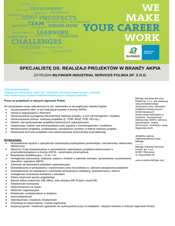 SPECJALISTĘ DS. REALIZAJI PROJEKTÓW W BRANŻY AKPIA ZATRUDNI BILFINGER INDUSTRIAL SERVICES POLSKA SP. Z O.O. OPIS STANOWISKA Objęcie ww. stanowiska wiąże się z nadzorem nad wykonaniem serwisu, remontu oraz modernizacji urządzeń elektroenergetycznych u naszych Klientów. Praca na projektach w różnych regionach Polski. Do obowiązków osoby zatrudnionej na ww. stanowisku w szczególności należeć będzie: Opracowywanie ofert, w tym kalkulacja kosztów w branży AKPiA, Udział w negocjacjach z Klientami, Opracowywanie wymaganej dokumentacji realizacji projektu, w tym harmonogramu i budżetu, Opracowywanie planów realizacji projektów (tj. POR, BIOZ, POŚ, PZJ itp.), Nadzór nad opracowaniem projektów technicznych wykonawczych, Organizacja i nadzór nad wykonawstwem prac zgodnie z harmonogramem i budżetem, Monitorowanie projektów, analizowanie i zarządzanie ryzykiem w trakcie realizacji projektu, Rozliczanie końcowe projektów oraz opracowywanie dokumentacji poprojektowej. Bilfinger Industrial Services Polska Sp. z o.o. jest dostawcą usług kompleksowego utrzymania ruchu, remontów, projektów inwestycyjnych i modernizacyjnych. Nasze usługi realizujemy w branżach: mechanicznej, elektrycznej i AKPIA, obmurzy ogniotrwałych, izolacji termicznych, rusztowań i usług diagnostycznych. Jesteśmy częścią międzynarodowej Grupy Bilfinger. –––––– Bilfinger Industrial Services Polska Sp. z o.o. 02-981 Warszawa ul. Augustówka 24 WYMAGANIA: Wykształcenie wyższe o specjalności automatyka przemysłowa (automatyka, mechatronika, elektronika, elektryczny) Minimum 3 lata doświadczenia w samodzielnym realizowaniu projektów technicznych w przemyśle/energetyce w branży AKPiA - automatyka przemysłowa Świadectwo Kwalifikacyjne – D do 1 kV Umiejętność planowania, realizacji, nadzoru i kontroli w zakresie montażu, sprawdzania i uruchamiania www.is-polska.bilfinger.com obwodów i aparatury AKPiA Zdolności do kierowania zespołami wykonawczymi Doświadczenie w prowadzeniu i nadzorowaniu prac lub praktyka w zakresie zarządzania projektami. Doświadczenie we współpracy z partnerami biznesowymi (dostawcy, podwykonawcy, klienci). Umiejętność budowania kontaktów z klientami Dobra znajomość języka angielskiego Bardzo dobra znajomość: MS Office, mile widziany MS Project i AutoCAD. Świadomość biznesowa Ukierunkowanie na wyniki Zdolności organizacyjne Rzetelność i profesjonalizm w działaniu Komunikatywność Operatywność, inicjatywa, kreatywność Orientacja na doskonalenie i rozwój organizacji Dyspozycyjność i mobilność (gotowość do wykonywania pracy na obiektach naszych klientów w różnych regionach Polski) SPECJALISTĘ DS. REALIZAJI PROJEKTÓW W BRANŻY AKPIA ZATRUDNI BILFINGER INDUSTRIAL SERVICES POLSKA SP. Z O.O. DODATKOWYMI ATUTAMI BĘDĄ: Przygotowanie teoretyczne i praktyczne w zakresie zarządzania projektami (PMI, PRINCE2 lub inne np. studia podyplomowe) Znajomość metodologii kosztorysowania (KNR, NORMA) Znajomość obowiązujących norm i przepisów w zakresie kompletności projektów w branży AKPiA Znajomość norm, przepisów i rozwiązań obwodów AKPiA do stref zagrożonych wybuchem (Ex) Umiejętność nadzoru nad montażem i sprawdzaniem układów pomiarów, sygnalizacji, zabezpieczeń, sterowań i regulacji automatycznej obiektów technologicznych Umiejętność nadzoru nad montażem, sprawdzeniem i kalibracją urządzeń i obwodów: - napędów elektrycznych, siłowników z przekładniami mechanicznymi, napędów elektrycznych falownikowych - układów sygnalizacji, zabezpieczeń, sterowania i zasilania - układów automatycznej regulacji - wskaźników, mierników, przetworników, rejestratorów, zasilaczy, TV przemysłowa, instalacje alarmowe Umiejętność nadzoru nad montażem i sprawdzaniem pomiarów specjalnych (drgania, przesunięcia) i pomiarów fizyko-chemicznych (pomiary fizyko-chemiczne cieczy, analizatory gazów, pyłomierze, itp.) OFERUJEMY: Możliwość rozwoju zawodowego w międzynarodowej firmie Stabilne zatrudnienie na umowę o pracę Rynkowe wynagrodzenie, adekwatne do posiadanych kwalifikacji i uzyskiwanych wyników pracy Szeroki pakiet świadczeń socjalnych Wysokie standardy bezpieczeństwa i higieny pracy Bilfinger Industrial Services Polska Sp. z o.o. jest dostawcą usług kompleksowego utrzymania ruchu, remontów, projektów inwestycyjnych i modernizacyjnych. Nasze usługi realizujemy w branżach: mechanicznej, elektrycznej i AKPIA, obmurzy ogniotrwałych, izolacji termicznych, rusztowań i usług diagnostycznych. Jesteśmy częścią międzynarodowej Grupy Bilfinger. –––––– Bilfinger Industrial Services Polska Sp. z o.o. 02-981 Warszawa ul. Augustówka 24 www.is-polska.bilfinger.com Osoby zainteresowane podjęciem pracy w naszej firmie prosimy o przesłanie CV i listu motywacyjnego. Aplikacje można wysłać w formie elektronicznej na adres e-mail: [email protected] z dopiskiem „KRR-Automatyka“. Uprzejmie informujemy, że zastrzegamy sobie prawo kontaktu wyłącznie z wybranymi kandydatami. Prosimy o dołączenie następującej klauzuli: Wyrażam zgodę na przetwarzanie danych osobowych zawartych w mojej ofercie pracy dla potrzeb niezbędnych do realizacji rekrutacji zgodnie z ustawą z dnia 29.08.1997 o ochronie danych osobowych (Dz. U. z 2002 r. Nr 101, poz. 926 z poz. zm.).