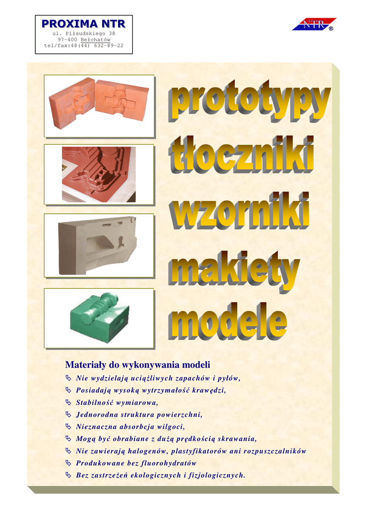 ul. Piłsudskiego 38 97-400 Bełchatów tel/fax:48(44) 632-89-22 Materiały do wykonywania modeli Nie wydzielaj uci Posiadaj Stabilno liwych zapachów i pyłów, wysok wytrzymało kraw dzi, wymiarowa, Jednorodna struktura powierzchni, Nieznaczna absorbcja wilgoci, Mog by obrabiane z du Nie zawieraj pr dko ci skrawania, halogenów, plastyfikatorów ani rozpuszczalników Produkowane bez fluorohydratów Bez zastrze e ekologicznych i fizjologicznych. Materiały w płytach i blokach do modelowania, wyrobu narz dzi, zamocowa i uchwytów Własno ci • całkowicie homogeniczna struktura i jako • stabilno powierzchni wymiarów • praktycznie nie trac zabarwienia • du a stabilno kraw dzi • małe wchłanianie wilgoci • nieograniczony okres przechowywania w poło eniu płaskim w suchej atmosferze Zalety: dobra obrabialno standardowe narz dzia do obróbki drewna lub metalu brak emisji pyłów bez zapachu fizjologicznie nieszkodliwe nie niszcz narz dzi, nie zawieraj ciernych wypełniaczy nie rozszczepiaj si dobrze znosz du e pr dko ci ci cia dobra sklejalno naprawialno szpachlami uszczelnianie zwykłymi wypełniaczami natryskowymi lakierowanie 2-składnikowym gruntem i dodatkow warstw nawierzchniow na bazie poliuretanu zgodnie ze specyfikacjami dla form mikrokomórkowych Produkt Zastosowanie ebazell 80 modele, prototypy, modele architektoniczne. wzmocnienie konstrukcji, próby programów frezowania ebazell 100 ebazell 160 ebazell 250 ebazell 260 ebazell 350 ebaboard L modele wzornicze, modele stylizacyjne, modele architektoniczne, do projektowania i prac artystycznych, konstrukcje wzmacniaj ce, próby programów frezowania modele prototypowe i stylizacyjne, modele architektoniczne, konstrukcje wzmacniaj ce, próby programów frezowania modele prototypowe i stylizacyjne, modele architektoniczne, konstrukcje wzmacniaj ce, próby programów frezowania modele wzorcowe i stylizacyjne, modele architektoniczne, do projektowania i prac artystycznych modele prototypowe i stylizacyjne, modele architektoniczne, konstrukcje wzmacniaj ce, do projektowania i prac artystycznych modele wzorcowe i stylizacyjne, modele architektoniczne, konstrukcje wzmacniaj ce Kolor Wymiary handlowe (mm) Twardo Shore D Wytrz. na ciskanie (N/mm2) Wytrz. na zginanie (N/mm2) be owy 2000 x 1250 x 100 2000 x 1250 x 200 2000 x 1250 x 300 2000 x 1250 x 400 ok. 30 ok. 8,6 ok. 12 ok. 0,08 ok. 58 ok. 80ºC be owy 2000 x 1000 x 100 2000 x 1000 x 200 ok. 35 ok. 1,2 ok. 1,2 ok. 0,10 ok. 50 ok. 105ºC jasnozielony 2000 x 1000 x 100 2000 x 1000 x 200 2000 x 1000 x 300 ok. 70 ok. 2,6 ok. 2,6 ok. 0,16 ok. 39 ok. 120ºC jasnoszary 1500 x 400 x 100 ok. 4,9 ok. 4,0 ok. 0,25 ok. 30 ok. 65ºC szary 2000 x 1000 x 100 2000 x 1000 x 200 ok. 4,8 ok. 2,6 ok. 0,25 ok. 40 ok. 65ºC szary 1500 x 400 x 100 ok. 7 ok. 7,5 ok. 0,35 ok. 30 ok. 75ºC ółtobrunatny 1500 x 500 x 50 1500 x 500 x 100 1500 x 500 x 200 ok. 10 ok. 10 ok. 0,40 ok. 40-60 ok. 65ºC ok. 70 współczynnik temp. G sto rozszerzalno ci odkształcania 3 (kg/dm ) cieplnego cieplnej (10-6K-1) Produkt Zastosowanie ebaboard 60 prototypy, modele architektoniczne, projektowanie i kopiowanie modeli br zowy ebaboard S prototypy, modele architektoniczne, projektowanie i kopiowanie modeli br zowy modele wzorcowe, modele stylizacyjne, wzorniki modele odlewnicze, br zowy szary ró owy ebablock M 007 ebablock K modele do laminowania, ebaboard PW 920 modele odlewnicze i do k pieli, zamocowania i uchwyty, ebablock A ebablock G ebablock alu modele wzorcowe, modele stylizacyjne, wzorniki prototypy, modele i narz dzia do laminowania narz dzia do formowania pró niowego, modele Kolor zielony Twardo Shore D Wytrz. na ciskanie (N/mm2) Wytrz. na zginanie (N/mm2) ok.60- 65 ok. 20 ok. 15 ok. 0,60 ok. 50-55 ok. 70-80ºC ok. 65 ok. 24 ok. 15 ok. 0,70 ok. 55 ok. 75ºC na zapytanie ok. 67 ok. 34 ok. 29 ok. 0,74 ok. 65-70 ok. 45ºC na zapytanie 1500 x 500 x 30 1500 x 500 x 50 1500 x 500 x 75 1500 x 500 x 100 ok. 65 ok. 21 ok. 18 ok. 1,20 ok.163 ok. 80 ok. 50 ok. 44 ok. 1,21 ok. 85 Wymiary handlowe (mm) 1500 x 500 x 25 1500 x 500 x 50 1500 x 500 x 75 1500 x 500 x 100 1500 x 500 x 200 1500 x 400 x 50 1500 x 400 x 100 1500 x 500 x 25 1500 x 500 x 50 1500 x 500 x 75 1500 x 500 x 100 1500 x 500 x 150 1500 x 500 x 200 współczynnik temp. G sto rozszerzalno ci odkształcania (kg/dm3) cieplnego cieplnej (10-6K-1) ok. 95ºC be owy na zapytanie ok. 71 ok. 35 ok. 30 ok. 1,37 ok. 70-80 be owy na zapytanie ok. 76 ok. 40 ok. 40 ok. 1,60 ok. 70-80 szary 460 x 250 x 140 ok. 80 ok. 45 ok. 50 ok. 1,65 ok. 95 ok. 70-80ºC ok. 85-90 ok. 115120 ok. 85-90 ok. 1,65 ok. 42-55 ok. 110ºC ok. 90-92 ok. 145 ok. 80-90 ok. 1,69 ok. 35-50 ok. 120ºC ok. 90 ok. 110 ok. 100 ok. 1,76 ok. 38-40 ok. 70ºC ok. 90 150 ok. 60 ok. 1,20 ok. 50-55 ok. 90ºC ok. 85 ok. 105 ok. 132 ok. 1,20 ok. 37 ok. 70ºC ebaboard T narz dzia, formy szary ebablock LX wzorniki, narz dzia, modele be owy ebablock W modele do form młotkowych i do wyginania brzegów, wzorniki, szary ebaboard 1200 modele, wzorniki, narz dzia be owy ebablock M 04 modele odlewnicze ółty 1000 x 500 x 50 1000 x 500 x 100 1000 x 500 x 50 1000 x 500 x 100 na zapytanie 1000 x 500 x 50 1000 x 500 x 100 1000 x 500 x 50 1000 x 500 x 100 1500 x 400 x 50 1500 x 400 x 100