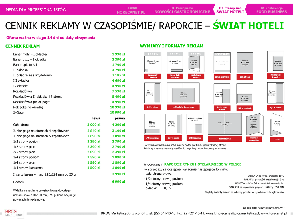 I. Portal MEDIA DLA PROFESJONALISTÓW II. Czasopismo HORECANET.PL NOWOŚCI GASTRONOMICZNE III. Czasopismo ŚWIAT HOTELI IV. Konferencja FOOD BUSINESS CENNIK REKLAMY W CZASOPIŚMIE/ RAPORCIE – ŚWIAT HOTELI Oferta ważna w ciągu 14 dni od daty otrzymania. WYMIARY I FORMATY REKLAM CENNIK REKLAM Baner mały – I okładka 1 990 zł Baner duży – I okładka 2 390 zł Baner spis treści 1 790 zł II okładka 4 790 zł II okładka ze skrzydełkiem 7 185 zł III okładka 4 690 zł IV okładka 4 990 zł Rozkładówka 7 590 zł Rozkładówka II okładka i 3 strona 8 490 zł Rozkładówka junior page 4 990 zł Nakładka na okładkę 10 990 zł Z–Gate 10 990 zł lewa prawa Cała strona 3 990 zł 4 290 zł Junior page na stronach 4 szpaltowych 2 840 zł 3 190 zł Junior page na stronach 5 szpaltowych 2 690 zł 2 890 zł 1/2 strony poziom 2 390 zł 2 790 zł 1/2 strony pion 2 390 zł 2 790 zł 2/5 strony pion 2 090 zł 2 490 zł 1/4 strony poziom 1 590 zł 1 890 zł 1/4 strony pion 1 590 zł 1 890 zł 1/4 strony klasyczna 1 590 zł 1 890 zł Inserty luzem – max. 225x292 mm do 25 g Dodatki Wklejka na reklamę całostronicową do całego nakładu max. 130x130 mm, 25 g. Cena obejmuje 3 990 zł 6 990 zł Do wymiarów reklam na spad należy dodać po 3 mm spadu z każdej strony. Reklamy w ramce nie mają spadów, ich wymiary netto brutto są takie same. W dorocznym RAPORCIE RYNKU HOTELARSKIEGO W POLSCE w sprzedaży są dostępne wyłącznie następujące formaty: - cała strona prawa - 1/2 strony prawej poziom - 1/4 strony prawej poziom - okładki: II, III, IV DOPŁATA za wybór miejsca: 15% RABAT za płatności przed emisji: 3% RABAT w zależności od wartości zamówienia. DOPŁATA za wykonanie projektu reklamy: 350 PLN Dopłaty i rabaty liczone są od ceny podstawowej reklamy lub ogłoszenia. powierzchnię reklamową. Do cen netto należy doliczyć 23% VAT. BROG Marketing Sp. z o.o. S.K, tel. (22) 571-13-10, fax (22) 521-13-11, e-mail: [email protected], www.horecanet.pl