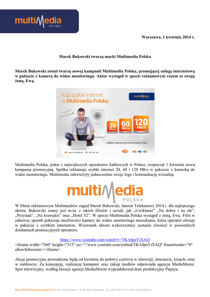Warszawa, 1 kwietnia 2014 r. Marek Bukowski twarzą marki Multimedia Polska Marek Bukowski został twarzą nowej kampanii Multimedia Polska, promującej usługę internetową w pakiecie z kamerą do wideo monitoringu. Aktor wystąpił w spocie reklamowym razem ze swoją żoną, Ewą. Multimedia Polska, jeden z największych operatorów kablowych w Polsce, rozpoczął 1 kwietnia nową kampanię promocyjną. Spółka reklamuje szybki internet 20, 60 i 120 Mb/s w pakiecie z kamerką do wideo monitoringu. Multimedia odświeżyły jednocześnie swoje logo i komunikację wizualną. W filmie reklamowym Multimediów zagrał Marek Bukowski, laureat Telekamery 2014 r. dla najlepszego aktora. Bukowski znany jest m.in. z takich filmów i seriali, jak „Uwikłanie” „Na dobre i na złe”, „Przystań”, „Na krawędzi” oraz „Hotel 52”. W spocie Multimedia Polska wystąpił z żoną, Ewą. Film w zabawny sposób pokazuje możliwości kamery do wideo monitoringu mieszkania, którą operator oferuje w pakiecie z szybkim internetem. Wizerunek aktora wykorzystany zostanie również w pozostałych działaniach promocyjnych operatora. https://www.youtube.com/watch?v=TKAfpnYiXAQ <iframe width="560" height="315" src="//www.youtube.com/embed/TKAfpnYiXAQ" frameborder="0" allowfullscreen></iframe> Akcje promocyjne prowadzone będą od kwietnia do połowy czerwca w telewizji, internecie, kinach, oraz w outdoorze. Za koncepcję, realizację kampanii oraz zakup mediów odpowiada agencja MediaMocni. Spot telewizyjny, według kreacji agencji MediaMocni wyprodukował dom produkcyjny Papaya. Biuro PR Multimedia Polska S.A. / al. Jana Pawła II 19, 00-854 Warszawa, tel. (22) 553 8 611, www.multimedia.pl