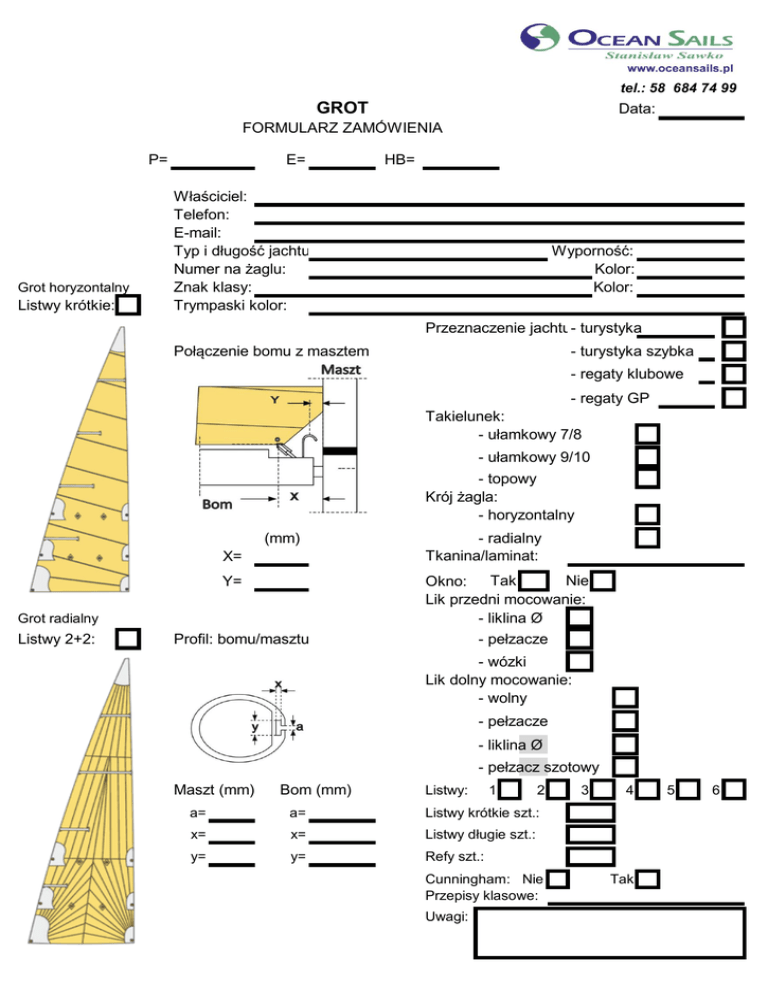 tel.: 58 684 74 99 GROT Data: FORMULARZ ZAMÓWIENIA P= Grot horyzontalny Listwy krótkie: E= HB= Właściciel: Telefon: E-mail: Typ i długość jachtu: Numer na żaglu: Znak klasy: Trympaski kolor: Wyporność: Kolor: Kolor: Przeznaczenie jachtu:- turystyka Połączenie bomu z masztem - turystyka szybka - regaty klubowe - regaty GP Takielunek: - ułamkowy 7/8 - ułamkowy 9/10 - topowy Krój żagla: - horyzontalny (mm) X= Tak Nie Okno: Lik przedni mocowanie: - liklina Ø Y= Grot radialny Listwy 2+2: - radialny Tkanina/laminat: - pełzacze Profil: bomu/masztu - wózki Lik dolny mocowanie: - wolny - pełzacze - liklina Ø - pełzacz szotowy Maszt (mm) Bom (mm) Listwy: 1 2 a= a= Listwy krótkie szt.: x= x= Listwy długie szt.: y= y= Refy szt.: Cunningham: Nie Przepisy klasowe: Uwagi: 3 4 Tak 5 6
