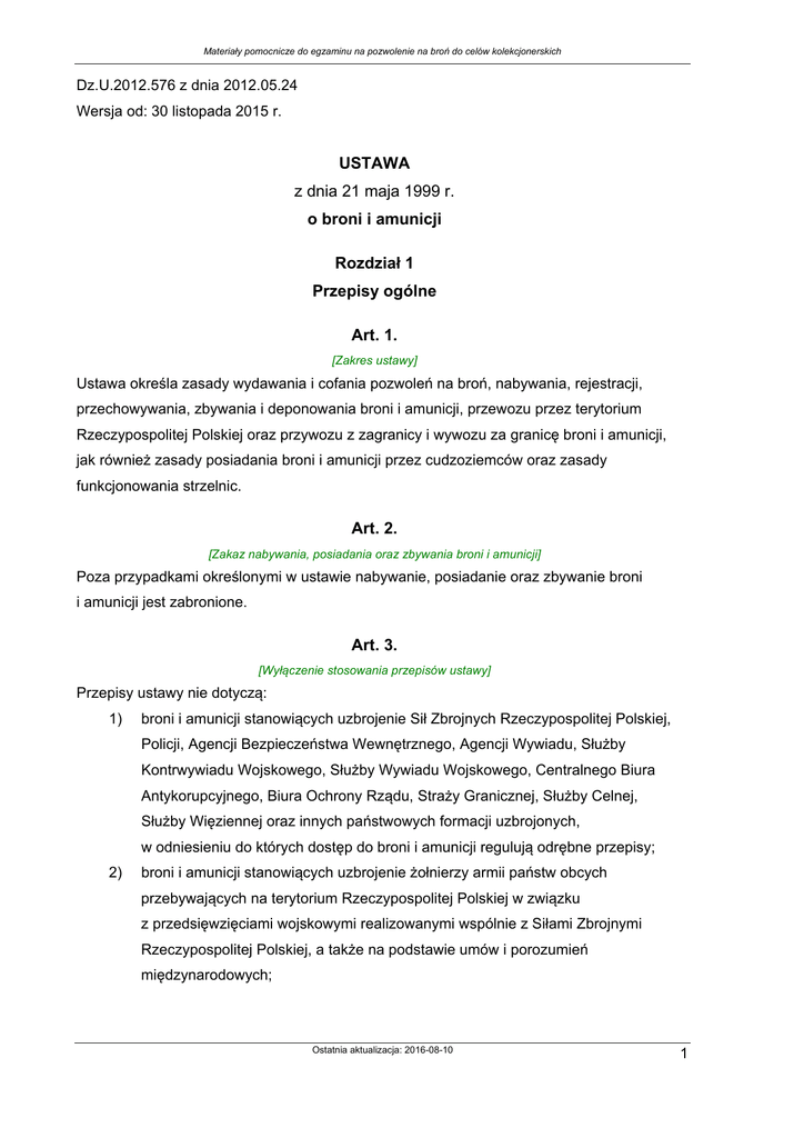 Materiały pomocnicze do egzaminu na pozwolenie na broń do celów kolekcjonerskich Dz.U.2012.576 z dnia 2012.05.24 Wersja od: 30 listopada 2015 r. USTAWA z dnia 21 maja 1999 r. o broni i amunicji Rozdział 1 Przepisy ogólne Art. 1. [Zakres ustawy] Ustawa określa zasady wydawania i cofania pozwoleń na broń, nabywania, rejestracji, przechowywania, zbywania i deponowania broni i amunicji, przewozu przez terytorium Rzeczypospolitej Polskiej oraz przywozu z zagranicy i wywozu za granicę broni i amunicji, jak również zasady posiadania broni i amunicji przez cudzoziemców oraz zasady funkcjonowania strzelnic. Art. 2. [Zakaz nabywania, posiadania oraz zbywania broni i amunicji] Poza przypadkami określonymi w ustawie nabywanie, posiadanie oraz zbywanie broni i amunicji jest zabronione. Art. 3. [Wyłączenie stosowania przepisów ustawy] Przepisy ustawy nie dotyczą: 1) broni i amunicji stanowiących uzbrojenie Sił Zbrojnych Rzeczypospolitej Polskiej, Policji, Agencji Bezpieczeństwa Wewnętrznego, Agencji Wywiadu, Służby Kontrwywiadu Wojskowego, Służby Wywiadu Wojskowego, Centralnego Biura Antykorupcyjnego, Biura Ochrony Rządu, Straży Granicznej, Służby Celnej, Służby Więziennej oraz innych państwowych formacji uzbrojonych, w odniesieniu do których dostęp do broni i amunicji regulują odrębne przepisy; 2) broni i amunicji stanowiących uzbrojenie żołnierzy armii państw obcych przebywających na terytorium Rzeczypospolitej Polskiej w związku z przedsięwzięciami wojskowymi realizowanymi wspólnie z Siłami Zbrojnymi Rzeczypospolitej Polskiej, a także na podstawie umów i porozumień międzynarodowych; Ostatnia aktualizacja: 2016-08-10 1 Materiały pomocnicze do egzaminu na pozwolenie na broń do celów kolekcjonerskich 2a) broni i amunicji stanowiących uzbrojenie funkcjonariuszy straży granicznych państw członkowskich Unii Europejskiej przebywających na terytorium Rzeczypospolitej Polskiej w związku z wykonywaniem, za zgodą właściwych organów Rzeczypospolitej Polskiej, zadań określonych w przepisach prawa Unii Europejskiej; 2b) broni i amunicji stanowiących uzbrojenie zagranicznych funkcjonariuszy biorących udział we wspólnej operacji, o której mowa w art. 2 pkt 1 ustawy z dnia 7 lutego 2014 r. o udziale zagranicznych funkcjonariuszy lub pracownik ów we wspólnych operacjach lub wspólnych działaniach ratowniczych na terytorium Rzeczypospolitej Polskiej (Dz. U. poz. 295); 3) obrotu z zagranicą bronią i amunicją, technologiami i usługami mającymi znaczenie dla obronności, bezpieczeństwa lub ważnych interesów Państwa oraz wytwarzania, przewozu przez terytorium Rzeczypospolitej Polskiej, przywozu z zagranicy i wywozu za granicę broni i amunicji w celach przemysłowych lub handlowych, a także obrotu nimi na podstawie odrębnych przepisów; 4) przemieszczania amunicji przez przedsiębiorców oraz przedsiębiorców zagranicznych, w rozumieniu ustawy z dnia 21 czerwca 2002 r. o materiałach wybuchowych przeznaczonych do u żytku cywilnego (Dz. U. Nr 117, poz. 1007, z późn. zm.). Art. 4. [Definicje] 1. Ilekroć w ustawie jest mowa o broni, należy przez to rozumieć: 1) broń palną, w tym broń bojową, myśliwską, sportową, gazową, alarmową i sygnałową; 2) broń pneumatyczną; 3) miotacze gazu obezwładniającego; 4) narzędzia i urządzenia, których używanie może zagrażać życiu lub zdrowiu: a) broń białą w postaci: – ostrzy ukrytych w przedmiotach niemających wyglądu broni, – kastetów i nunczaków, – pałek posiadających zakończenie z ciężkiego i twardego materiału lub zawierających wkładki z takiego materiału, – pałek wykonanych z drewna lub innego ciężkiego i twardego materiału, imitujących kij bejsbolowy, b) 2 broń cięciwową w postaci kusz, Ostatnia aktualizacja: 2016-08-10 Materiały pomocnicze do egzaminu na pozwolenie na broń do celów kolekcjonerskich c) przedmioty przeznaczone do obezwładniania osób za pomocą energii elektrycznej. 2. Ilekroć w ustawie jest mowa o amunicji, należy przez to rozumieć amunicję do broni palnej. 3. W rozumieniu ustawy amunicją są naboje przeznaczone do strzelania z broni palnej. 4. Ilekroć w ustawie jest mowa o państwach członkowskich Unii Europejskiej należy przez to rozumieć również państwa trzecie traktowane na równi z nimi na podstawie umowy w sprawie włączenia tych państw we wprowadzanie w życie, stosowanie i rozwój dorobku Schengen. 5. Ilekroć w ustawie jest mowa o: 1) zgodzie przewozowej należy przez to rozumieć dokument wystawiany przez zbywcę broni palnej w państwie początkowym transakcji na każdorazowe przemieszczenie broni palnej, poświadczony przez właściwe władze tego państwa, zaświadczający o wiarygodności tego zbywcy oraz o objęciu kontrolą przez to państwo tej transakcji; 2) uprzedniej zgodzie przewozowej należy przez to rozumieć dokument wystawiany przez nabywcę broni palnej w państwie docelowym transakcji na każdorazowe przemieszczenie broni palnej, poświadczony przez właściwe władze tego państwa, zaświadczający o wiarygodności tego nabywcy oraz o objęciu kontrolą przez to państwo tej transakcji. Art. 5. [Istotne części broni lub amunicji] 1. Gotowe lub obrobione istotne części broni lub amunicji uważa się za broń lub amunicję. 2. Istotnymi częściami broni palnej i pneumatycznej są: szkielet broni, baskila, lufa z komorą nabojową, zamek, komora zamkowa oraz bęben nabojowy. 3. Istotnymi częściami amunicji są: pociski wypełnione materiałami wybuchowymi, chemicznymi środkami obezwładniającymi lub zapalającymi albo innymi substancjami, których działanie zagraża życiu lub zdrowiu, spłonki inicjujące spalanie materiału miotającego i materiał miotający w postaci prochu strzelniczego. Art. 6. [Przeróbki broni] 1. Zabronione jest dokonywanie przeróbek broni zmieniających jej rodzaj, kaliber lub przeznaczenie, a w szczególności przerabianie broni przystosowanej