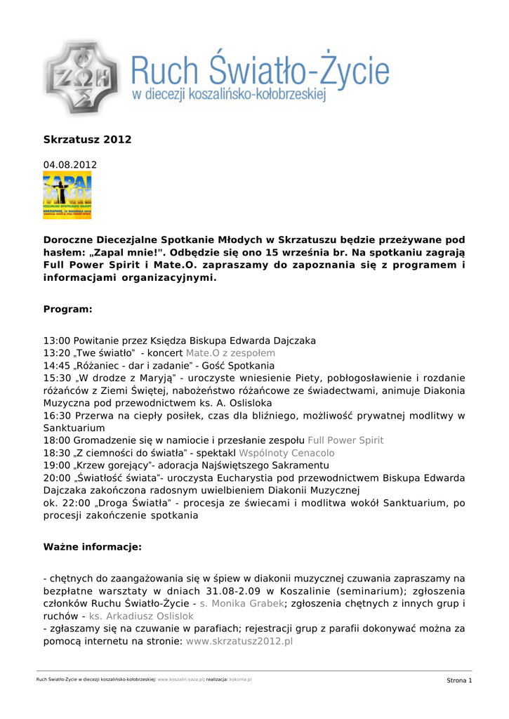 Skrzatusz 2012 04.08.2012 Doroczne Diecezjalne Spotkanie Młodych w Skrzatuszu będzie przeżywane pod hasłem: „Zapal mnie!”. Odbędzie się ono 15 września br. Na spotkaniu zagrają Full Power Spirit i Mate.O. zapraszamy do zapoznania się z programem i informacjami organizacyjnymi. Program: 13:00 Powitanie przez Księdza Biskupa Edwarda Dajczaka 13:20 „Twe światło” - koncert Mate.O z zespołem 14:45 „Różaniec - dar i zadanie” - Gość Spotkania 15:30 „W drodze z Maryją” - uroczyste wniesienie Piety, pobłogosławienie i rozdanie różańców z Ziemi Świętej, nabożeństwo różańcowe ze świadectwami, animuje Diakonia Muzyczna pod przewodnictwem ks. A. Oslisloka 16:30 Przerwa na ciepły posiłek, czas dla bliźniego, możliwość prywatnej modlitwy w Sanktuarium 18:00 Gromadzenie się w namiocie i przesłanie zespołu Full Power Spirit 18:30 „Z ciemności do światła” - spektakl Wspólnoty Cenacolo 19:00 „Krzew gorejący”- adoracja Najświętszego Sakramentu 20:00 „Światłość świata”- uroczysta Eucharystia pod przewodnictwem Biskupa Edwarda Dajczaka zakończona radosnym uwielbieniem Diakonii Muzycznej ok. 22:00 „Droga Światła” - procesja ze świecami i modlitwa wokół Sanktuarium, po procesji zakończenie spotkania Ważne informacje: - chętnych do zaangażowania się w śpiew w diakonii muzycznej czuwania zapraszamy na bezpłatne warsztaty w dniach 31.08-2.09 w Koszalinie (seminarium); zgłoszenia członków Ruchu Światło-Życie - s. Monika Grabek; zgłoszenia chętnych z innych grup i ruchów - ks. Arkadiusz Oslislok - zgłaszamy się na czuwanie w parafiach; rejestracji grup z parafii dokonywać można za pomocą internetu na stronie: www.skrzatusz2012.pl Ruch Światło-Życie w diecezji koszalińsko-kołobrzeskiej: www.koszalin.oaza.pl; realizacja: kokoma.pl Strona 1 - przyjazd grup do Skrzatusza jest możliwy od godz. 11:00 - dzień wcześniej tj. 14 września 2012 r. do godz. 17:00 w Skrzatuszu gromadzą się organizatorzy, grupy porządkowe i służby na wspólnej odprawie i czuwaniu - nasze Spotkanie (dzięki życzliwości Radia Maryja) po raz kolejny odbywać się będzie w hali namiotowej - młodzież proszona jest o zabranie ze sobą karimaty do siedzenia oraz kieszonkowego; jest planowany darmowy posiłek dla wszystkich uczestników - w specjalnym Punkcie Informacji dostępne będą książki, bluzy, koszulki (pamiątki Spotkania) - kapłanów celebrujących wieczorną Eucharystię prosimy o zabranie ze sobą alby i białej stuły. Zaproszenie wideo Ruch Światło-Życie w diecezji koszalińsko-kołobrzeskiej: www.koszalin.oaza.pl; realizacja: kokoma.pl Strona 2