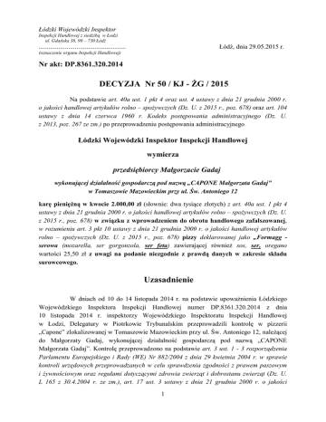 Łódzki Wojewódzki Inspektor Inspekcji Handlowej z siedzibą w Łodzi ul. Gdańska 38, 90 – 730 Łódź Łódź, dnia 29.05.2015 r. ..................................................... (oznaczenie organu Inspekcji Handlowej) Nr akt: DP.8361.320.2014 DECYZJA Nr 50 / KJ - ŻG / 2015 Na podstawie art. 40a ust. 1 pkt 4 oraz ust. 4 ustawy z dnia 21 grudnia 2000 r. o jakości handlowej artykułów rolno – spożywczych (Dz. U. z 2015 r., poz. 678) oraz art. 104 ustawy z dnia 14 czerwca 1960 r. Kodeks postępowania administracyjnego (Dz. U. z 2013, poz. 267 ze zm.) po przeprowadzeniu postępowania administracyjnego Łódzki Wojewódzki Inspektor Inspekcji Handlowej wymierza przedsiębiorcy Małgorzacie Gadaj wykonującej działalność gospodarczą pod nazwą „CAPONE Małgorzata Gadaj” w Tomaszowie Mazowieckim przy ul. Św. Antoniego 12 karę pieniężną w kwocie 2.000,00 zł (słownie: dwa tysiące złotych) z art. 40a ust. 1 pkt 4 ustawy z dnia 21 grudnia 2000 r. o jakości handlowej artykułów rolno – spożywczych (Dz. U. z 2015 r., poz. 678) w związku z wprowadzeniem do obrotu handlowego zafałszowanej, w rozumieniu art. 3 pkt 10 ustawy z dnia 21 grudnia 2000 r. o jakości handlowej artykułów rolno – spożywczych (Dz. U. z 2015 r., poz. 678) pizzy deklarowanej jako „Formagg serowa (mozarella, ser gorgonzola, ser feta) zawierającej również sos, ser, oregano wartości 25,50 zł z uwagi na podanie niezgodnie z prawdą danych w zakresie składu surowcowego. Uzasadnienie W dniach od 10 do 14 listopada 2014 r. na podstawie upoważnienia Łódzkiego Wojewódzkiego Inspektora Inspekcji Handlowej numer DP.8361.320.2014 z dnia 10 listopada 2014 r. inspektorzy Wojewódzkiego Inspektoratu Inspekcji Handlowej w Łodzi, Delegatury w Piotrkowie Trybunalskim przeprowadzili kontrolę w pizzerii „Capone” zlokalizowanej w Tomaszowie Mazowieckim przy ul. Św. Antoniego 12, należącej do Małgorzaty Gadaj, wykonującej działalność gospodarczą pod nazwą „CAPONE Małgorzata Gadaj”. Kontrolę przeprowadzono na podstawie art. 3 ust. 1 - 3 rozporządzenia Parlamentu Europejskiego i Rady (WE) Nr 882/2004 z dnia 29 kwietnia 2004 r. w sprawie kontroli urzędowych przeprowadzanych w celu sprawdzenia zgodności z prawem paszowym i żywnościowym oraz regułami dotyczącymi zdrowia zwierząt i dobrostanu zwierząt (Dz. U. L 165 z 30.4.2004 r. ze zm.), art. 17 ust. 3 ustawy z dnia 21 grudnia 2000 r. o jakości 1 handlowej artykułów rolno-spożywczych (Dz. U. z 2014 r., poz. 669 ze zm.), art. 24 ust. 1 rozporządzenia Parlamentu Europejskiego i Rady (WE) nr 1935/2004 z dnia 27 października 2004 r. w sprawie materiałów i wyrobów przeznaczonych do kontaktu z żywnością oraz uchylającego dyrektywy 80/590/EWG (Dz. U. z 27.10.2004 s. 4 ze zm.) w związku z art. 3 ust. 1 pkt 6 oraz art. 3 ust. 1 pkt 1, 2 ustawy z dnia 15 grudnia 2000 r. o Inspekcji Handlowej (Dz. U. z 2014 r., poz. 148 ze zm.) w obecności przedsiębiorcy Małgorzaty Gadaj. Celem sprawdzenia prawidłowości oznakowania potraw oraz rzetelności przekazywanych informacji o danym produkcie, inspektorzy występując w charakterze nabywców zakupili pizzę w cenie 25,50 zł deklarowaną w miejscu sprzedaży (karta menu) jako „Formagg - serowa (mozarella, ser gorgonzola, ser feta). Ponadto w karcie menu zadeklarowano, że „każda pizza (wyłączając 41) zawiera sos, ser, oregano”, zgodnie z tą deklaracją również pizza zakupiona przez inspektorów winna zawierać te składniki. Przedmiotowa potrawa została przygotowana na zamówienie przez pizzermena (…) w dniu 10 listopada 2014 r. w pizzerii „Capone” zlokalizowanej w Tomaszowie Mazowieckim przy ul. Św. Antoniego 12, należącej do Małgorzaty Gadaj, wykonującej działalność gospodarczą pod nazwą „CAPONE Małgorzata Gadaj”. W trakcie kontroli stwierdzono, że na stanie pizzerii znajdował się ser mozzarella, ser gorgonzola, produkt seropodobny „CASHCAVAL do pizzy” wyprodukowany przez Spółdzielnię Mleczarską „MLEKOVITA”, ul. Ludowa 122, 18-200 Wysokie Mazowieckie, Oddział w Sanoku, zwany dalej „produktem seropodobnym” oraz ser sałatkowo-kanapkowy tłusty miękki solankowy „Favita” wyprodukowany przez Spółdzielnię Mleczarską „MLEKOVITA”, ul. Ludowa 122, 18-200 Wysokie Mazowieckie, zwany dalej „serem Favita”. Na stanie pizzerii nie było natomiast sera Feta. W prowadzonym postępowaniu wyjaśniającym ustalono, że do przygotowania zamówionej przez inspektorów pizzy poza serami mozzarella i gorgonzola użyto także produktu seropdobnego zamiast dodatkowo deklarowanego sera oraz sera Favita zamiast deklarowanego sera Feta (oświadczenie pizzermena … z dnia 10 listopada 2014r.). Inspektorzy nie zostali poinformowani o użyciu innych składników niż deklarowano w oznakowaniu, przez co zostali wprowadzeni w błąd co do charakterystyki środka spożywczego, w tym jego składu i właściwości w rozumieniu obowiązującego w dniu kontroli (10 listopada 2014 r.) art. 46 ust. 1 lit. a ustawy z dnia 25 sierpnia 2006 r. o bezpieczeństwie żywności i żywienia (Dz. U. z 2010 nr 136, poz. 914 ze zm.), zwanej dalej „ustawą o bezpieczeństwie żywności i żywienia” przywołanego w art. 6 ust. 2 ustawy z dnia 21 grudnia 2000 r. o jakości handlowej artykułów rolno – spożywczych (Dz. U. z 2014 r. poz. 669 ze zm.), zwanej dalej „ustawą o jakości” [od 13 grudnia 2014 r. w rozumieniu art. 7 ust. 1 lit. a rozporządzenia Parlamentu Europejskiego i Rady (UE) nr 1169/2011 z dnia 25 października 2011 r. w sprawie przekazywania konsumentom informacji na temat żywności, zmiany rozporządzeń Parlamentu Europejskiego i Rady (WE) nr 1924/2006 i (WE) nr 1925/2006 oraz uchylenia dyrektywy Komisji 87/250/EWG, dyrektywy Rady 90/496/EWG, dyrektywy Komisji 1999/10/WE, dyrektywy 2000/13/WE Parlamentu Europejskiego i Rady, dyrektyw Komisji 2002/67/WE i 2008/5/WE oraz rozporządzenia Komisji (WE) nr 608/2004 (Dz. U. UE. L