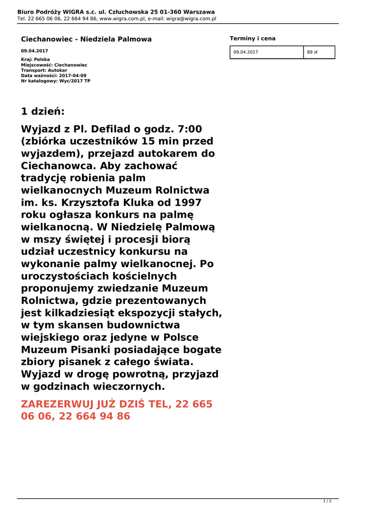 Biuro Podróży WIGRA s.c. ul. Człuchowska 25 01-360 Warszawa Tel. 22 665 06 06, 22 664 94 86, www.wigra.com.pl, e-mail: [email protected] Ciechanowiec - Niedziela Palmowa 09.04.2017 Terminy i cena 09.04.2017 89 zł Kraj: Polska Miejscowość: Ciechanowiec Transport: Autokar Data ważności: 2017-04-09 Nr katalogowy: Wyc/2017 TP 1 dzień: Wyjazd z Pl. Defilad o godz. 7:00 (zbiórka uczestników 15 min przed wyjazdem), przejazd autokarem do Ciechanowca. Aby zachować tradycję robienia palm wielkanocnych Muzeum Rolnictwa im. ks. Krzysztofa Kluka od 1997 roku ogłasza konkurs na palmę wielkanocną. W Niedzielę Palmową w mszy świętej i procesji biorą udział uczestnicy konkursu na wykonanie palmy wielkanocnej. Po uroczystościach kościelnych proponujemy zwiedzanie Muzeum Rolnictwa, gdzie prezentowanych jest kilkadziesiąt ekspozycji stałych, w tym skansen budownictwa wiejskiego oraz jedyne w Polsce Muzeum Pisanki posiadające bogate zbiory pisanek z całego świata. Wyjazd w drogę powrotną, przyjazd w godzinach wieczornych. ZAREZERWUJ JUŻ DZIŚ TEL, 22 665 06 06, 22 664 94 86 1/2 Biuro Podróży WIGRA s.c. ul. Człuchowska 25 01-360 Warszawa Tel. 22 665 06 06, 22 664 94 86, www.wigra.com.pl, e-mail: [email protected] Cena zawiera: przejazd autokarem - standard turystyczny (dostosowany do wielkości grupy), opieka pilota, ubezpieczenie NNW, podatek VATmarża. Cena nie zawiera: biletów wstępu do zwiedzanych obiektów oraz kosztów programowych. Uwagi: Zalecamy wykupienie ubezpieczenia kosztów rezygnacji (koszt 3,5 % ceny wyjazdu). Kolejność realizacji punktów programu może ulec zmianie lub odwróceniu. 2/2 Powered by TCPDF (www.tcpdf.org)