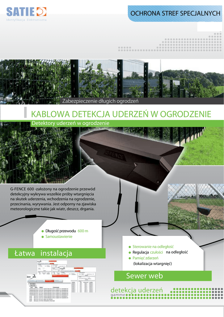 OCHRONA STREF SPECJALNYCH Zabezpieczenie długich ogrodzeń KABLOWA DETEKCJA UDERZEŃ W OGRODZENIE Detektory uderzeń w ogrodzenie G-FENCE 600 -założony na ogrodzenie przewód detekcyjny wykrywa wszelkie próby wtargnięcia na skutek uderzenia, wchodzenia na ogrodzenie, przecinania, wyrywania. Jest odporny na zjawiska meteorologiczne takie jak wiatr, deszcz, drgania. clôture détectrice gamme infrarouge gamme Długość przewodu 600 m Samoustawienie Łatwa instalacja analyse d’images gamme Sterowanie na odległość na odległość Pamięć zdarzeń (lokalizacja wtargnięć) hyperfréquence Regulacja czułości gamme double technologie gamme Sewer web detekcja uderzeń gamme détection enterrée gamme OCHRONA STREF SPECJALNYCH Ogrodzenie otwarte zestaw 100m UG zakładany wewnątrz lub na zewnątrz pomieszczenia 3 styki alarmowe (2 intruzi + 1 techniczny) Do 400m dodatkowego kabla w 12 VDC 1 czujnik na ściance 100 m 100 m 100 m 100 m Zasada działania 100 m 100 m Zestaw nr kat: 40670201 Jednostka sterująca G-FENCE 600 - 3 wyjścia alarmowe - Instalacja zewnętrzna / wewnętrzna nr kat: 40670202 Przewód detekcyjny 100m G-FENCE 600 - 40 czujników - kolor zielony RAL 6500 nr kat: 40670204 UR/UT G-FENCE 600 nr kat: 81100081 Zasilacz 110/230VAC 50/60Hz / 13,6VDC 2,2A w obudowie szczelnej IP56 nr kat: 35145000 Baterie 12V ; 1,2Ah na kolumnę i zasilanie nr kat: 93375007 Zaciski przewodu (w torebce 1000szt. ) DANE TECHNICZNE Zasilanie NC221-FR V1.0_04.13 KABLOWA DETEKCJA UDERZEŃ W ORODZENIE Jednostka steruj ąca zarządza 600metrowym przewodem detekcyjnym podzielonym na 2 odcinki maximum po 300m każdy. DU2 12 VDC Wyjścia alarmowe 2 alarmy wtargnięcia ( po 1 na strefę) + 1 alarm techniczny Temperatura pracy Od -40°C do + 70°C Zgodność elektromagnetyczna Zgodny z normami europejskimi (CE) Sposób instalacji 1 czujnik na ściance - do 400m dodatkowego przewodu (na strefę - zonę) - Samoustawienie - Regulacja czułości na odległość lub bezpośrednio poprzez czujnik/strefę bez pro. Sterowanie na odległość Serwer web zintegrowany - Pamięć 1000 zdarzeń - - 02-820 Warszawa, ul. Łączyny 3, tel. 22 462 30 86, fax: 22 314 69 50; kom: 509 849 791 www.satie.pl, [email protected] Ogrodzenie zamknięte zestaw 1500m OCHRONA STREF SPECJALNYCH JEDNOSTKA STERUJĄCA UG Energia Słoneczna Zintegrowane baterie słoneczne Algorytm detekcji intruza Każdy UG zabezpiecza 200m przewodu Każdy UG posiada 2 dodatkowe wejścia AUX do alarmów zewnętrznych Łatwe tworzenie stref detekcji do 128 stref Pamięć zdarzeń alarmowych aż do 1 000 zdarzeń Wizualizacja i lokalizacja intruzów JEDNOSTKA ZARZĄDZAJĄCA MAXIBUS III Maxibus III G-Fence MAXIBUS III G-Fence posiada przyłącze do sieci Ethernet. jak i na odległość dzięki serwerowi web. bez dodatkowego oprogramowania PRZEWÓD DETEKCYJNY aż do 136 wyjść Każdy czujnik umieszczony na kablu przetwarza otzrymany sygnał według własnego algorytmu zapewniając na całej długości przewodu rodzaj sztucznej inteligencji Samoustawienie - regulacja czujników - automatyczne synchronizowanie ze wspornikiem. Zabezpieczony dostęp poprzez hasło ŁĄCZE UR / UT Proste podłączenie : elektryczne standardowe Przewód wytrzymały na zginanie i rwanie Sztuczna inteligencja Wzdłuż przewodu PRZYŁĄCZE UR ŁĄCZE KOŃCOWE UT 100 m 100 m Jednostka sterująca UG 40670002 100 m 100 m Ethernet MAXIBUS III Przewód detekcyjny 100 m 40670008 40670001 100 m 100 m 100 m Zestaw nr kat: 40670201 40670002 Jednostka sterująca G-FENCE UG G-FENCE600 -23wyjścia wyjściaalarmowe, alarmowe -zintegrowane Instalacja zewnętrzna baterie słoneczne, / wewnętrzna 12VDC, RS485 do MAXIBUS nr kat: 40670202 40670001 Przewód detekcyjny 100m G-FENCE 600 - 40 czujników - kolor zielony RAL 6500 nr kat: 40670204 40670003 UR/UT G-FENCE 600 Jednostka zarządzająca MAXIBUS III, 8 wyjść przekaźnikowych, 1-8 kart rozszerzeń,12VDC nr kat: 40670008 nr kat: 35588419 nr kat: 35209301 Karty rozszerzeń 8 wyjść przekaźnika Ochronnik przeciwprzepięciowy + zestaw zasilający 81100081 + baterie 35145000 + zaciski kabla 93375007 DANE TECHNICZNE 12 VDC słoneczne w każdym UG Baterie NC221-FR V1.0_04.13 Zasilanie Informacja o ALARMIE Informacja o ALARMIE 2 alarmy wtargnięcia Jednostka sterująca UG samozabezp/brak zasilania/wejściaAUX1/AUX2 Od -40°C do + 70°C Zgodność elektromagnetyczna Wyjścia alarmowe Temperatura pracy Sposób instalacji 136 przekaźników/RS485/IP modbus TCP Zgodność elektromagnetyczna Zgodny z normami europejskimi (CE) 16/100m/200m/3200m Strefa - zona detekcji 1 wtargnięcie/strefę System nacięcie obwodu - Od -40°C do + 70°C Maks.ilość UG/dł.kabla/dł.zabezp/dł.całk. rzeń - KABLOWA DETEKCJA UDERZEŃ W ORODZENIE UT / UR 40670003 Prosta instalacja i utrzymanie Lokalizacja przecięcia przewodu poniżej 3m - 02-820 Warszawa, ul. Łączyny 3, tel. 22 462 30 86, fax: 22 314 69 50; kom: 509 849 791 www.satie.pl, [email protected] BP3